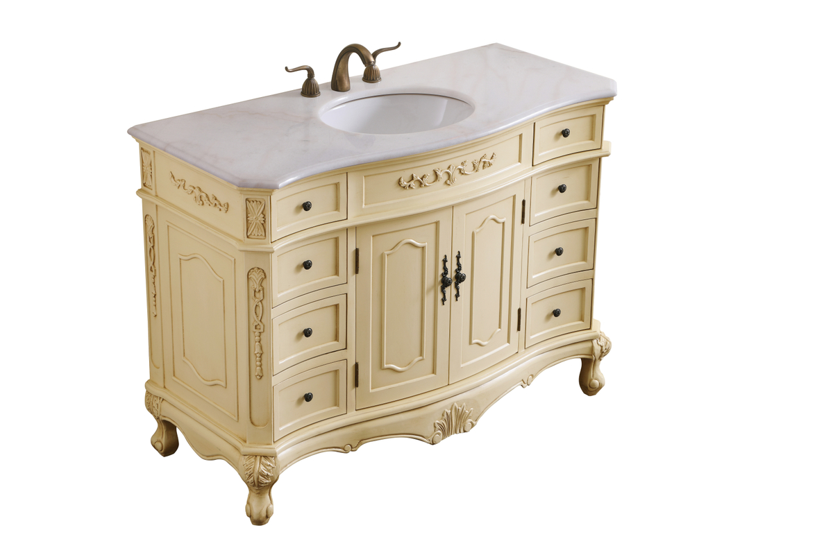 This superb balance of timeless tradition and opulent beauty in a marble-topped vanity will certainly enhance the aesthetics of any home or office bathroom! Featuring a white marble countertop "occasionally with light brown veining, complimenting the hand painted light tan finished cabinet oval white porcelain under mount sink, 2 doors and 8 drawers, as well as antique bronze finish door knobs, a superbly carved floral design, stands on stylishly carved solid wood French scroll feet. A truly rich statement of luxury! Measurements: 36" H x 48" W x 21" D, fully assembled.