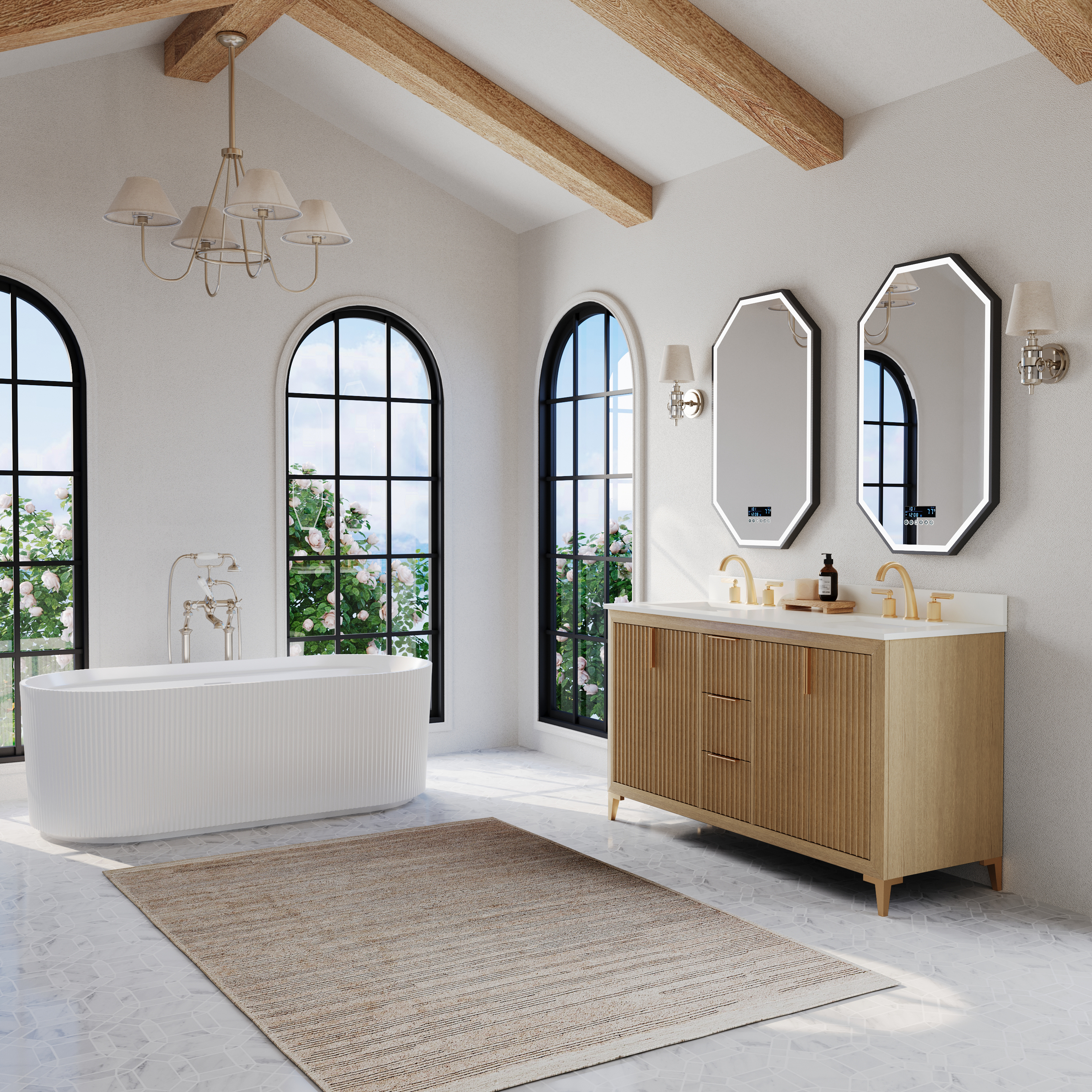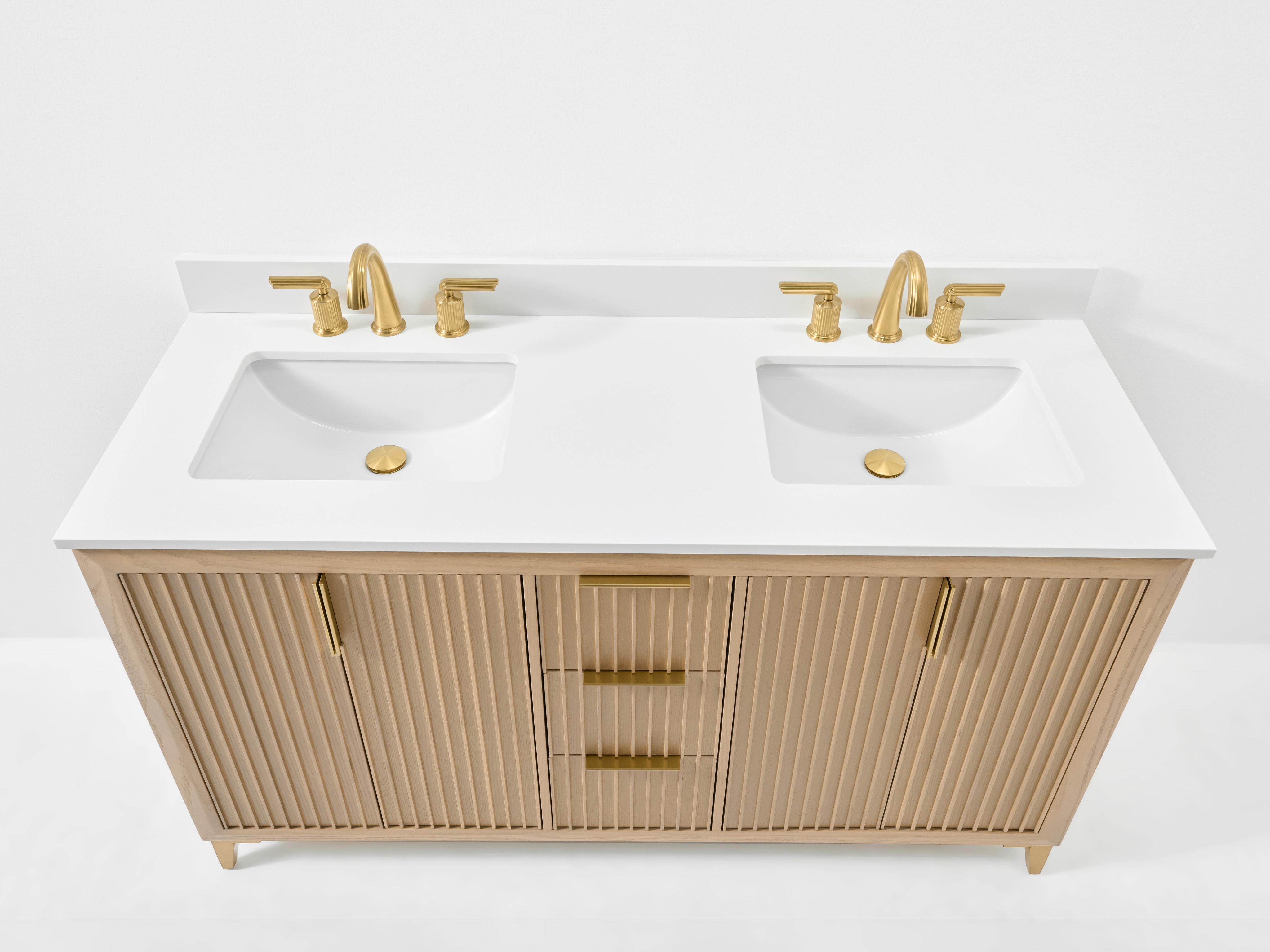 Elevate your bathroom design with the Collection bath vanity, where natural warmth meets refined craftsmanship. Featuring a stunning oak finish with vertical slat detailing, this vanity combines timeless elegance with modern functionality. The sleek white quartz countertop contrasts beautifully with the warm wood tones, while the gold-toned hardware and faucets add a touch of luxury. Behind the stylish doors and drawers, you'll find ample storage for all your bathroom essentials. The Collection is the perfect choice for those seeking a blend of contemporary style and enduring quality.