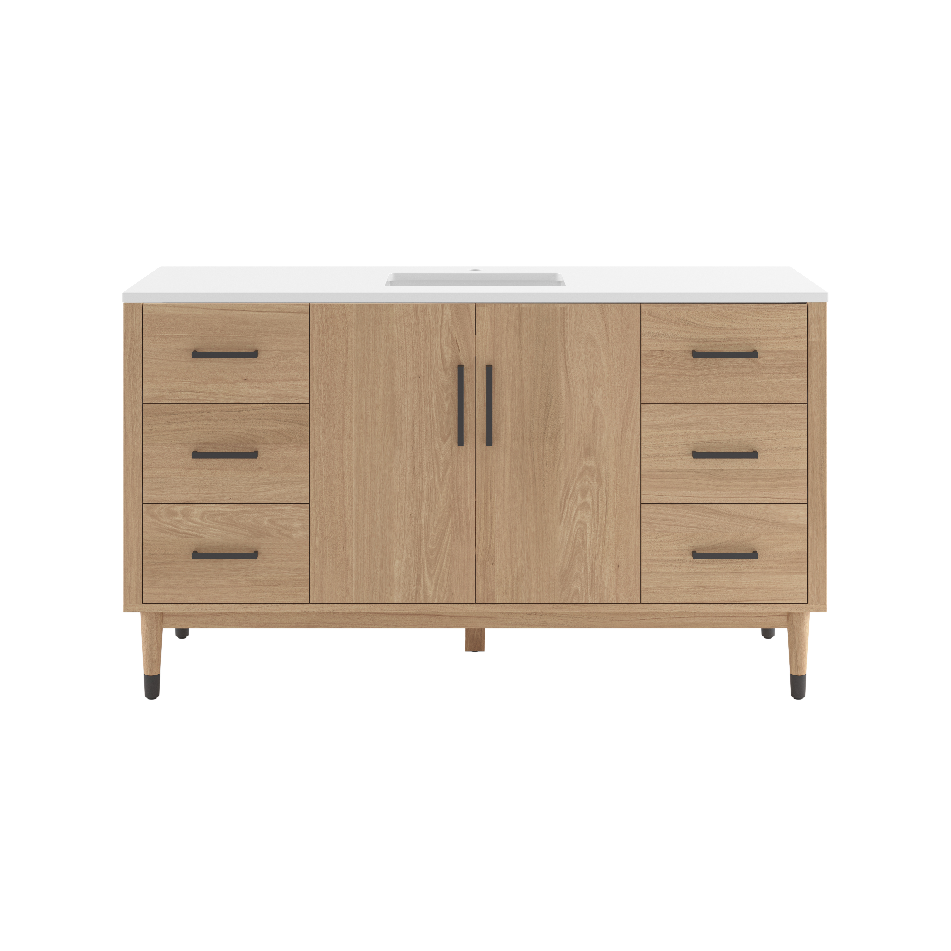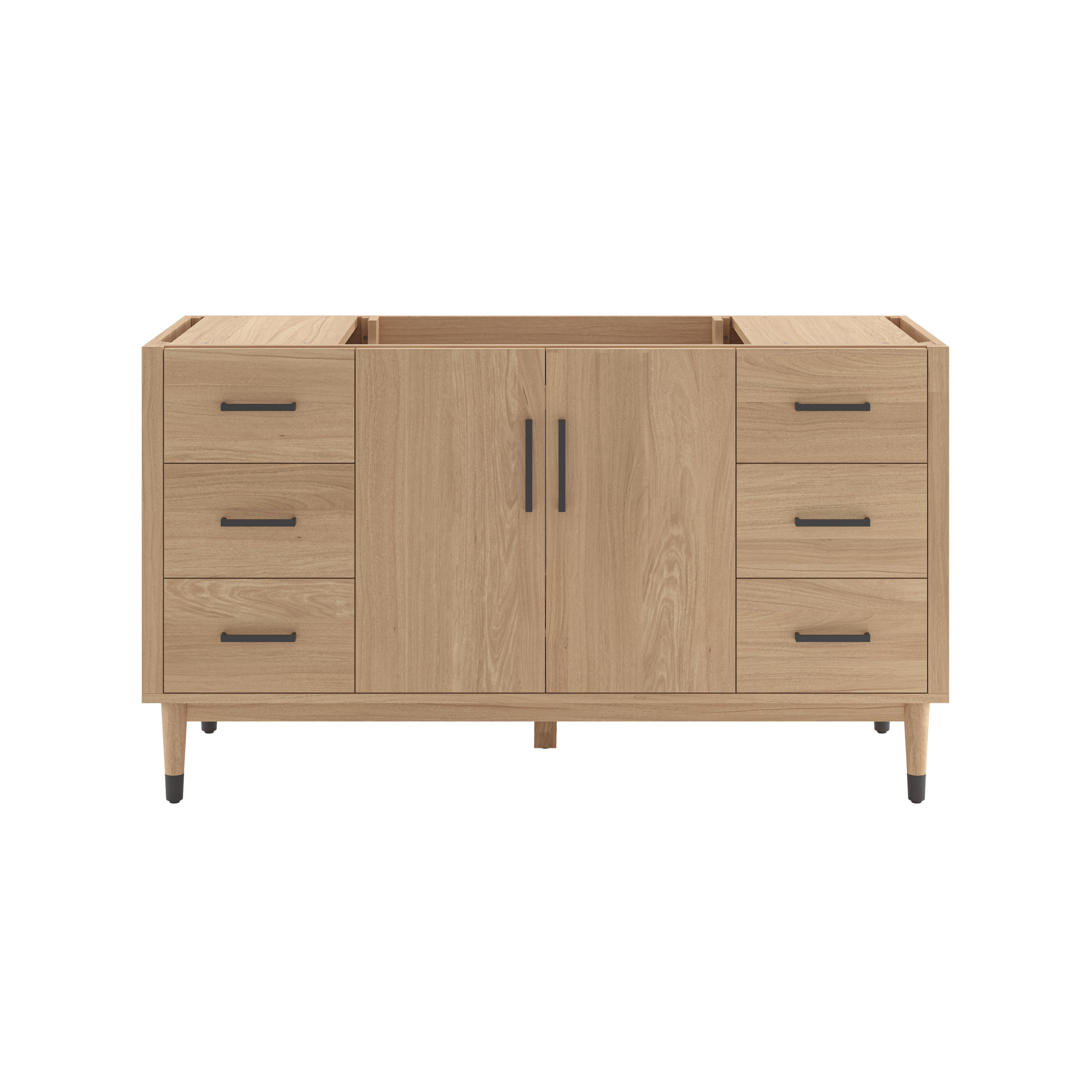 Experience the perfect blend of style, functionality, and innovation with the Mid-Century Modern Vanities. Available in two stunning finishes?Vanilla Oak, a white oak veneer with a creamy, natural hue, and Mocha Birch, a birch veneer with a rich mocha stain?these vanities elevate any bathroom setting with their sophisticated design and practical features. Crafted with a solid wood frame, the vanities are designed for durability and stability. The vanity features a pull-out power bar equipped with standard outlets and USB ports, as well as dedicated storage for hot hair tools, making your daily routine more convenient. The soft-close drawers provide ample space for organizing all your bathroom essentials, while the additional storage options help keep your space neat and clutter-free. With its sleek lines and minimalist aesthetic, the collection brings the essence of mid-century modern design to your bathroom, creating an aspirational and high-end atmosphere.