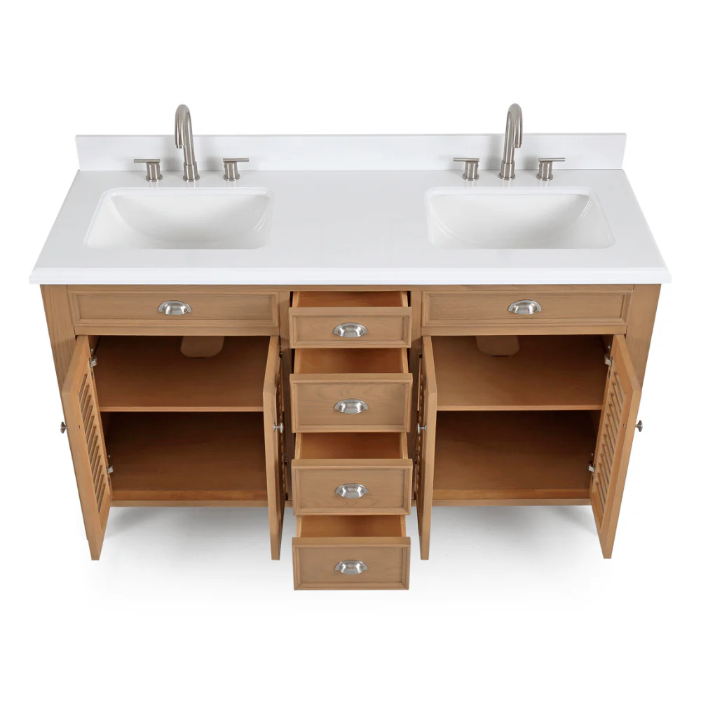 The 60 Inch Contemporary Style Double Sink Wood Design Adelina Bathroom Vanity brings a blend of traditional charm and modern functionality to any bathroom. With a trendy wood finish and sturdy solid birch wood construction, this vanity is designed to last. Its elegant white quartz top and stylish Italian Carrara Top with an undermount sink and three pre-drilled faucet holes provide both style and versatility. The shuttle-style door decor, soft-closing mechanism, and brushed nickel hardware add sophistication to this contemporary piece, making it a stylish yet practical choice for any bathroom.