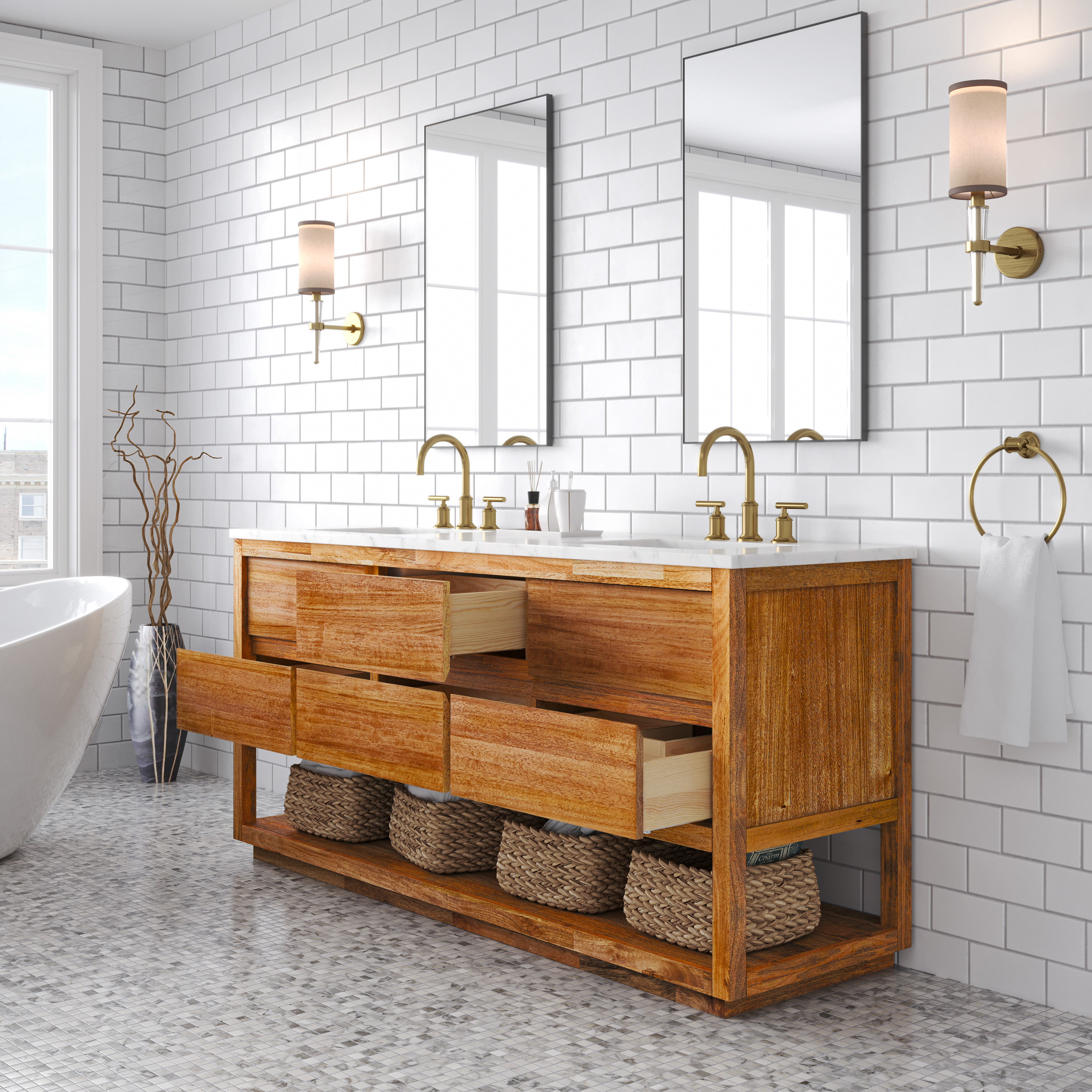 72 in. Double Sink Bath Vanity in Mango Wood with Carrara White Marble Top
