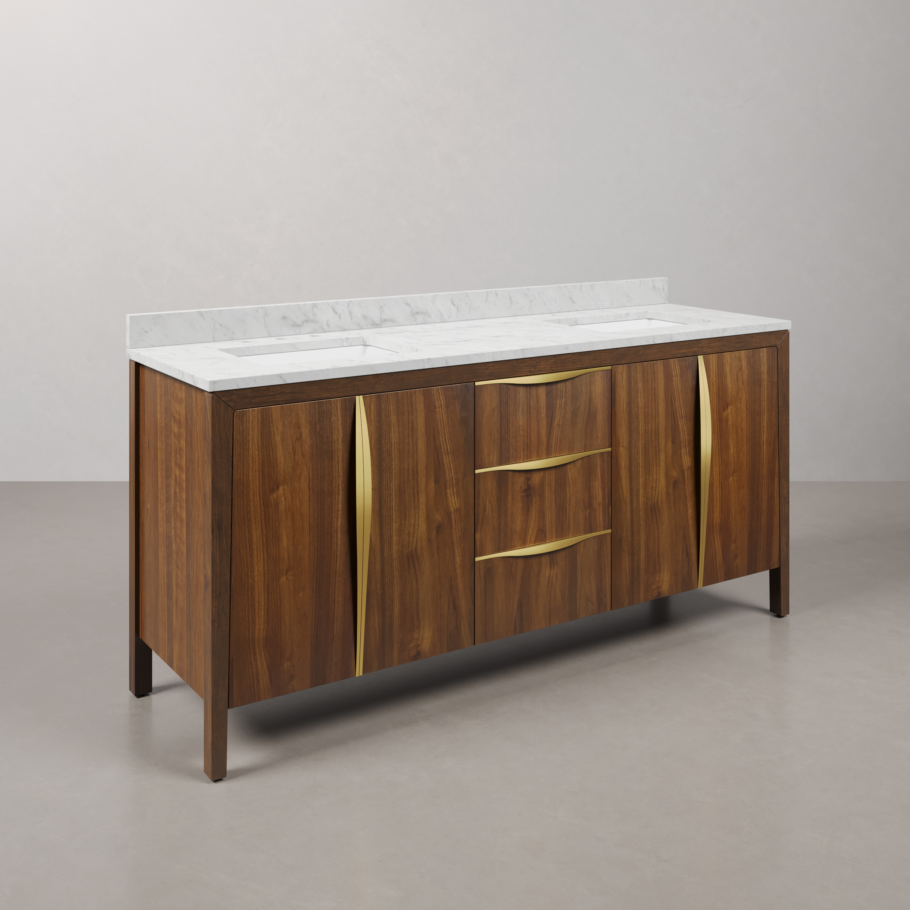 72 in. Double Sink Bath Vanity in Noir Juglans with Carrara White Marble Top with White Basin and Linen Cabinet Option