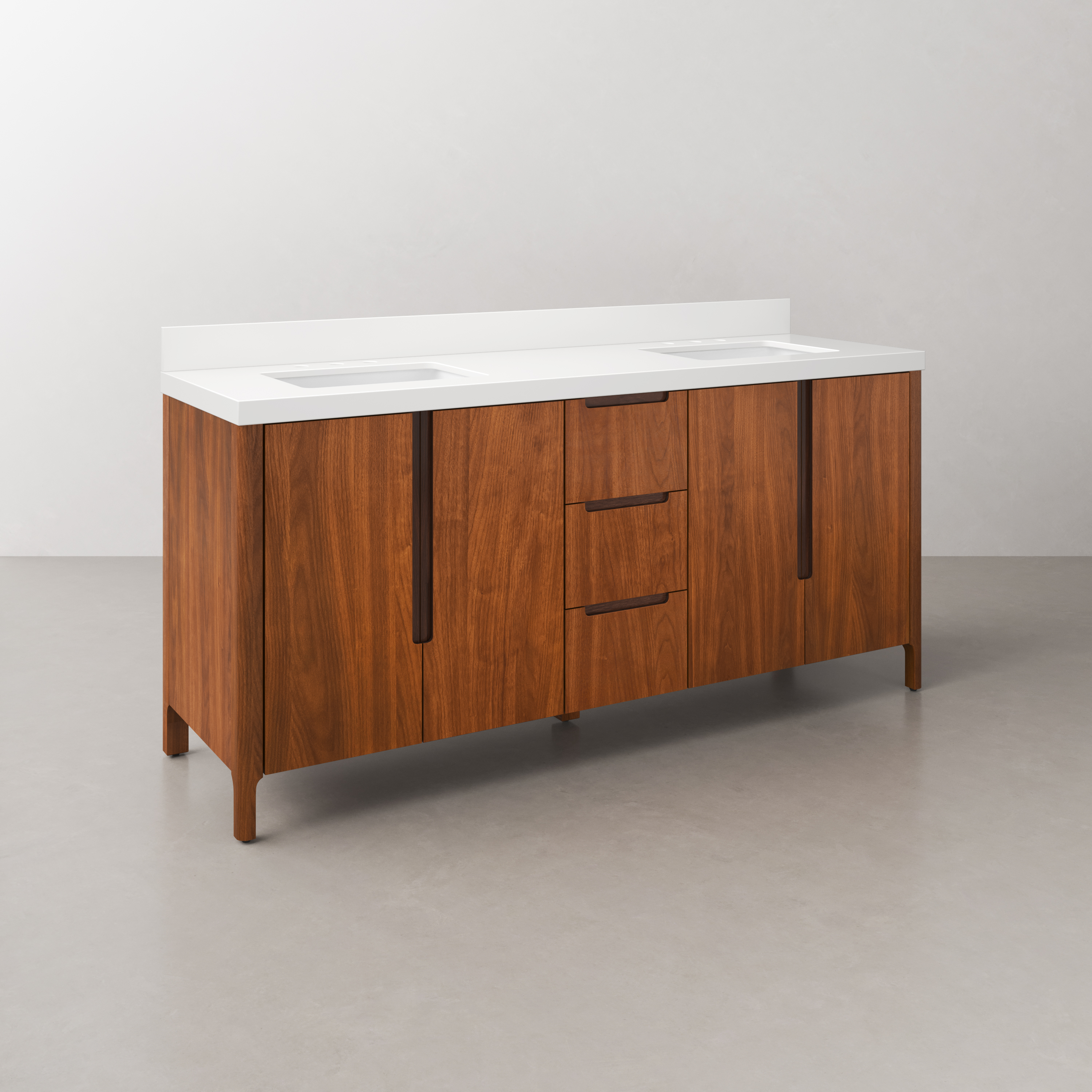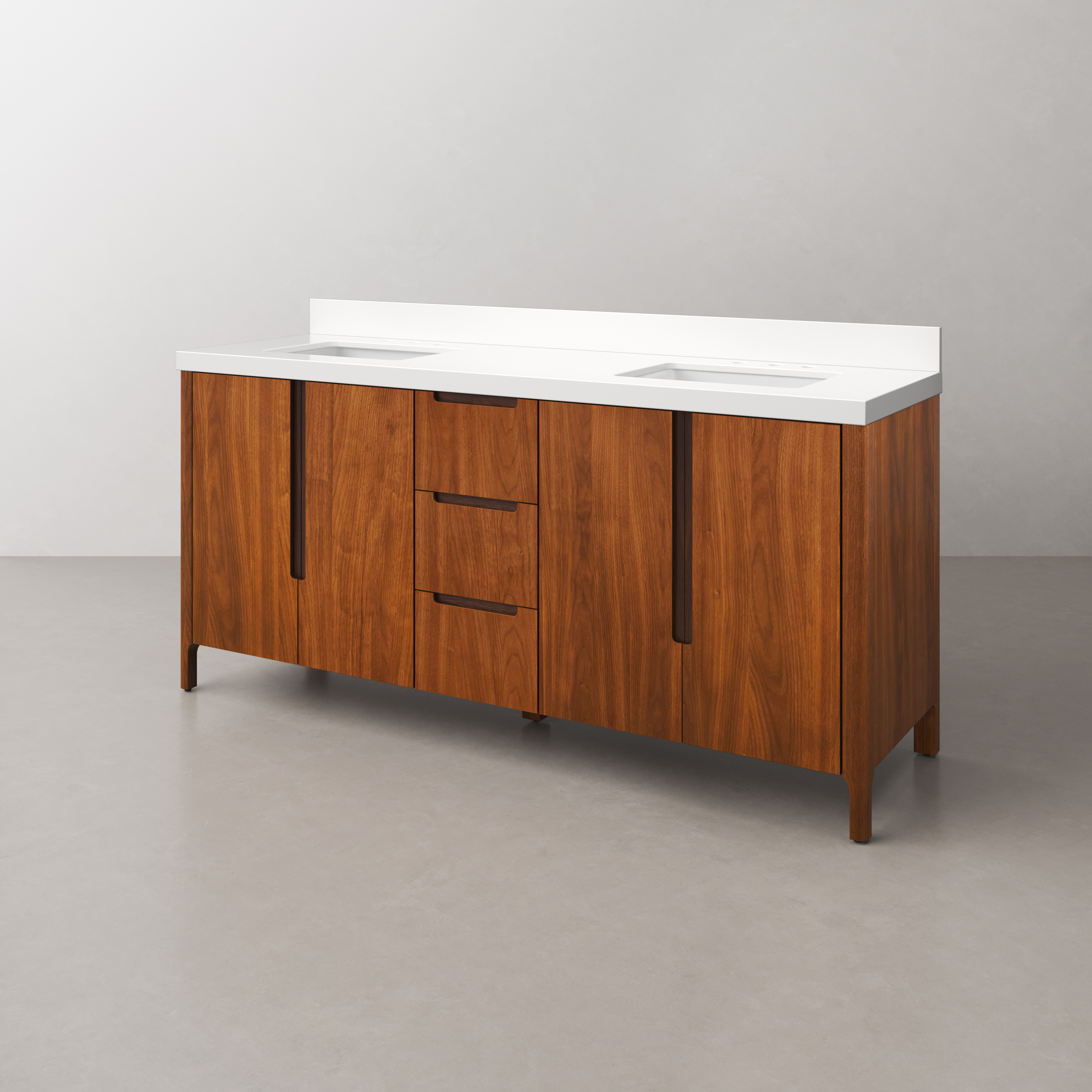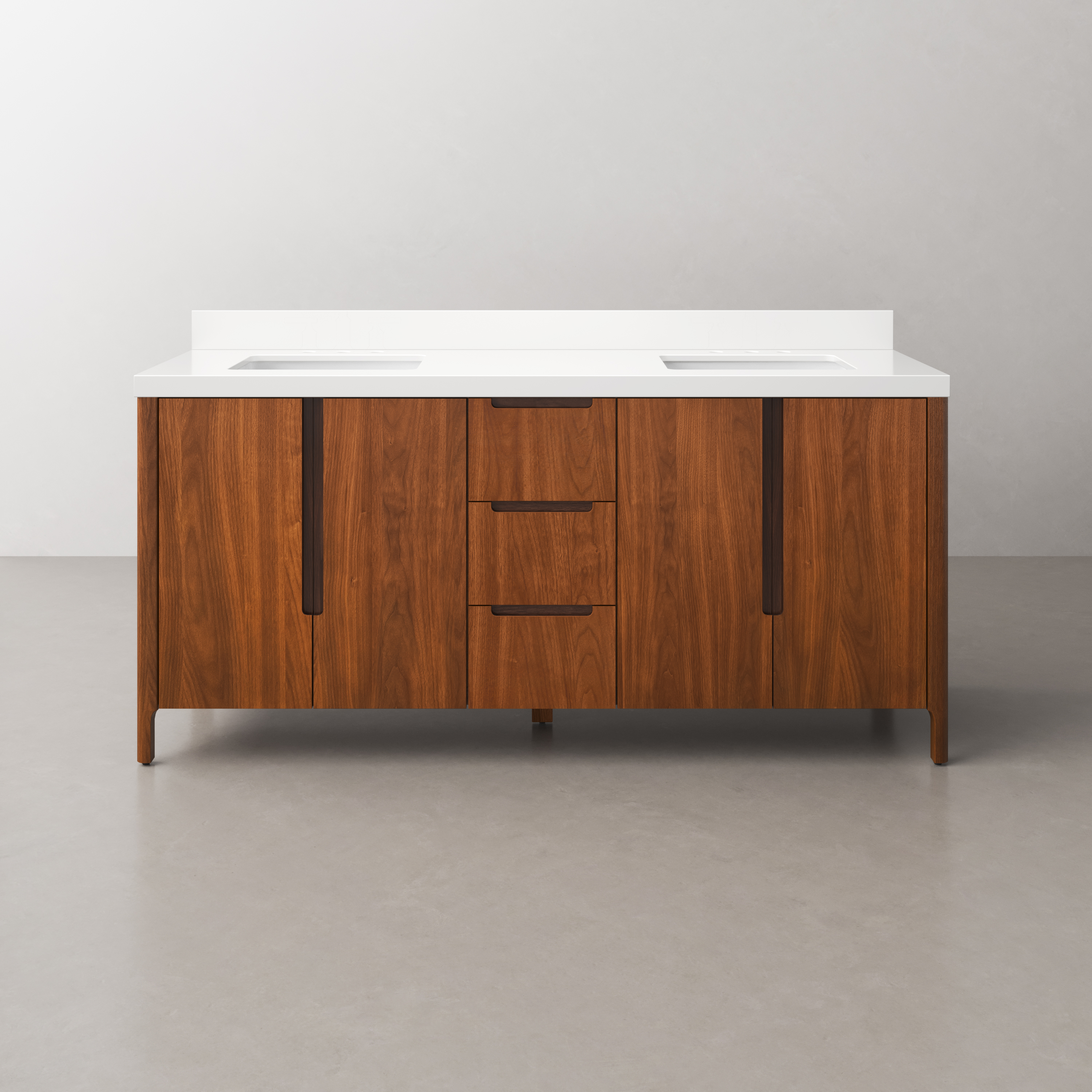 Add mid-century modern charm to your bathroom with the vanity in Noir Juglans. The 72-inch design exudes quiet sophistication, blending rich, dark wood tones with a minimalist profile. Twin undermount sinks are set in a 2-inch Whitebrook quartz countertop, with generous storage provided by dual cabinets and three drawers. Soft-close functionality and finger groove hardware provide a tactile, seamless experience. Fully assembled for immediate installation.