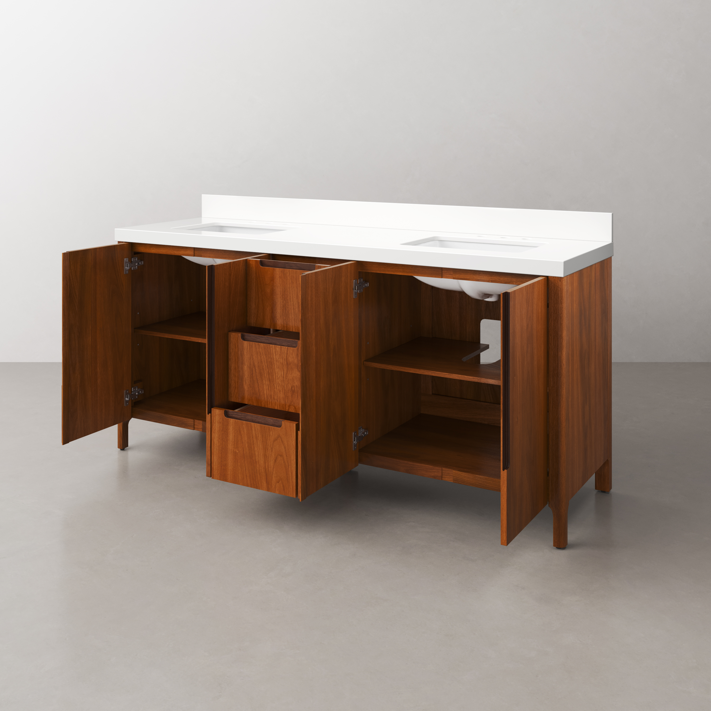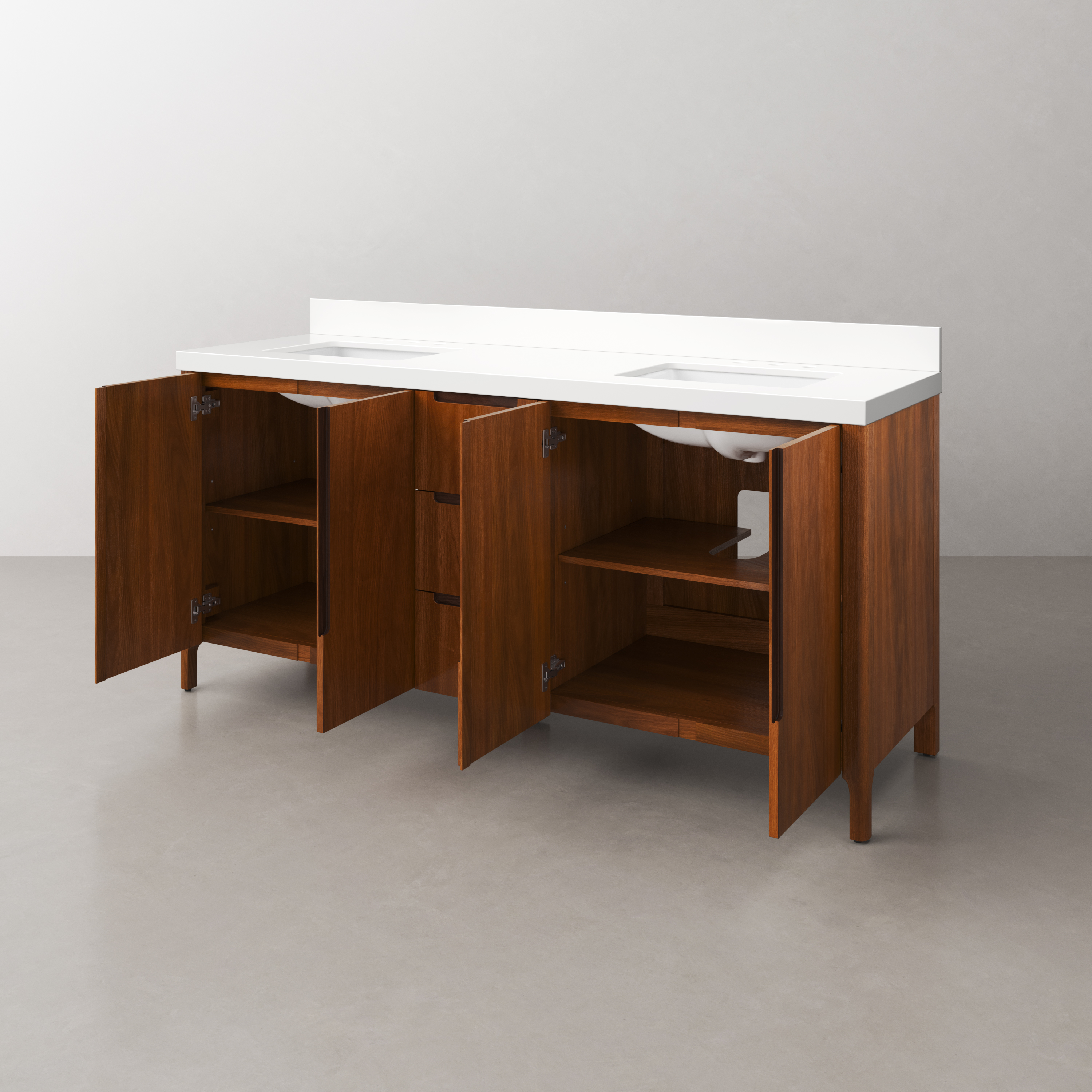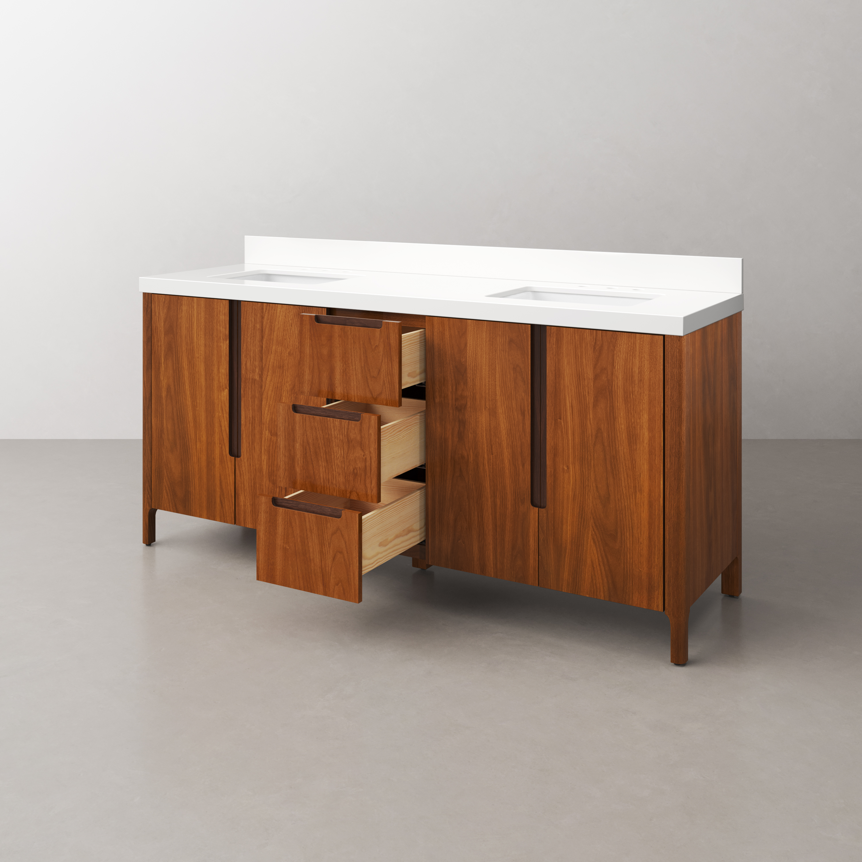 Add mid-century modern charm to your bathroom with the vanity in Noir Juglans. The 72-inch design exudes quiet sophistication, blending rich, dark wood tones with a minimalist profile. Twin undermount sinks are set in a 2-inch Whitebrook quartz countertop, with generous storage provided by dual cabinets and three drawers. Soft-close functionality and finger groove hardware provide a tactile, seamless experience. Fully assembled for immediate installation.