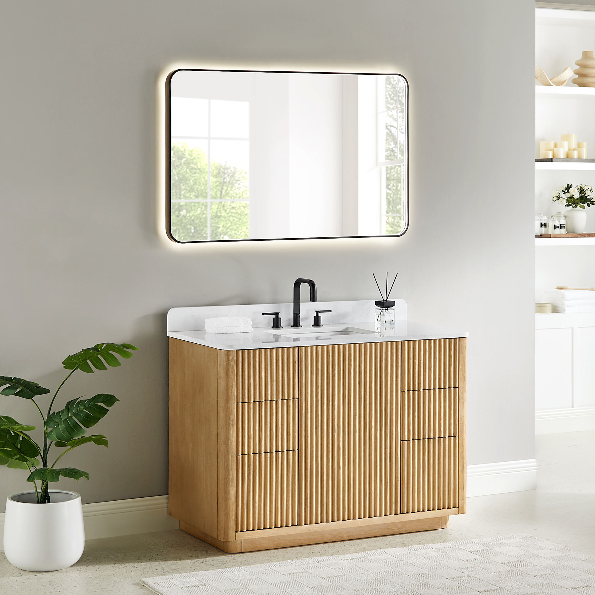 Our timeless Issac Edwards Collection vanity combines modern design with exceptional functionality, featuring a washed finish that adds a touch of warmth and softness to your bathroom. The drawer and door panels are adorned with solid reeding, showcasing elegant detailing that creates subtle shadows, enhancing the piece with added depth and visual contrast. The smooth countertop, with its rounded edges, displays a refined, contemporary charm, perfectly highlighting the sophisticated designed grain lines. Thoughtfully crafted for your convenience, this innovative design features a push-to-open and close mechanism, a sleek handle-free aesthetic, a dedicated hair dryer organizer, and built-in UL-listed power and USB outlets, ensuring effortless access and organized storage.