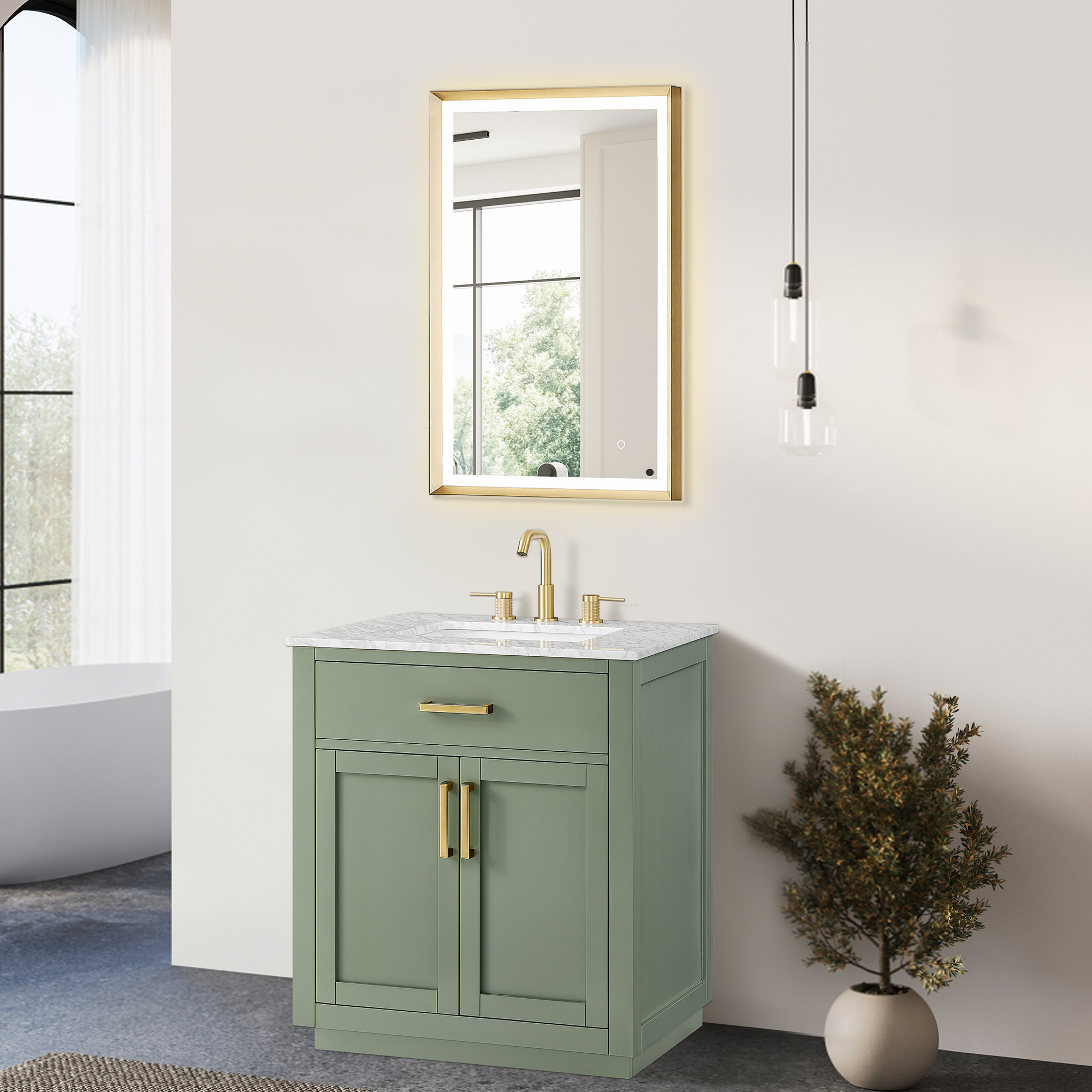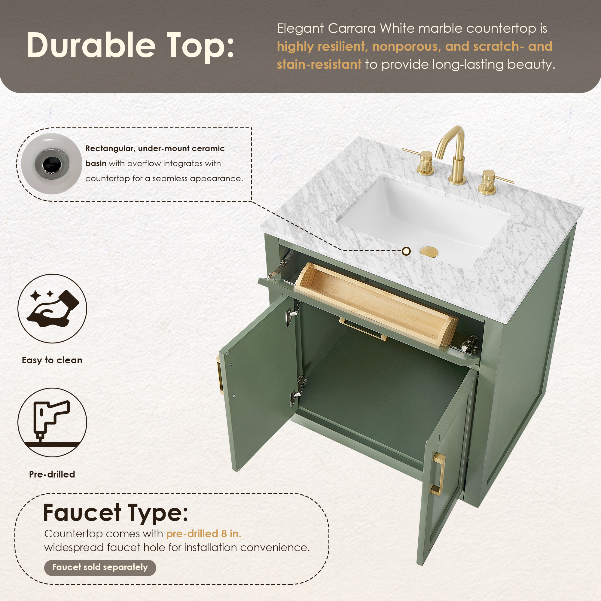 Elegant Carrara White marble countertop is highly resilient, nonporous, and scratch- and stain-resistant to provide long-lasting beauty.