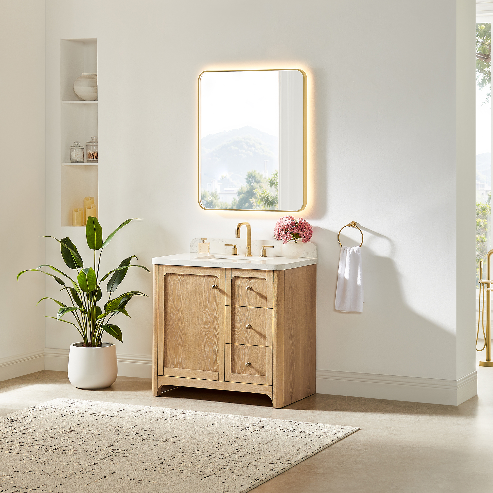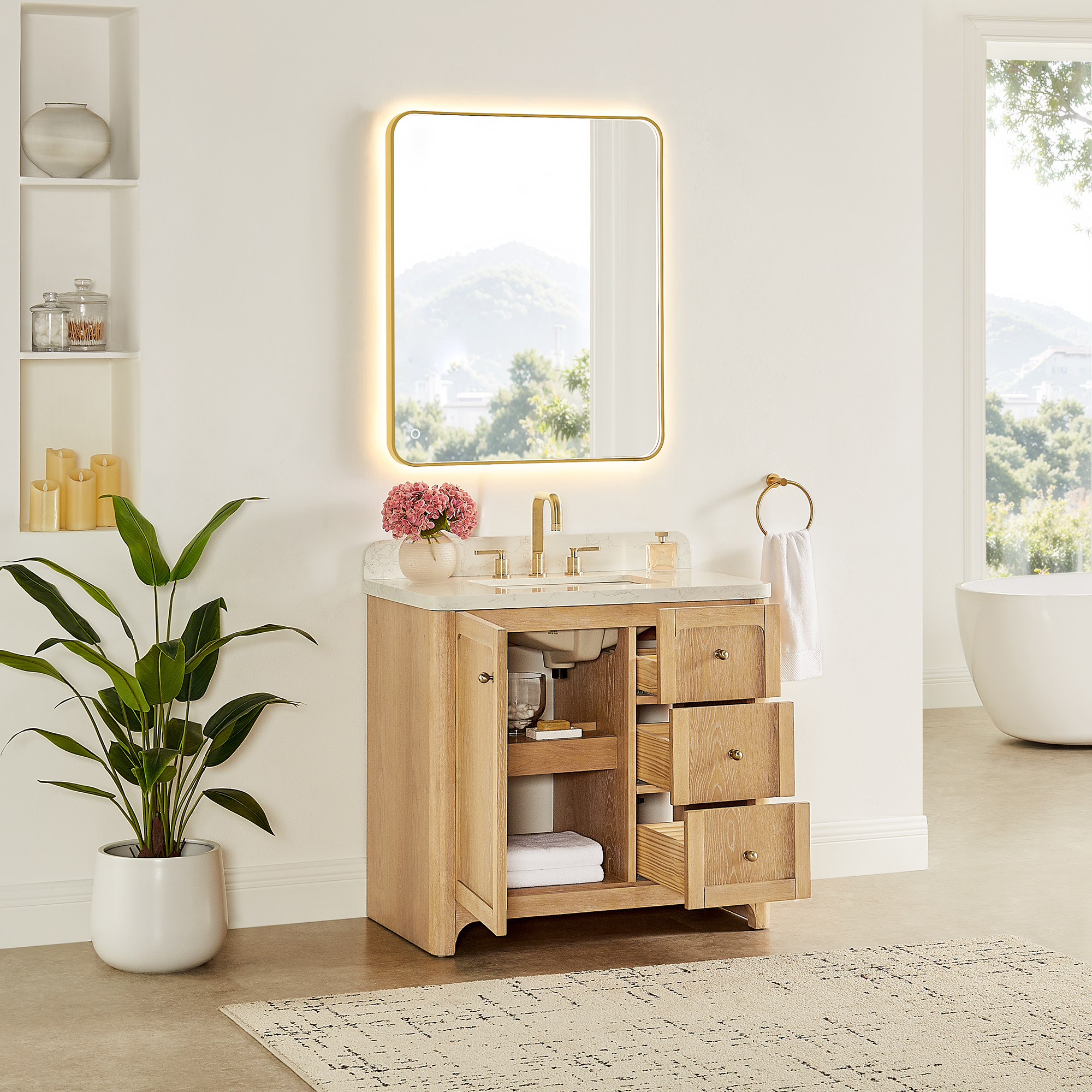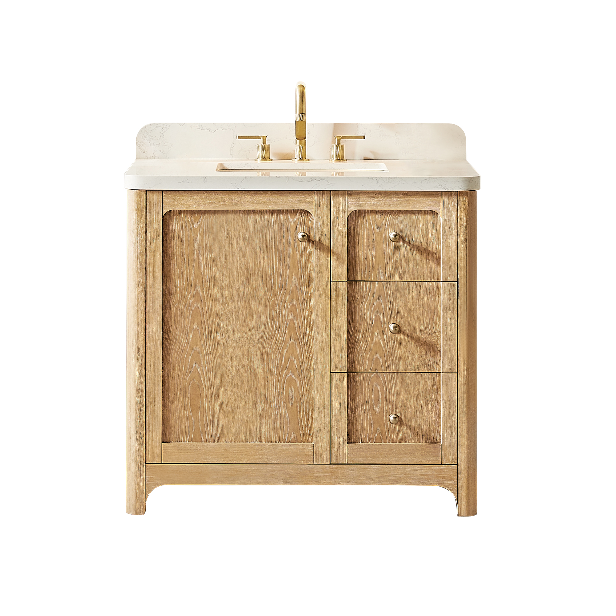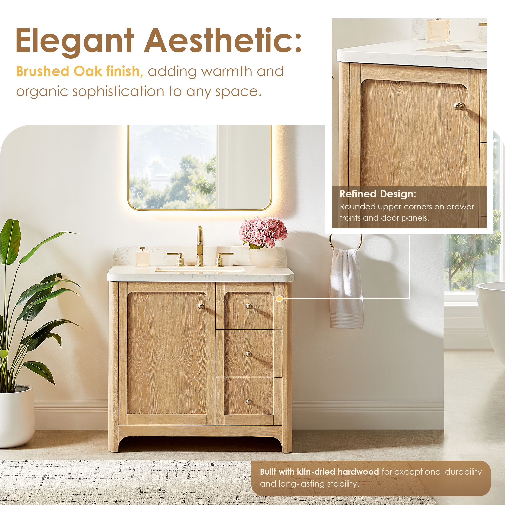 The Issac Edwards Collection vanity in Brushed Oak brings modern elegance and everyday durability to your bathroom. With its soft curves, rich wood grain, and stylish hardware, it creates an upscale look that feels timeless. Crafted from premium materials for long-lasting performance, the Issac Edwards vanity combining generous storage with a sturdy 1.4-inch thickened engineered stone top is built to handle daily use while adding a touch of luxury.