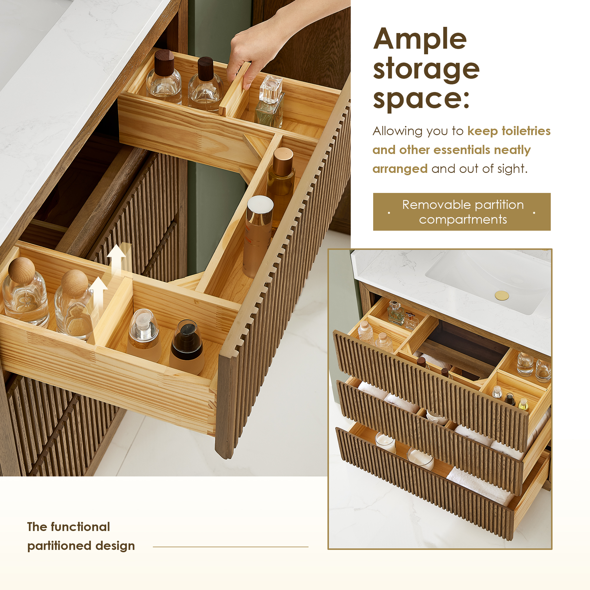 This rustic-inspired vanity features a gorgeous blend of narrow reeding panel and grain white engineered stone that creates a modern and sophisticated aesthetic. A model of understated elegance, it complements a variety of design styles - from traditional and classic to minimalist and contemporary. The innovatively designed, parallel-front drawers feature beveled edges, eliminating the need for conventional handles. Inside, you'll find wooden U-shaped groove that optimizes space for effortless plumbing installation. Functionally separated drawers offer a well-organized solution for storing toiletries, towels, and other essentials.