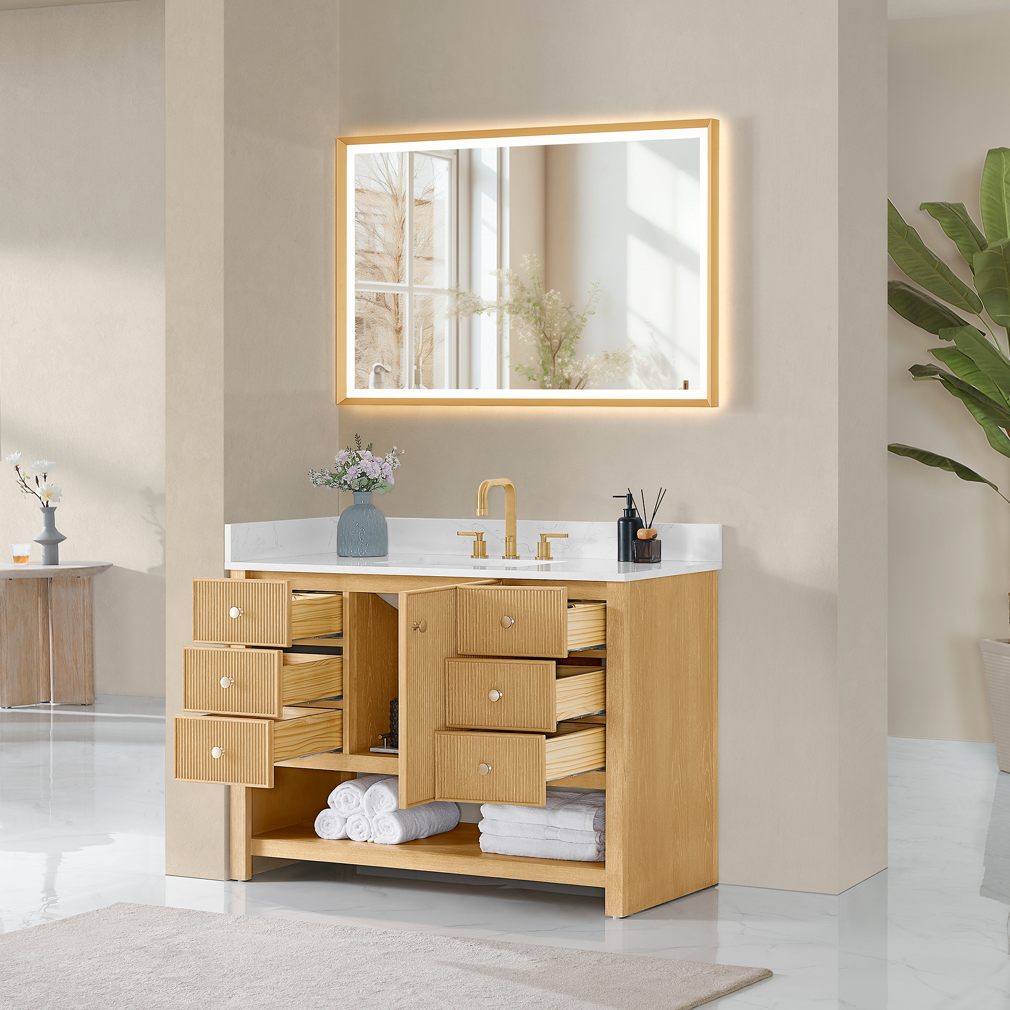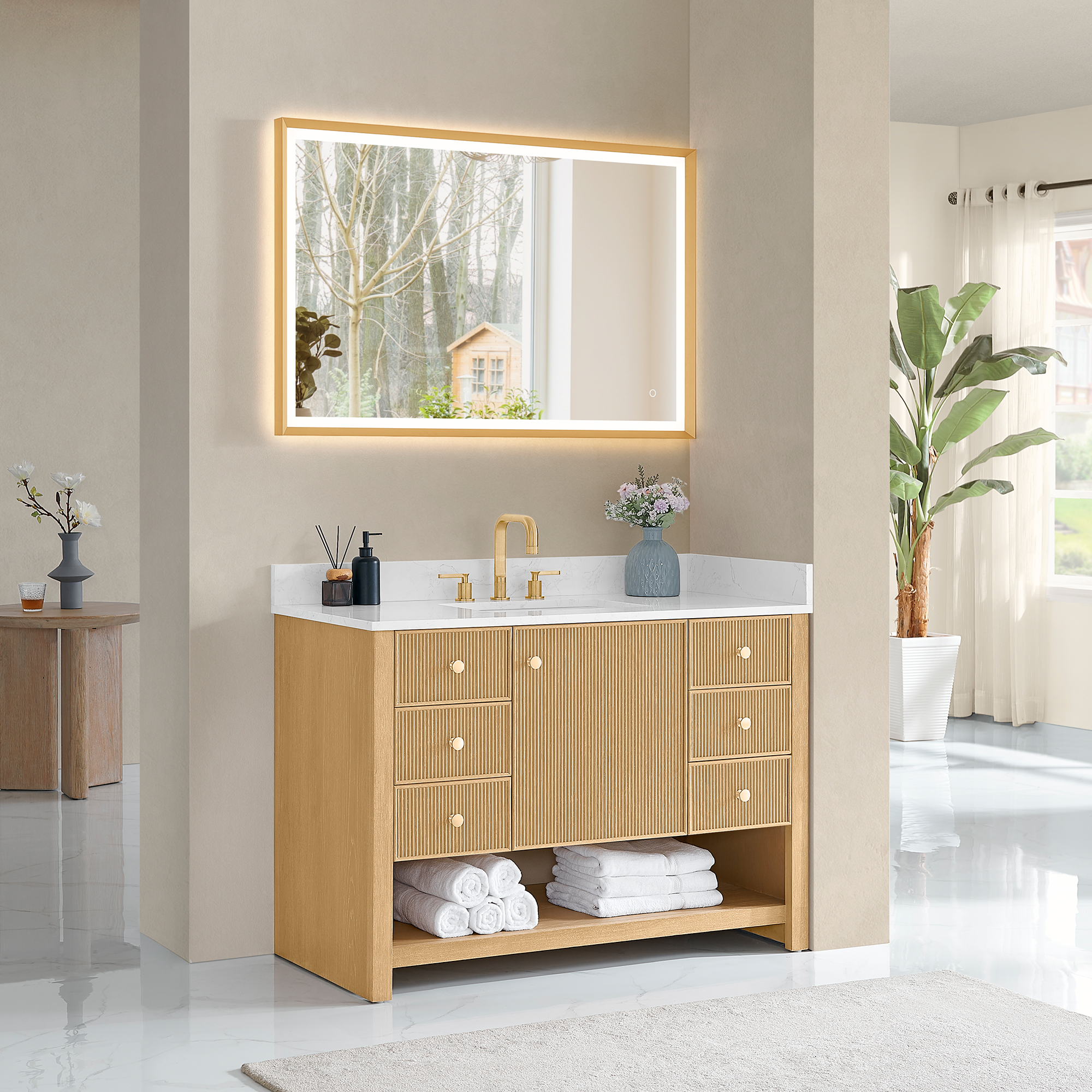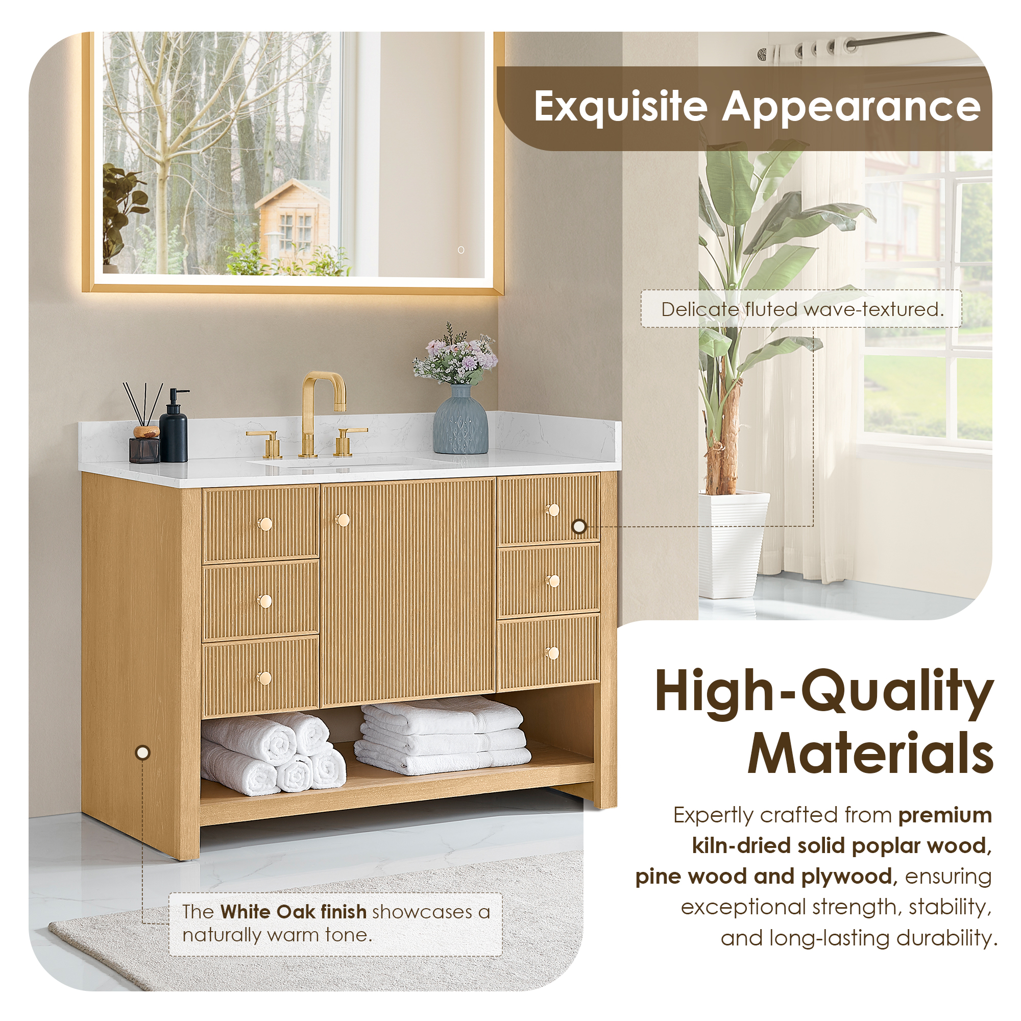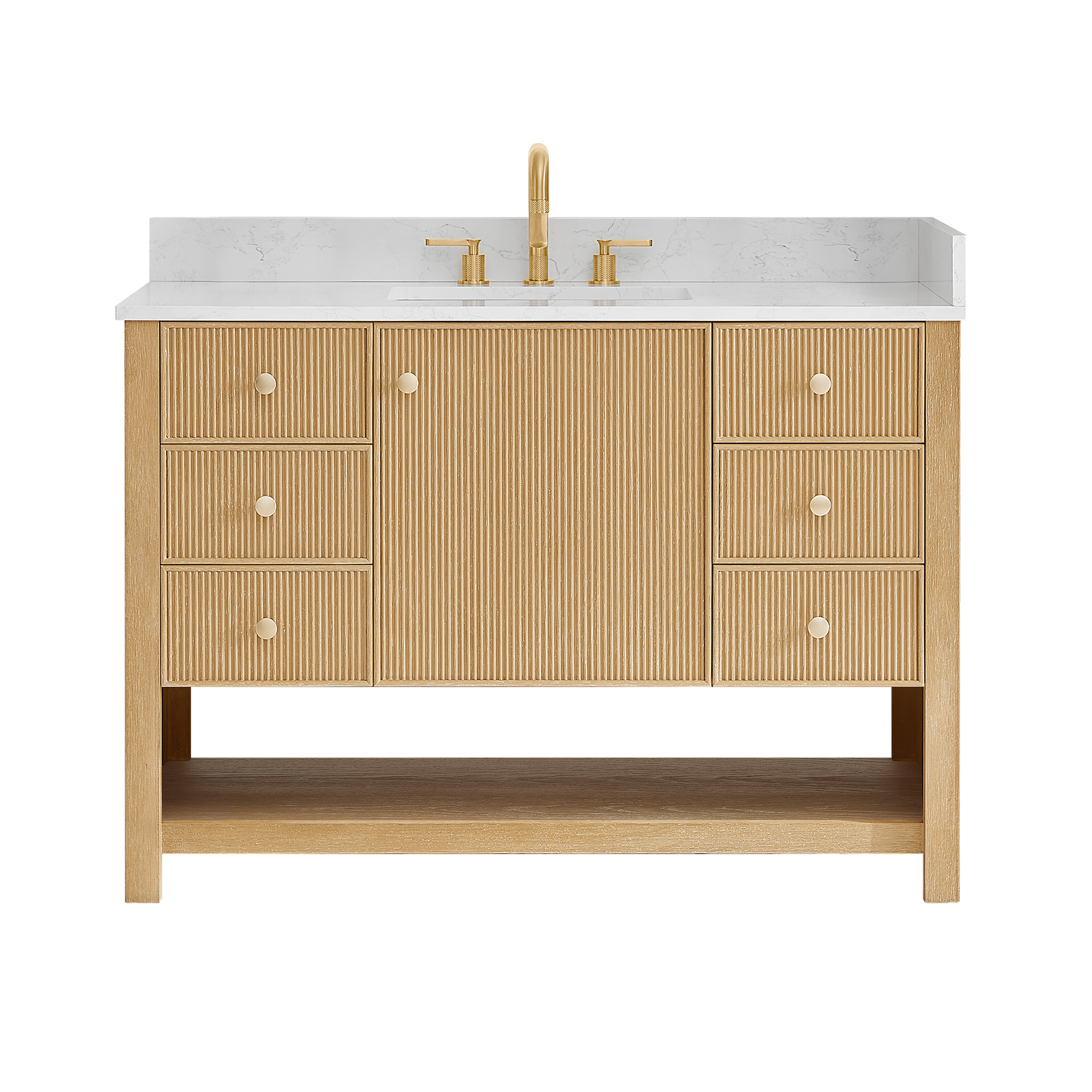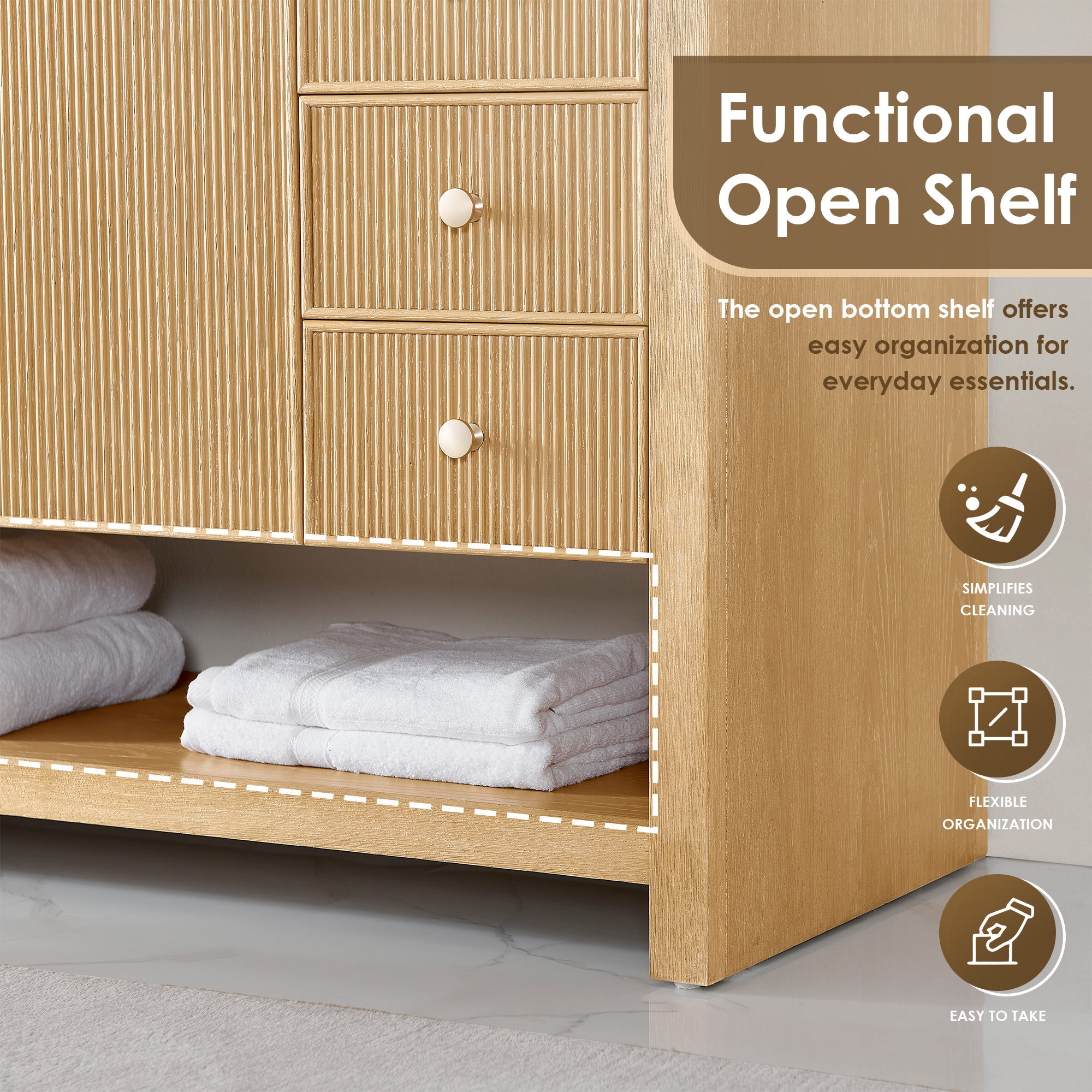 Constructed from premium materials, the Issac Edwards Collection vanity is built for long-lasting durability. Its warm White Oak finish and fluted wave-texture detailing add visual appeal, while the open shelf design enhances airflow and optimizes space. With practical storage and refined style, this vanity offers the perfect balance of classic charm and modern utility - An ideal addition to any bathroom retreat.