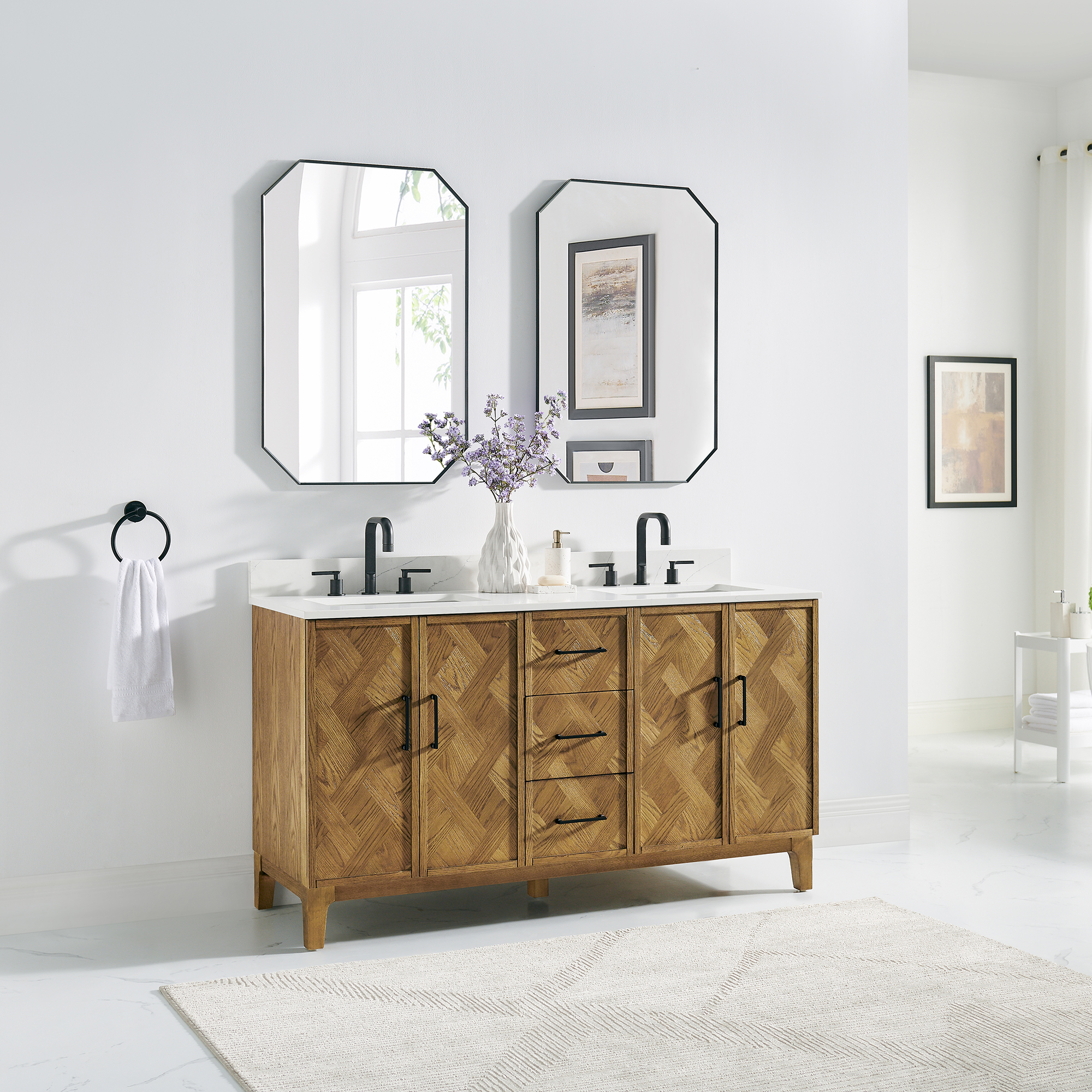 Transform your bathroom into a sanctuary of timeless elegance with our vintage-inspired vanity. Featuring exquisite herring bone striped brown detailing, soft-closing dovetailed drawers, and a sleek quartz countertop, it masterfully blends functionality with artistry. The sturdy wood base adds a touch of modern flair, while the weathered brown finish whispers rustic charm, creating a perfect balance of sophistication and warmth. It's more than a vanity - it's a statement of refined living. Redefine your bathroom, one detail at a time