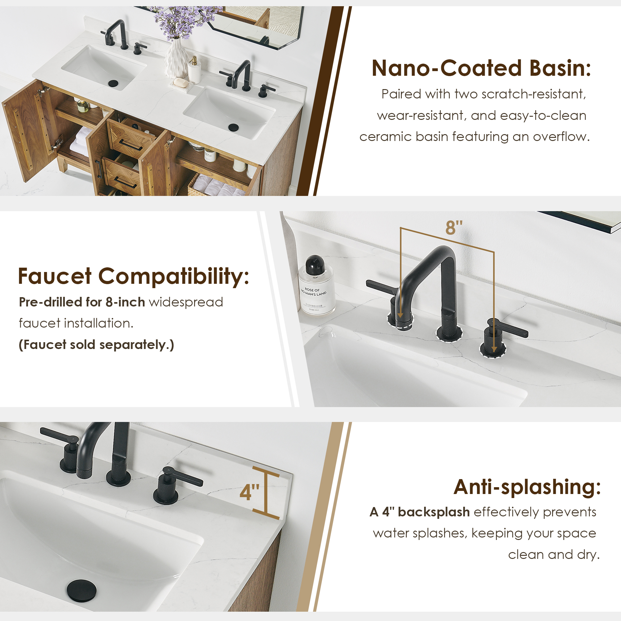 Nano-Coated Basin: Paired with two scratch-resistant, wear-resistant, and easy-to-clean ceramic basins featuring an overflow.