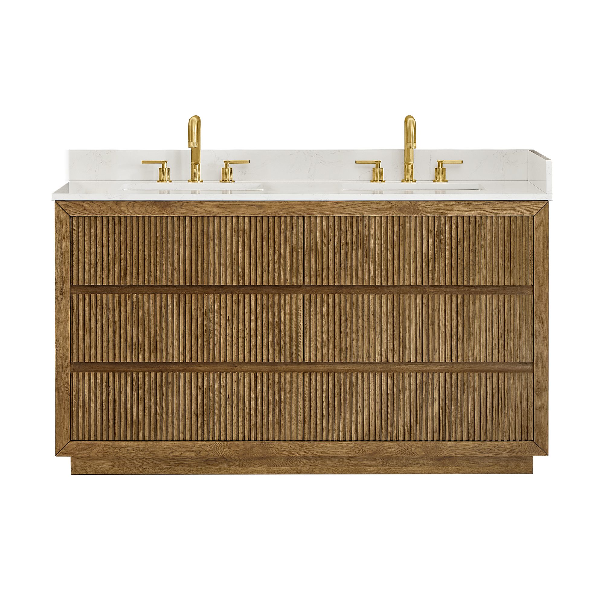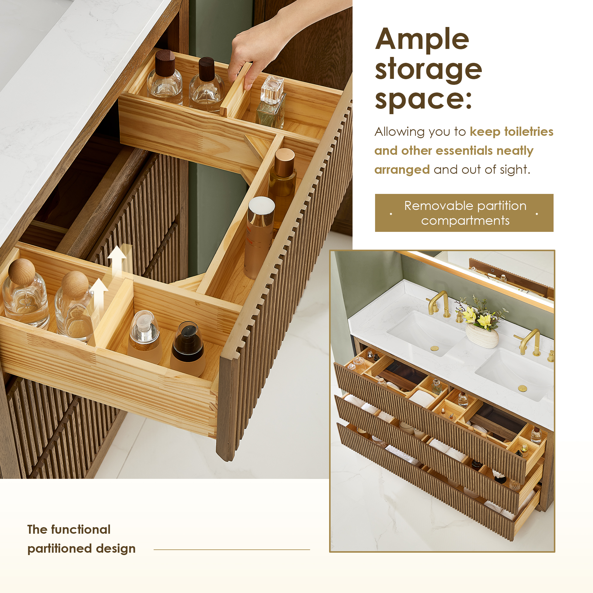 This rustic-inspired vanity features a gorgeous blend of narrow reeding panel and grain white engineered stone that creates a modern and sophisticated aesthetic. A model of understated elegance, it complements a variety of design styles - from traditional and classic to minimalist and contemporary. The innovatively designed, parallel-front drawers feature beveled edges, eliminating the need for conventional handles. Inside, you'll find wooden U-shaped groove that optimizes space for effortless plumbing installation. Functionally separated drawers offer a well-organized solution for storing toiletries, towels, and other essentials.