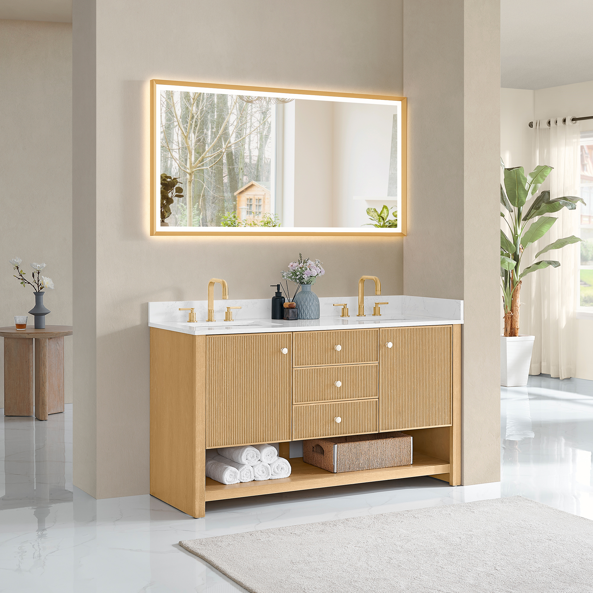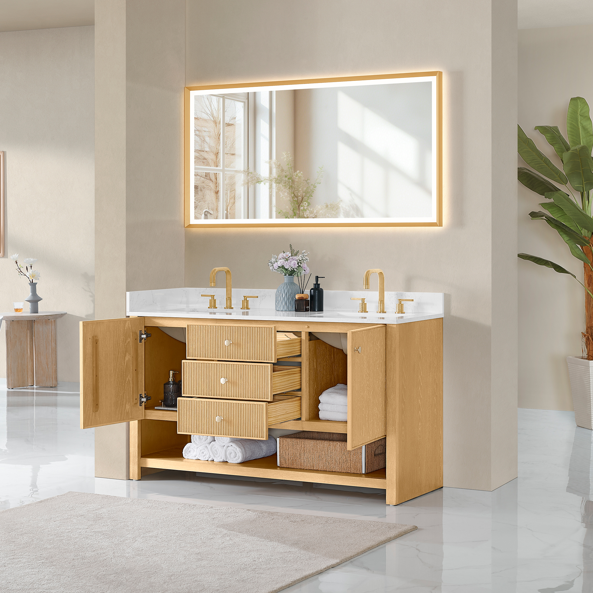 Issac Edwards Collection 60" Double Bathroom Vanity in White Oak with Grain White Stone Countertop and Mirror Option