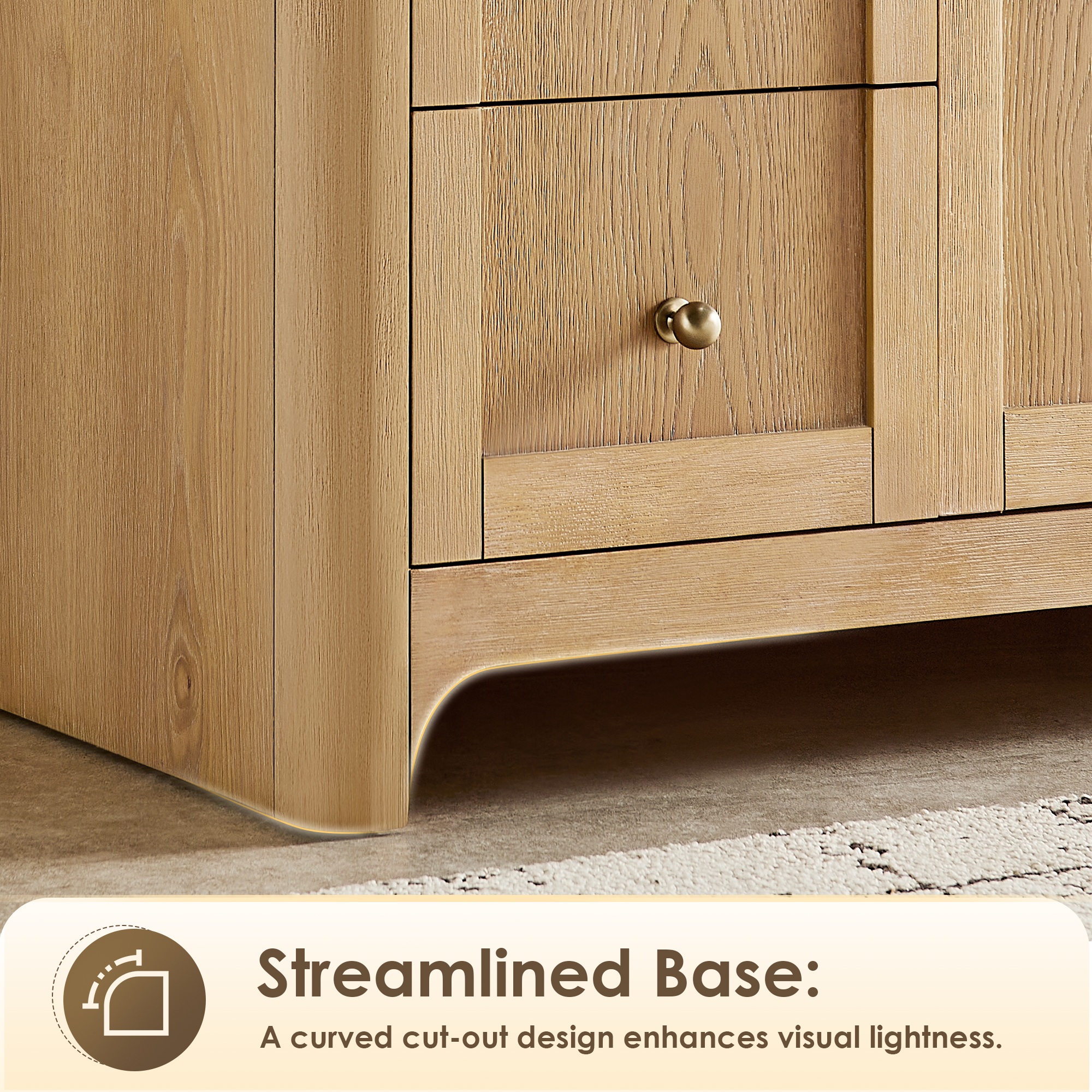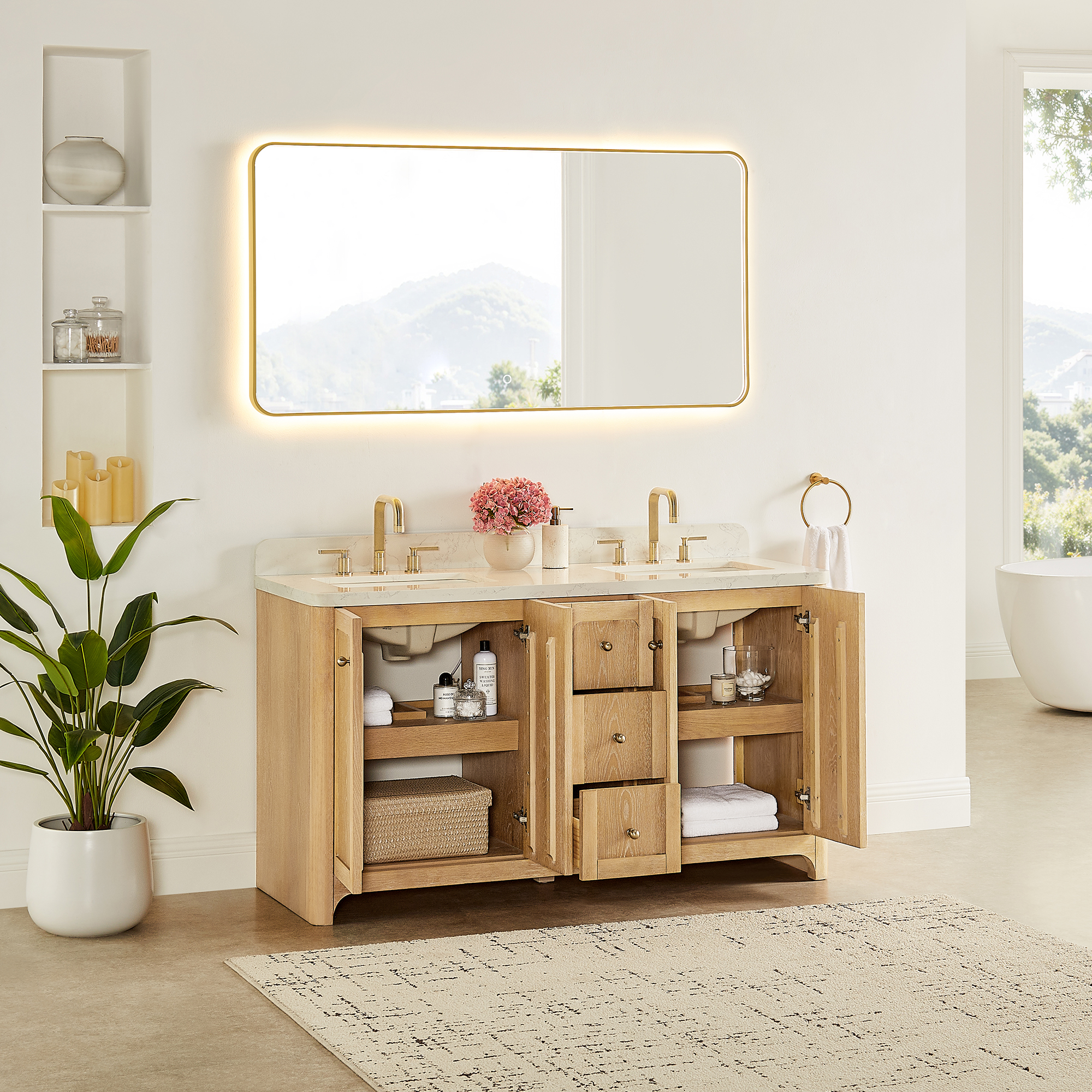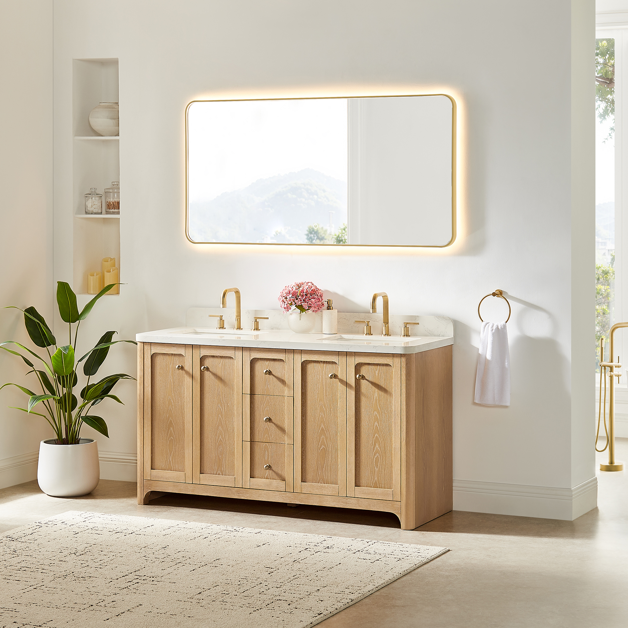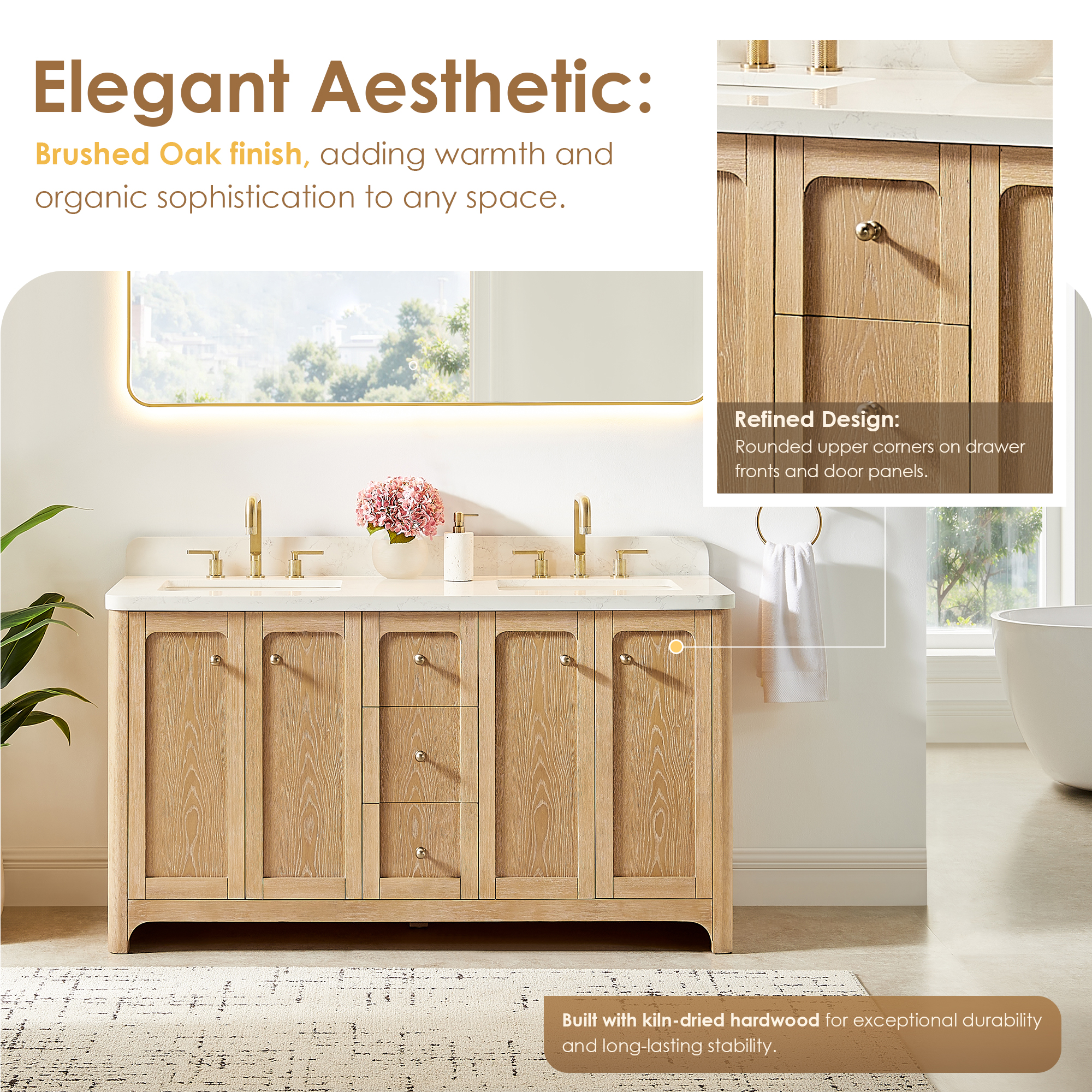 The Issac Edwards Collection vanity in Brushed Oak brings modern elegance and everyday durability to your bathroom. With its soft curves, rich wood grain, and stylish hardware, it creates an upscale look that feels timeless. Crafted from premium materials for long-lasting performance, the Issac Edwards vanity combining generous storage with a sturdy 1.4-inch thickened engineered stone top is built to handle daily use while adding a touch of luxury.