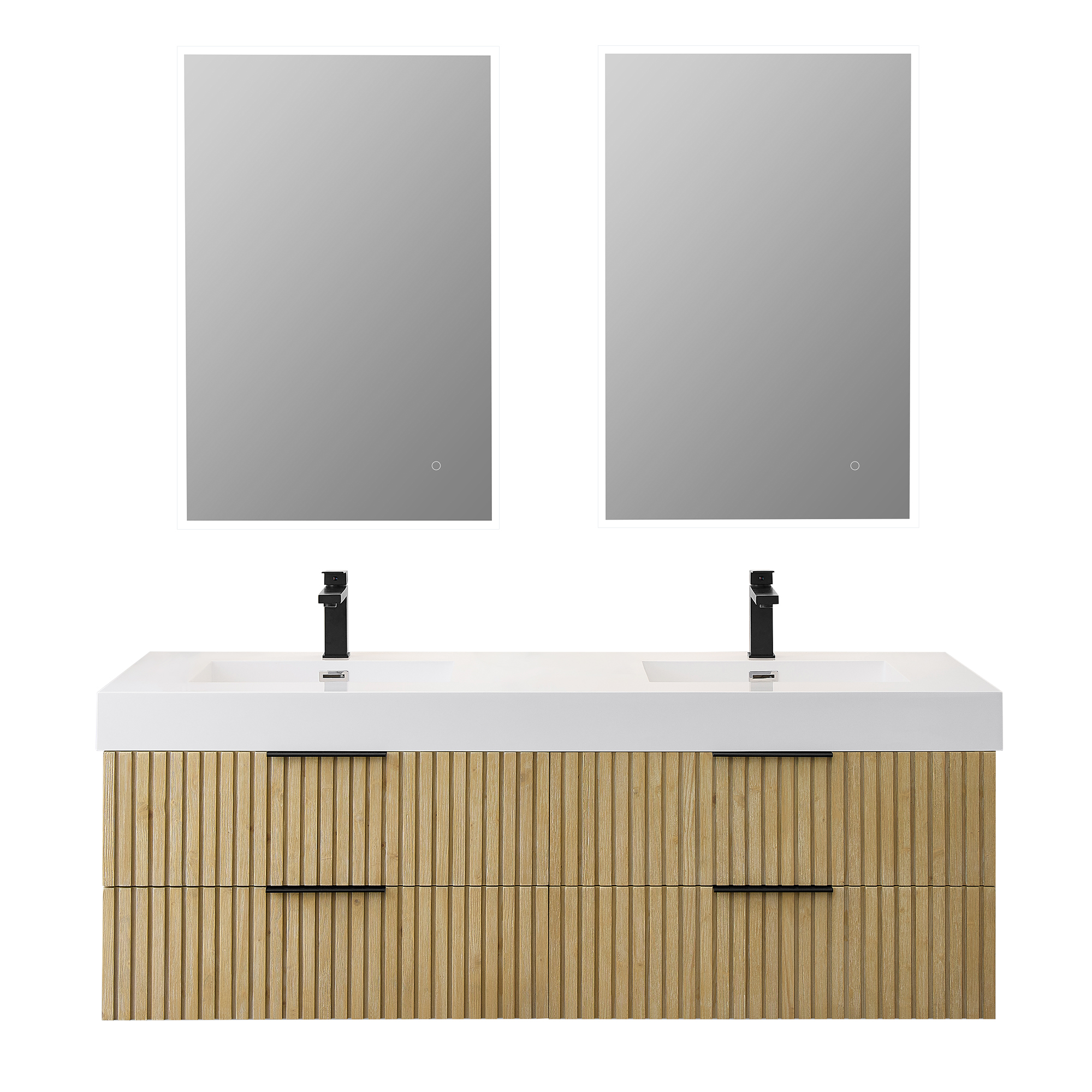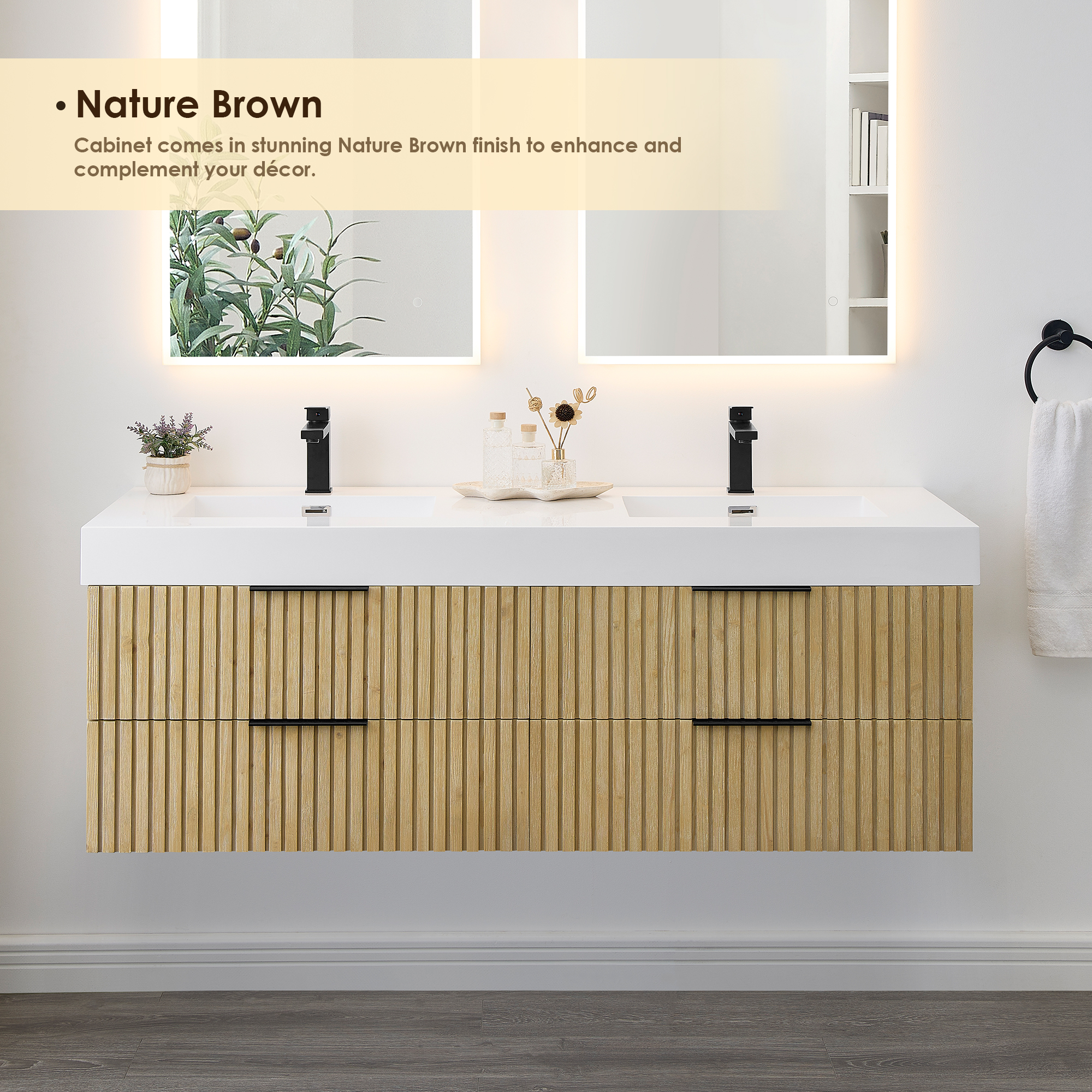 Textural and eye-catching, our Issac Edwards Collection vanity features a Nature Brown Fir Wood finish that radiates a natural and warm ambiance. Vertical pieces of solid wood create a liner, clean, and minimalist pattern that integrates perfectly into the cabinet. Its fluted drawer fronts give this piece texture, depth, and character- perfect for a bathroom refresh. The wall-mounted design, built-in partitions, and built-in bridge drawers provide ample storage space for your bathroom essentials. The elegant white integrated artificial drop-in sink is aesthetically pleasing and easy to maintain, offering a convenient user experience.