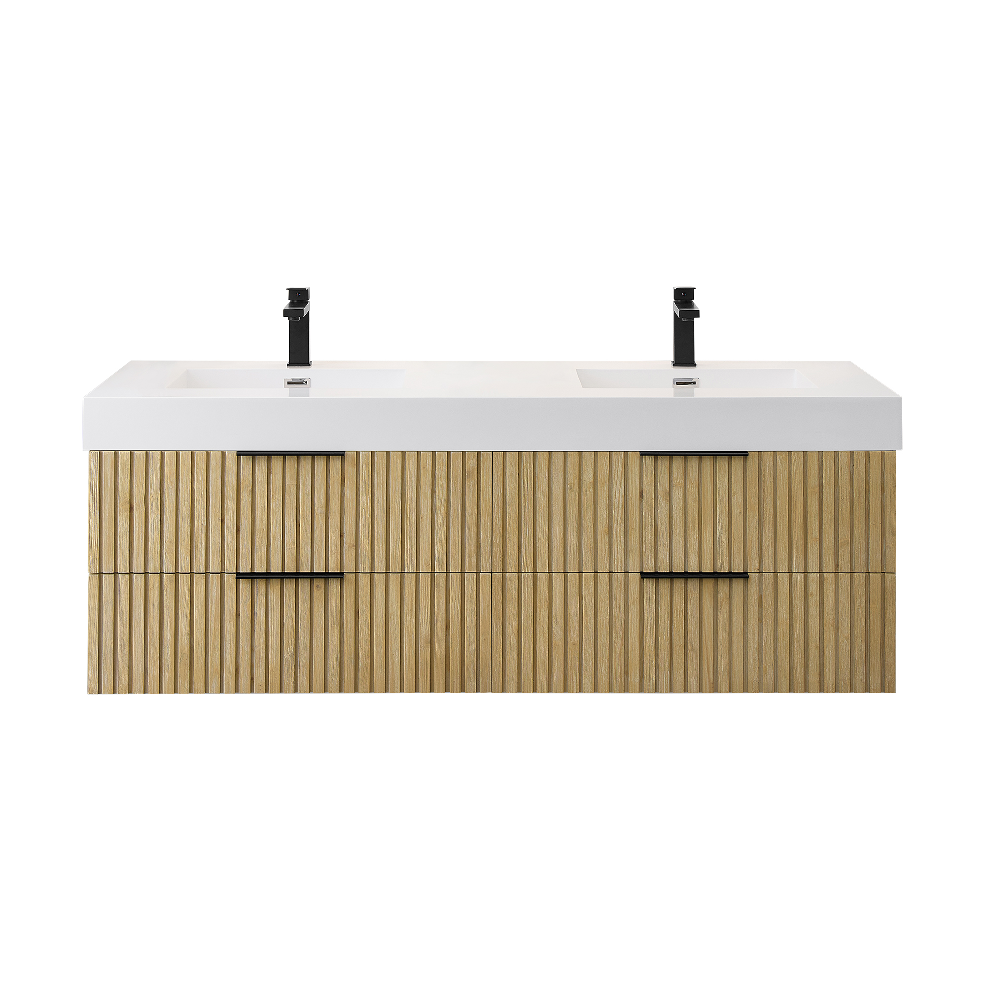 Textural and eye-catching, our Issac Edwards Collection vanity features a Nature Brown Fir Wood finish that radiates a natural and warm ambiance. Vertical pieces of solid wood create a liner, clean, and minimalist pattern that integrates perfectly into the cabinet. Its fluted drawer fronts give this piece texture, depth, and character- perfect for a bathroom refresh. The wall-mounted design, built-in partitions, and built-in bridge drawers provide ample storage space for your bathroom essentials. The elegant white integrated artificial drop-in sink is aesthetically pleasing and easy to maintain, offering a convenient user experience.