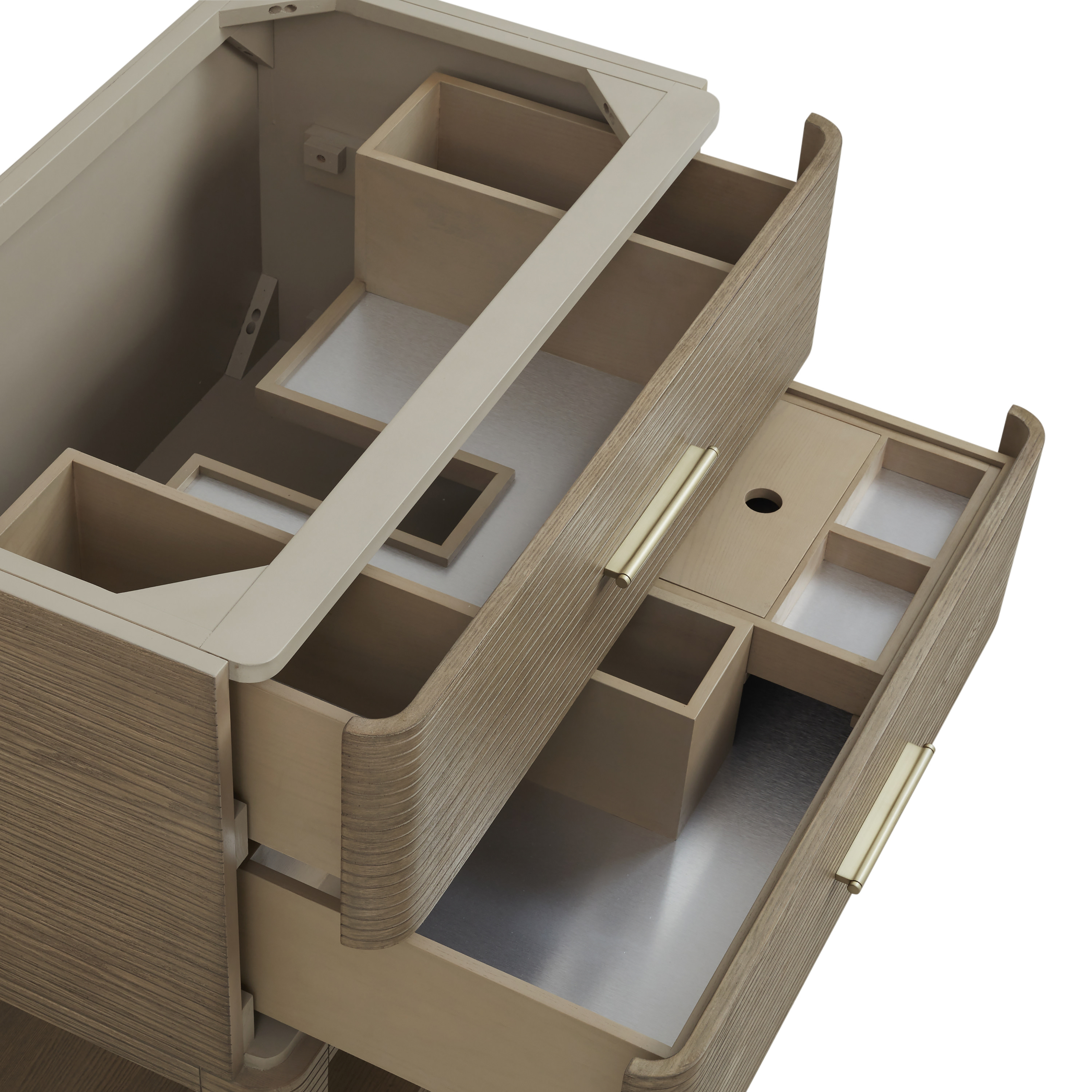 Drawers lined with our signature brushed aluminum laminate for easy cleaning.
