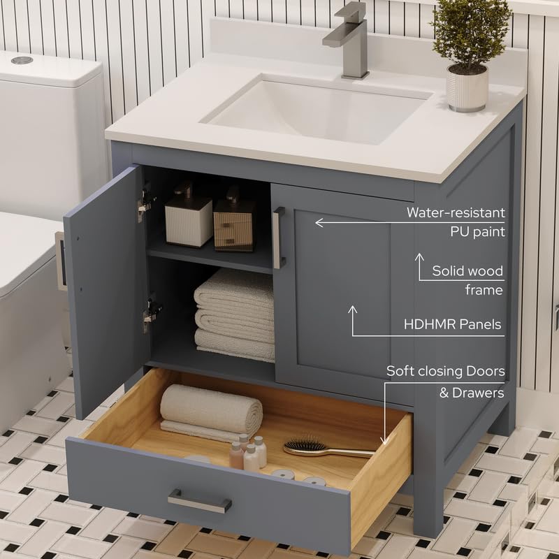 Vanity is expertly made from solid pinewood and HDHMR board with solid brass hardware
