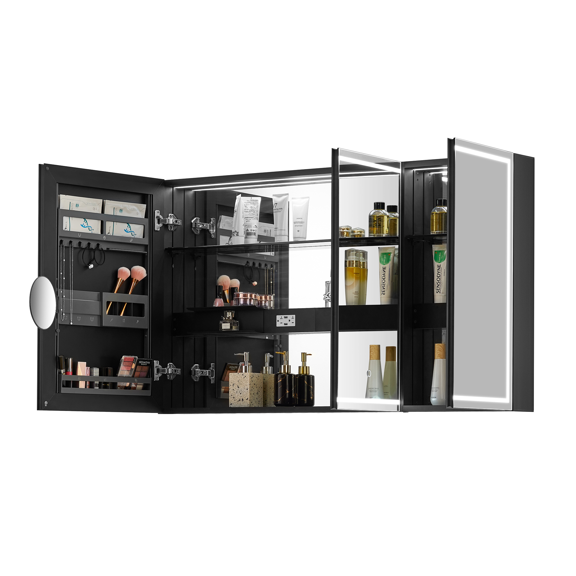 Revolutionize your bathroom storage with this one-of-a-kind LED medicine cabinet, designed for both style and functionality. Equipped with a thoughtful side organizer, it provides dedicated space for small items like lipsticks, masks, jewelry, and more, offering unmatched convenience while saving space. This cabinet features integrated power solutions with an outlet and USB port, plus a built-in hair dryer holder for effortless grooming. Magnifying mirror is designed to slide vertically and flip horizontally up to 180?, allowing you to adjust to the perfect height and angle for makeup, skincare, or other applications.