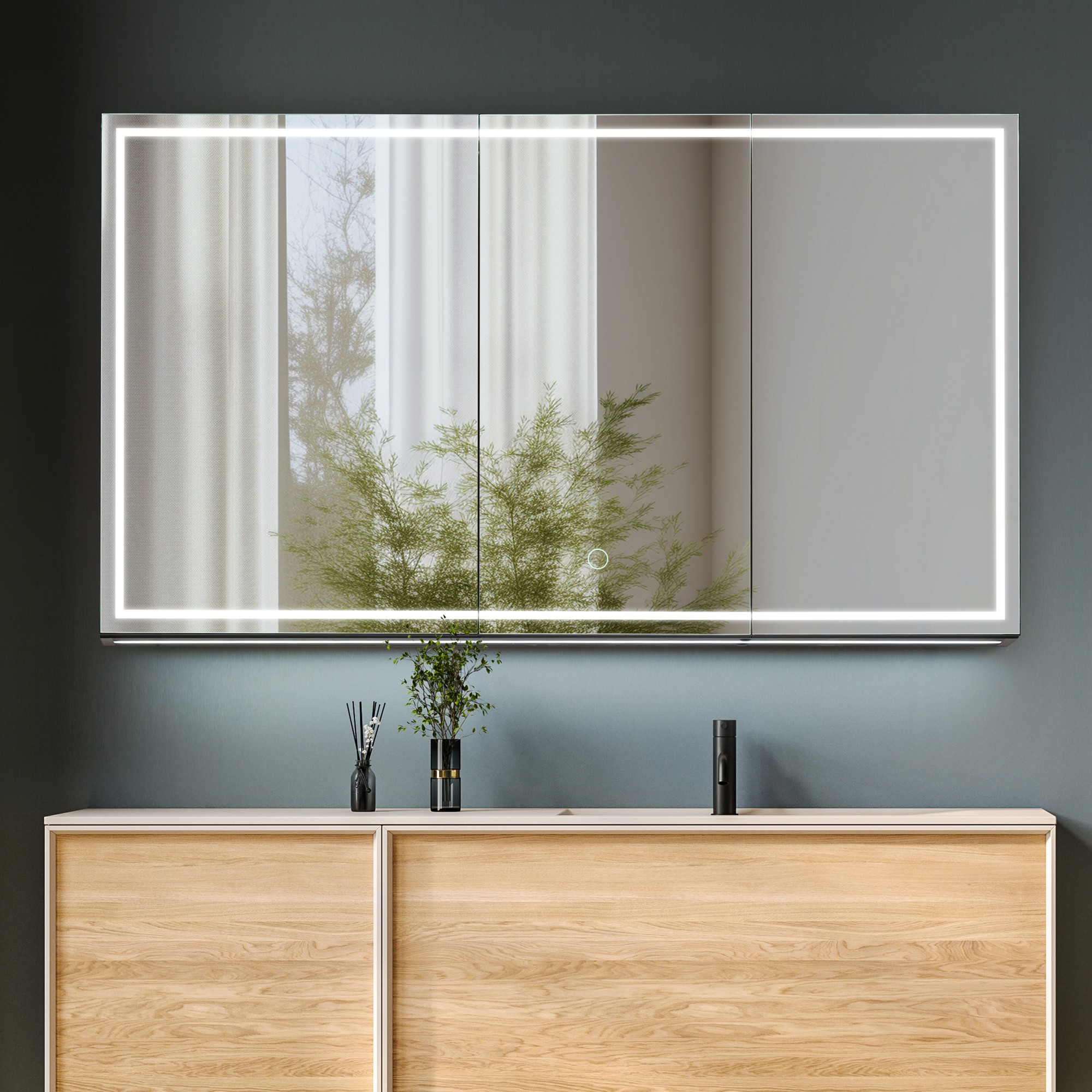 Soft LED illumination: Illuminated by lights around the door, as well as inside the cabinet at the top and bottom, ensuring optimal lighting for any task.