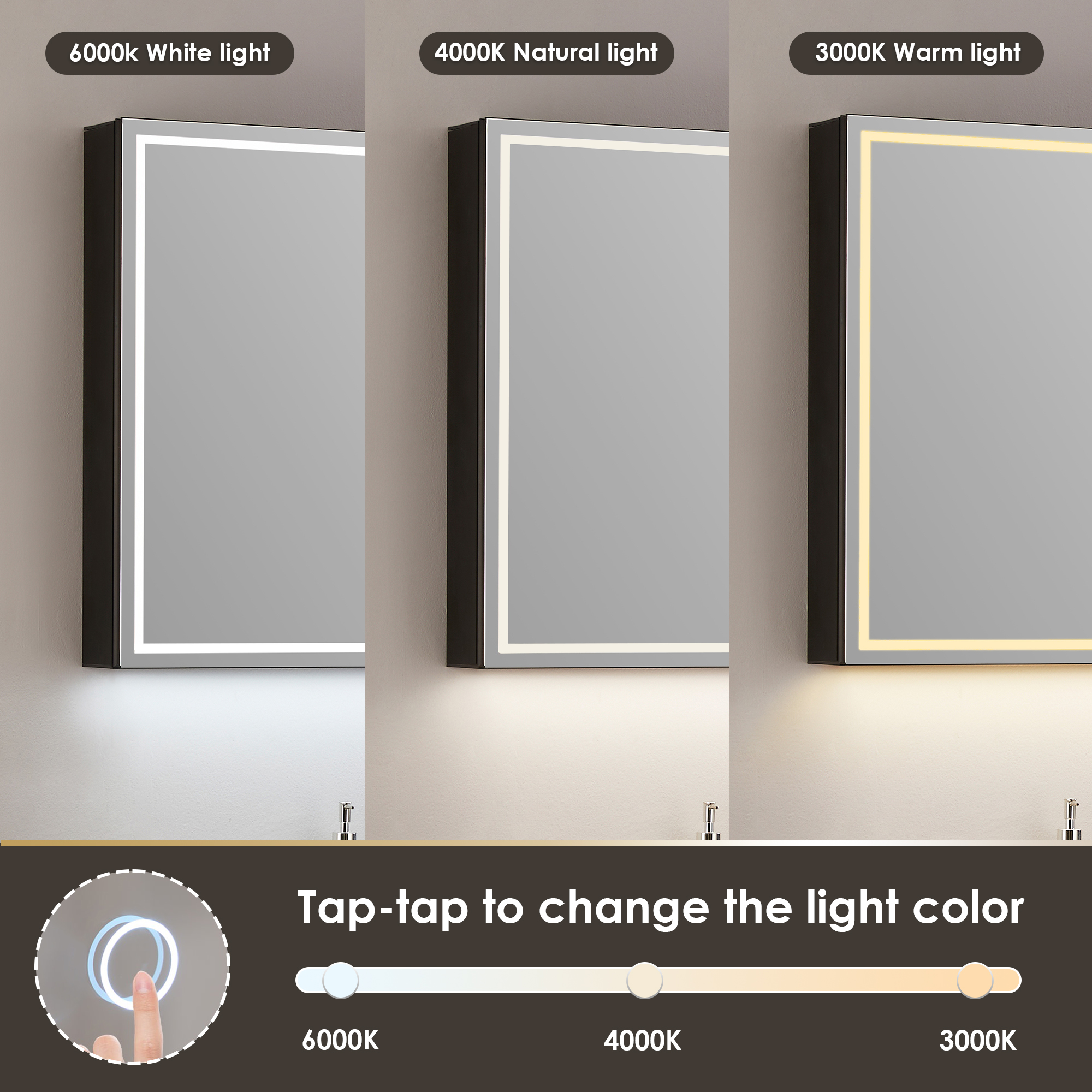oTap lightly for 3 color temperature changes (6000k/cold, 4000k/natural, 3000k/warm).