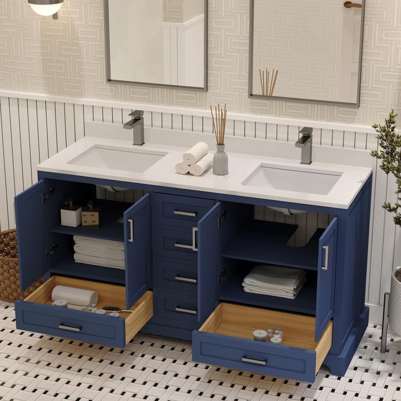 LV 60" Transitional Double Bath Vanity in Navy Blue with 3 Hardware Options, Base Only, and Top Option