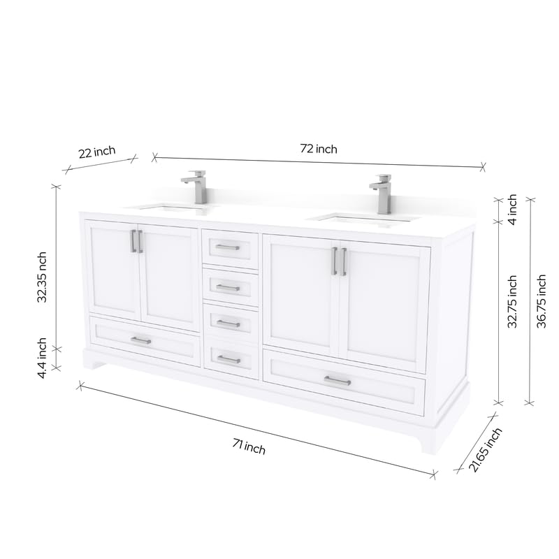 With dimensions of 72 in. W x 22 in. D x 33 in. H, this freestanding double-sink vanity brings expanded storage and style to larger bathrooms.
