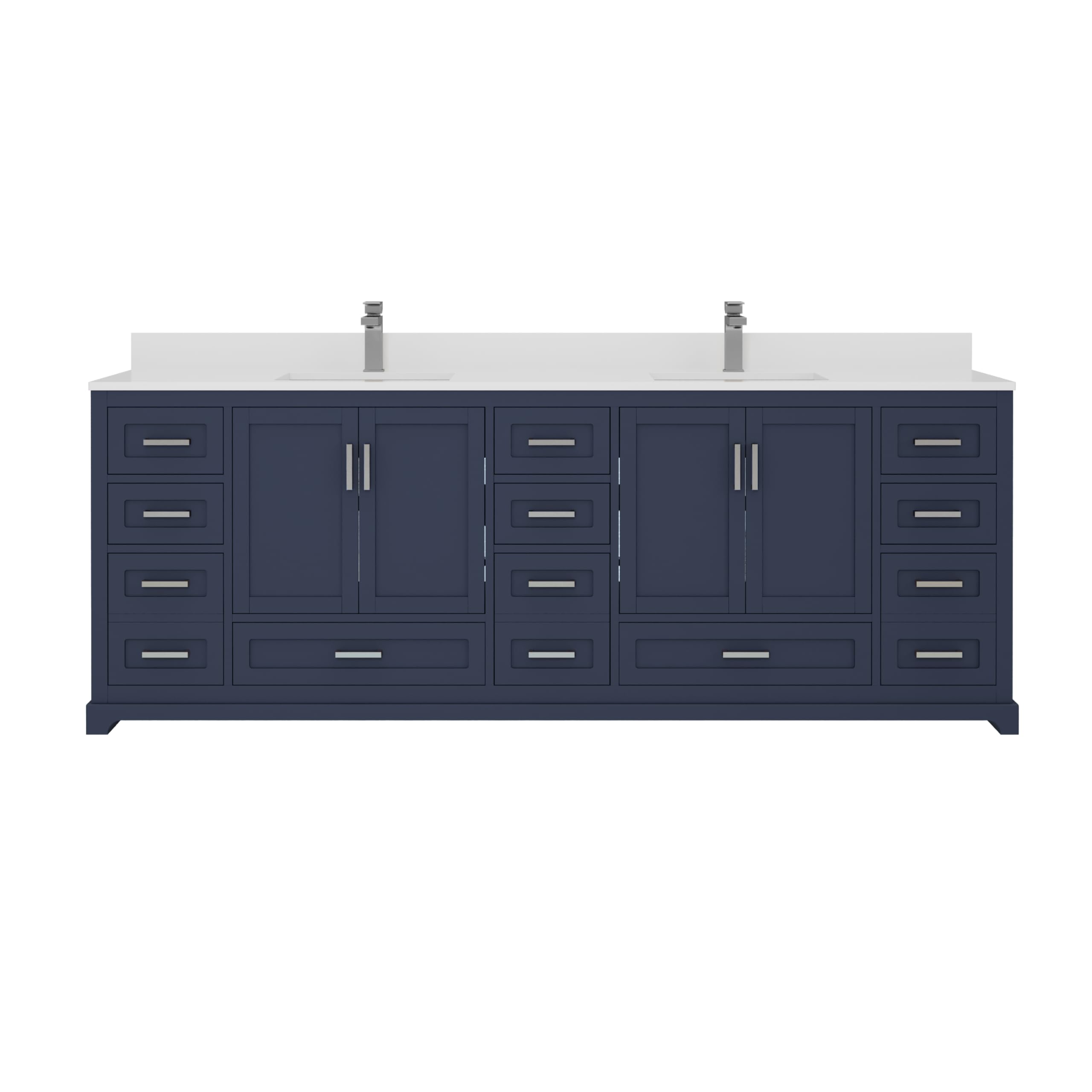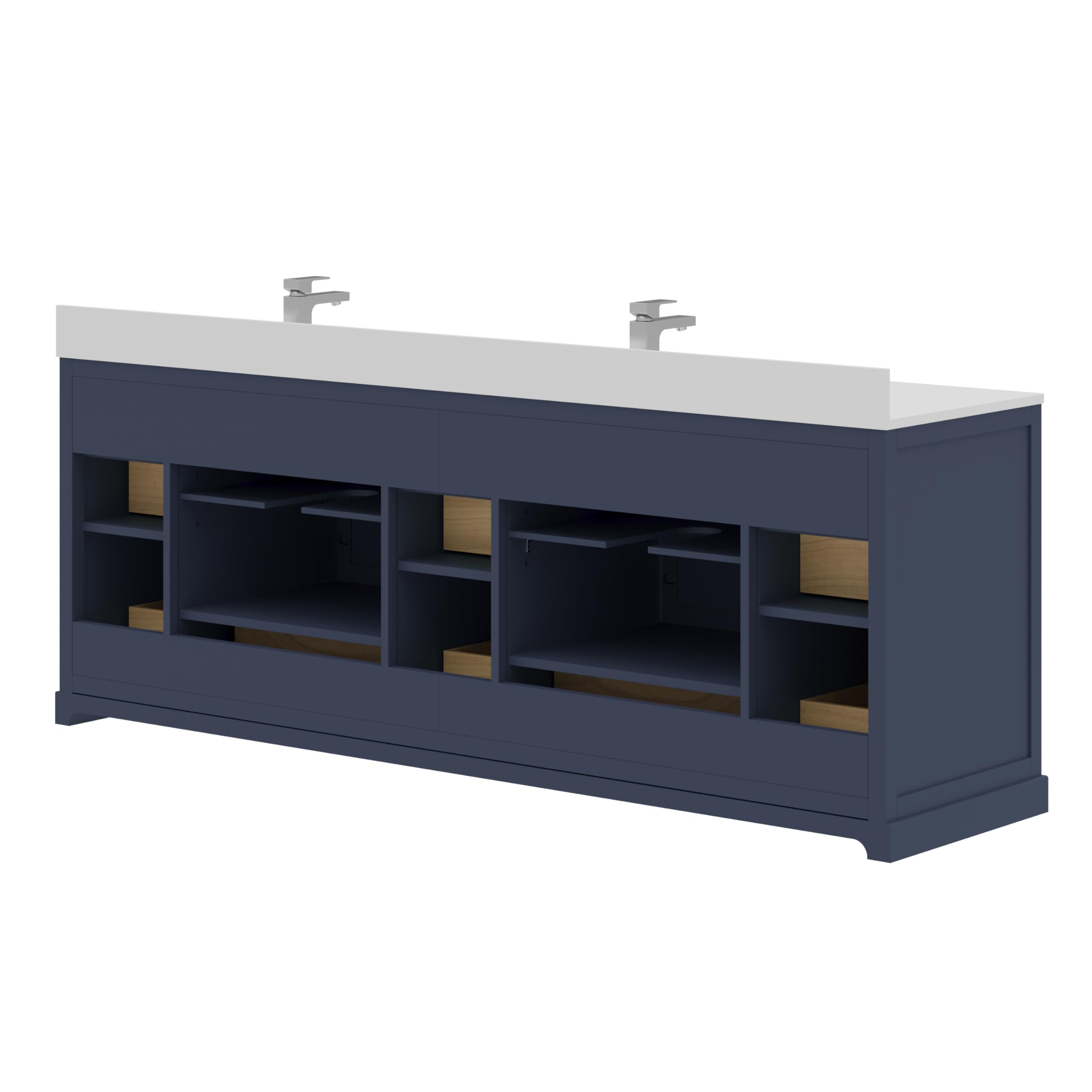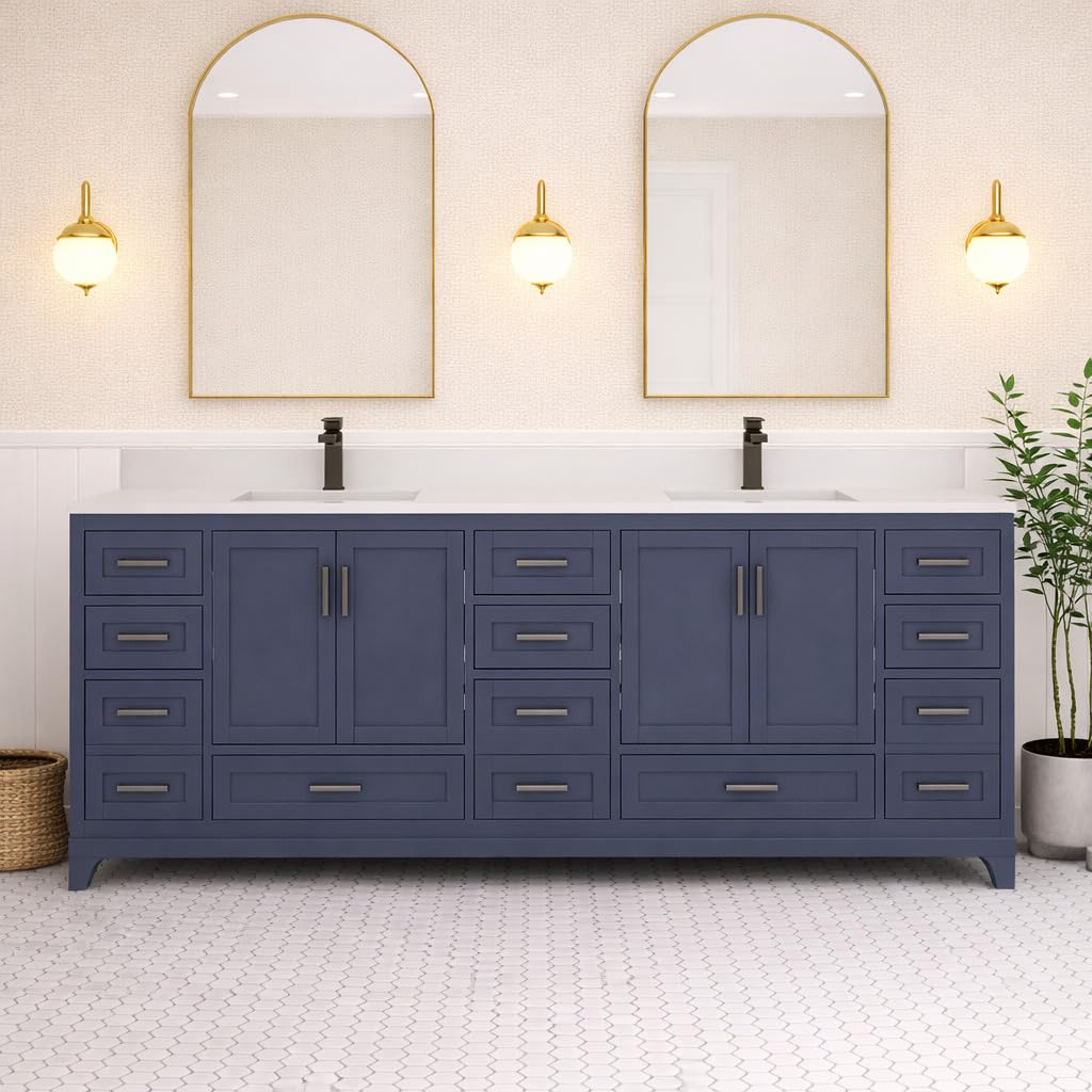 With dimensions of 84 in. W x 22 in. D x 33 in. H, this freestanding double-sink vanity brings expanded storage and style to larger bathrooms.