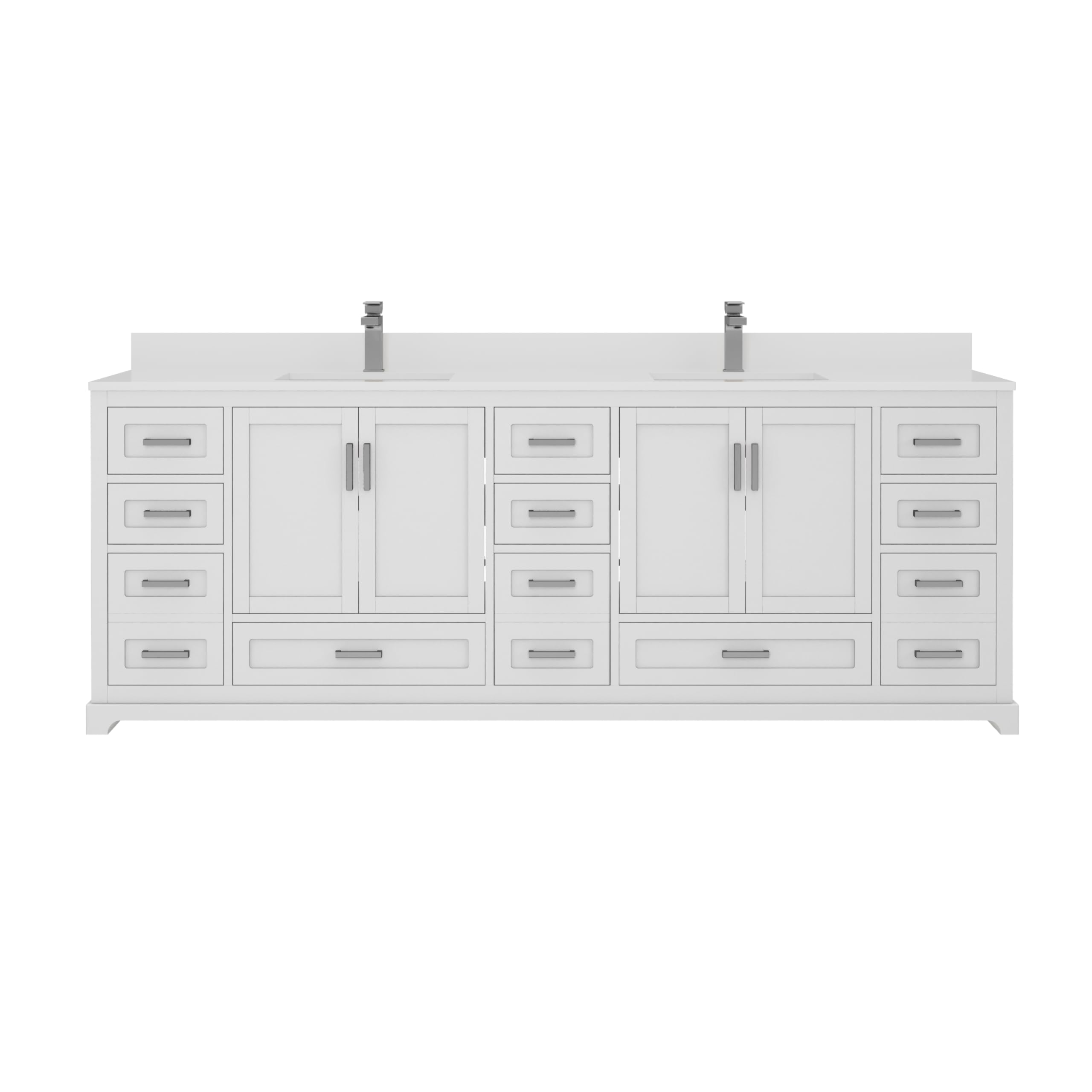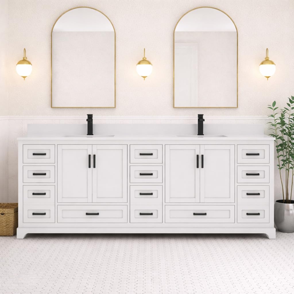 With dimensions of 84 in. W x 22 in. D x 33 in. H, this freestanding double-sink vanity brings expanded storage and style to larger bathrooms.