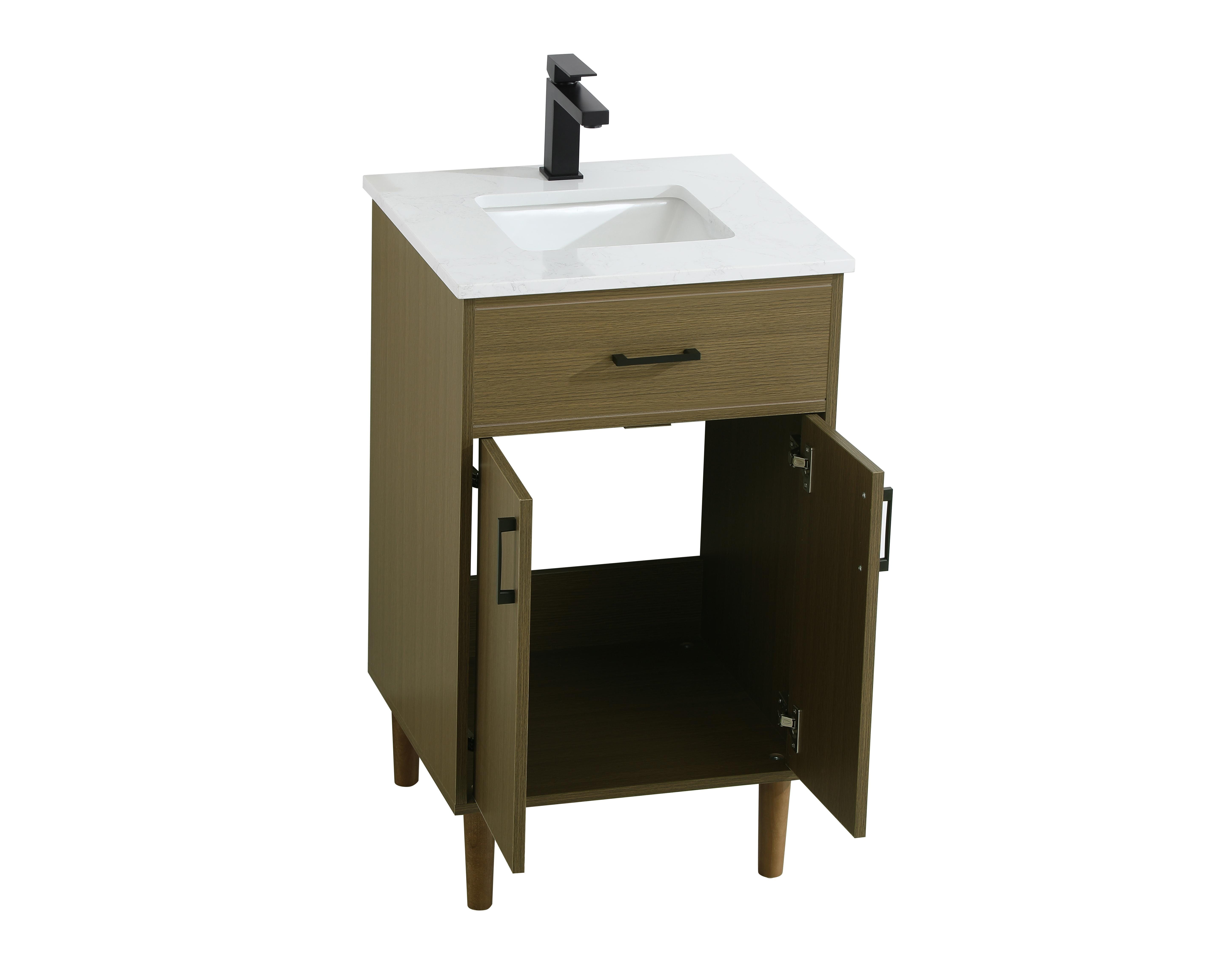 Transform your bathroom with this mid-century modern vanity, designed to bring both functionality and a sense of style to your space. Its clean lines, minimalist design, and tapered solid wood legs evoke a timeless charm, perfect for blending with modern and transitional interiors. The engineered marble countertop, with its unique faux marble veining, adds a refined, luxurious touch, while the porcelain sink is both durable and easy to maintain. Practicality meets aesthetics with a faux drawer for balanced design and a spacious double-door cabinet for efficient storage. Constructed from solid wood and MDF, this vanity offers lasting durability, while adjustable foot levelers ensure stability on any floor. Shipped mostly assembled, the solid wood legs can be effortlessly twisted into place, making installation quick and hassle-free.
