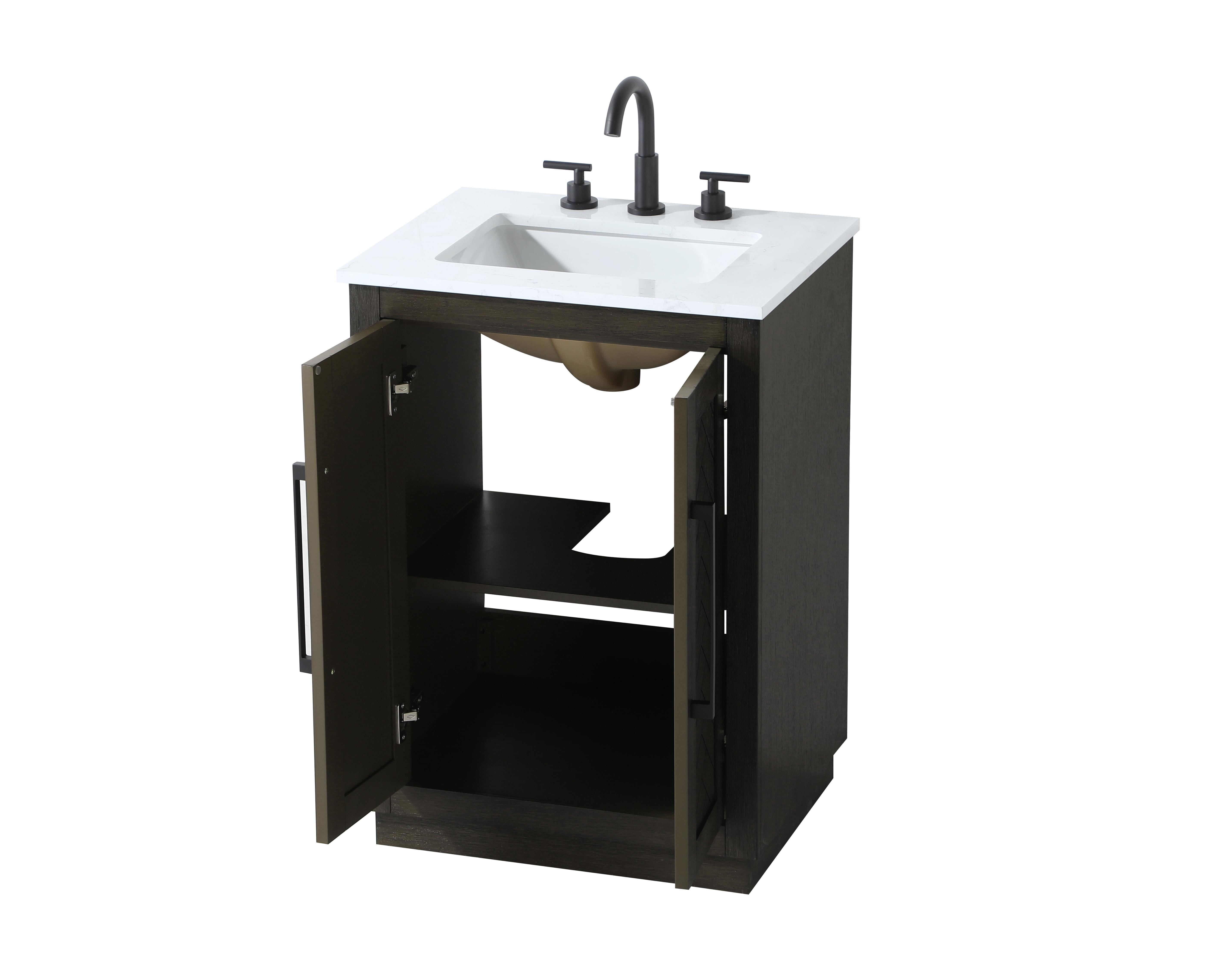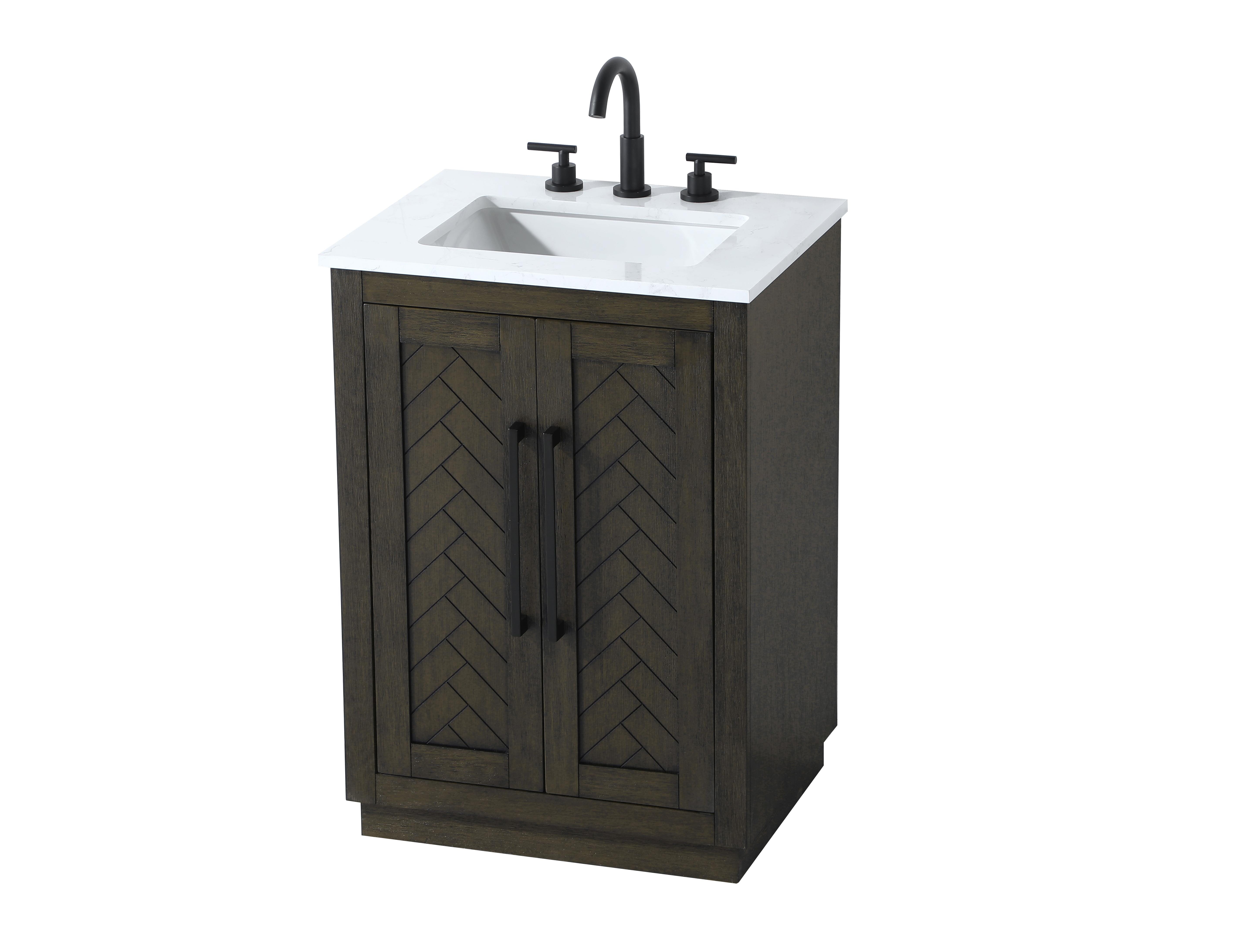 This Modern Fitting transitional bathroom vanity offers the perfect blend of timeless style and modern functionality. Available in five refined finishes-crisp white, sleek grey, chocolate oak, honey oak, and linen oak-it complements a range of decor styles, from classic to contemporary. The stunning herringbone design on the Shaker-style door panels adds texture and craftsmanship to the piece. Topped with a white engineered marble countertop featuring subtle veining, it provides both beauty and durability. The long black metal pulls on the soft-closing doors add sleek, modern detailing. Practical features include a concealed overflow, a back panel cutout for easy plumbing installation, and a U-shaped cutout shelf to fit plumbing while maximizing storage space. With a toe kick all around the base, this vanity is thoughtfully designed to blend form and function in any bathroom setting.