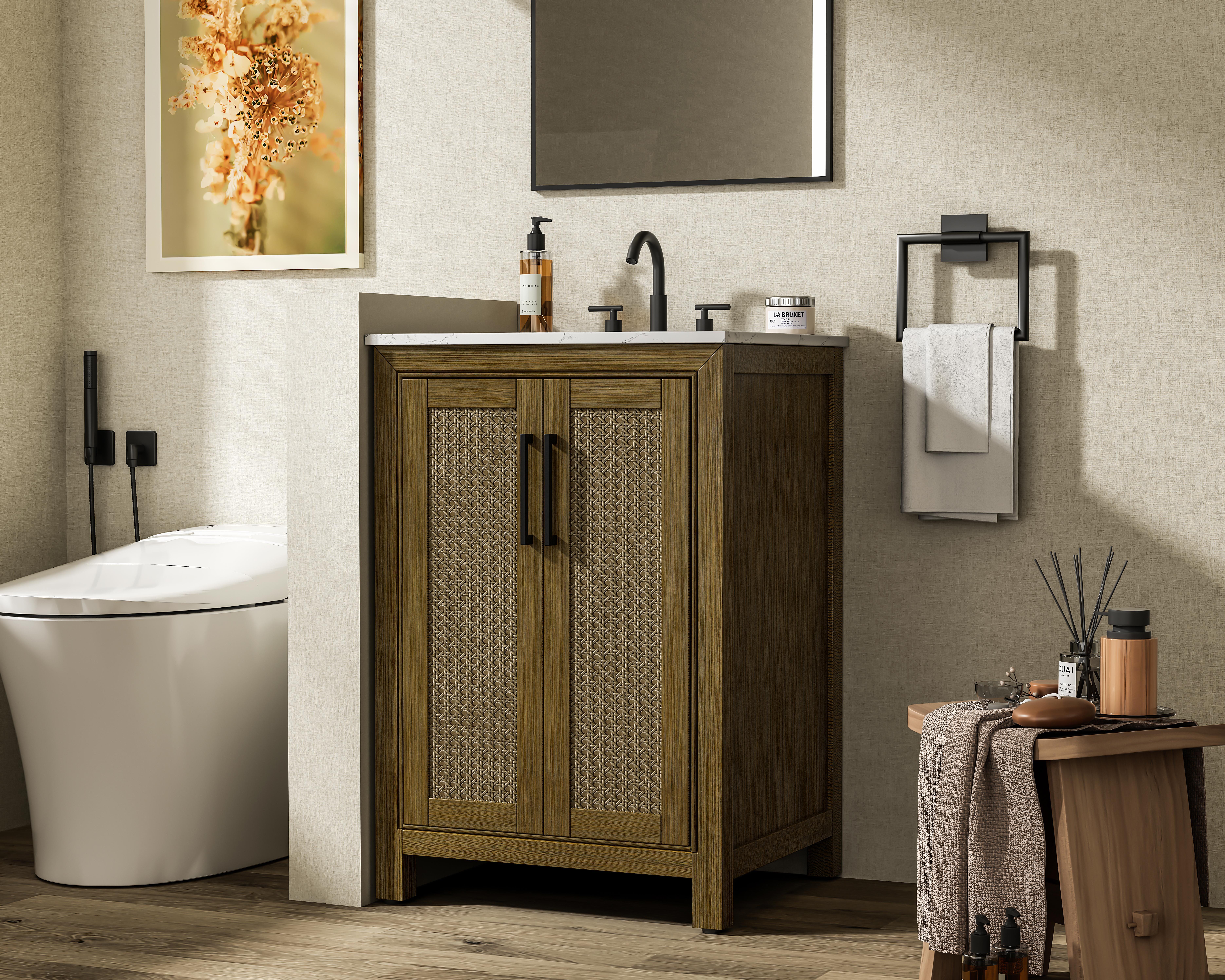 The slender black metal handle pulls on the doors and drawers offer a sleek, modern contrast to the warm wood tones, adding to the vanity's sophisticated look.