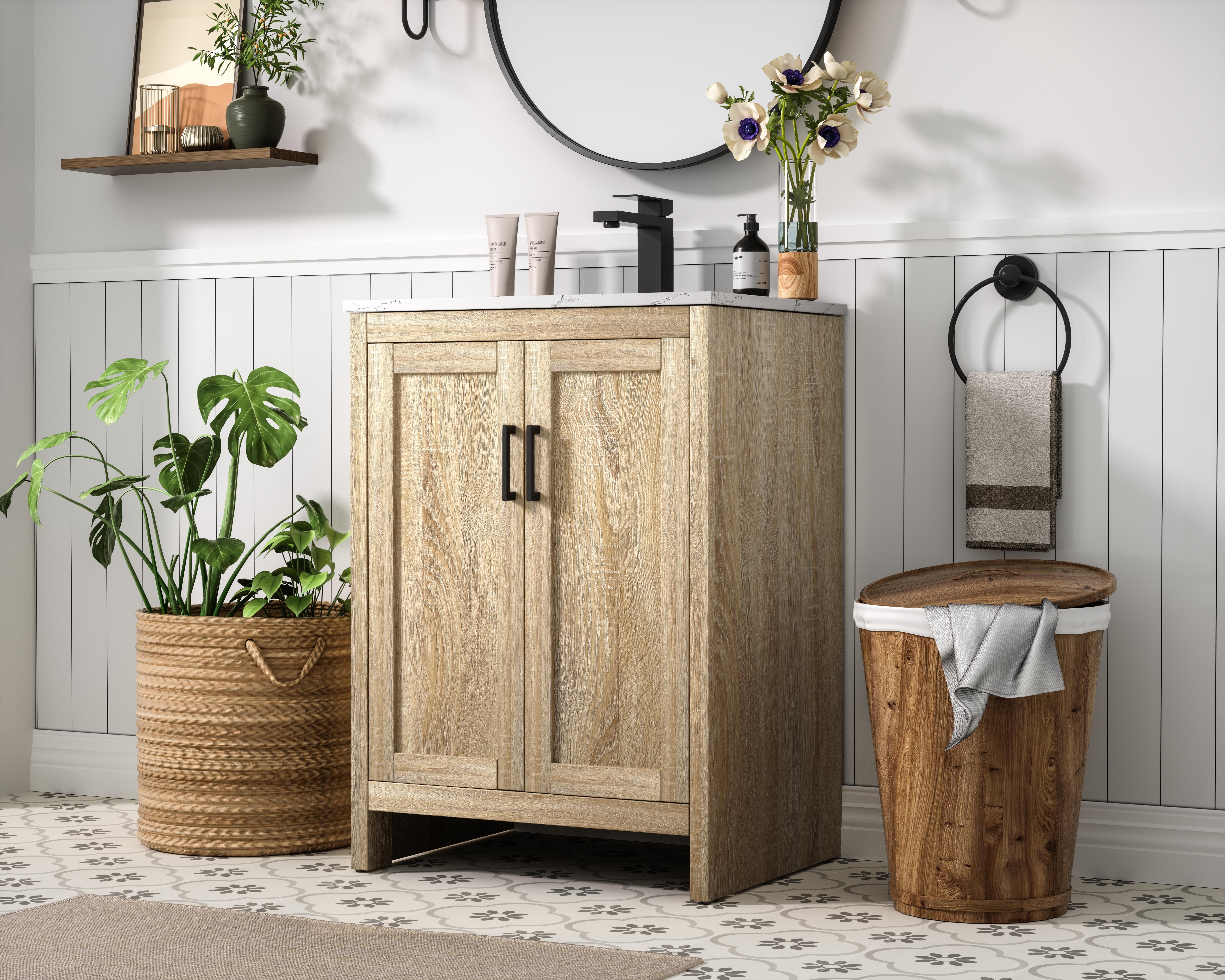 A natural wood-inspired finish adds warmth and texture to your bathroom.