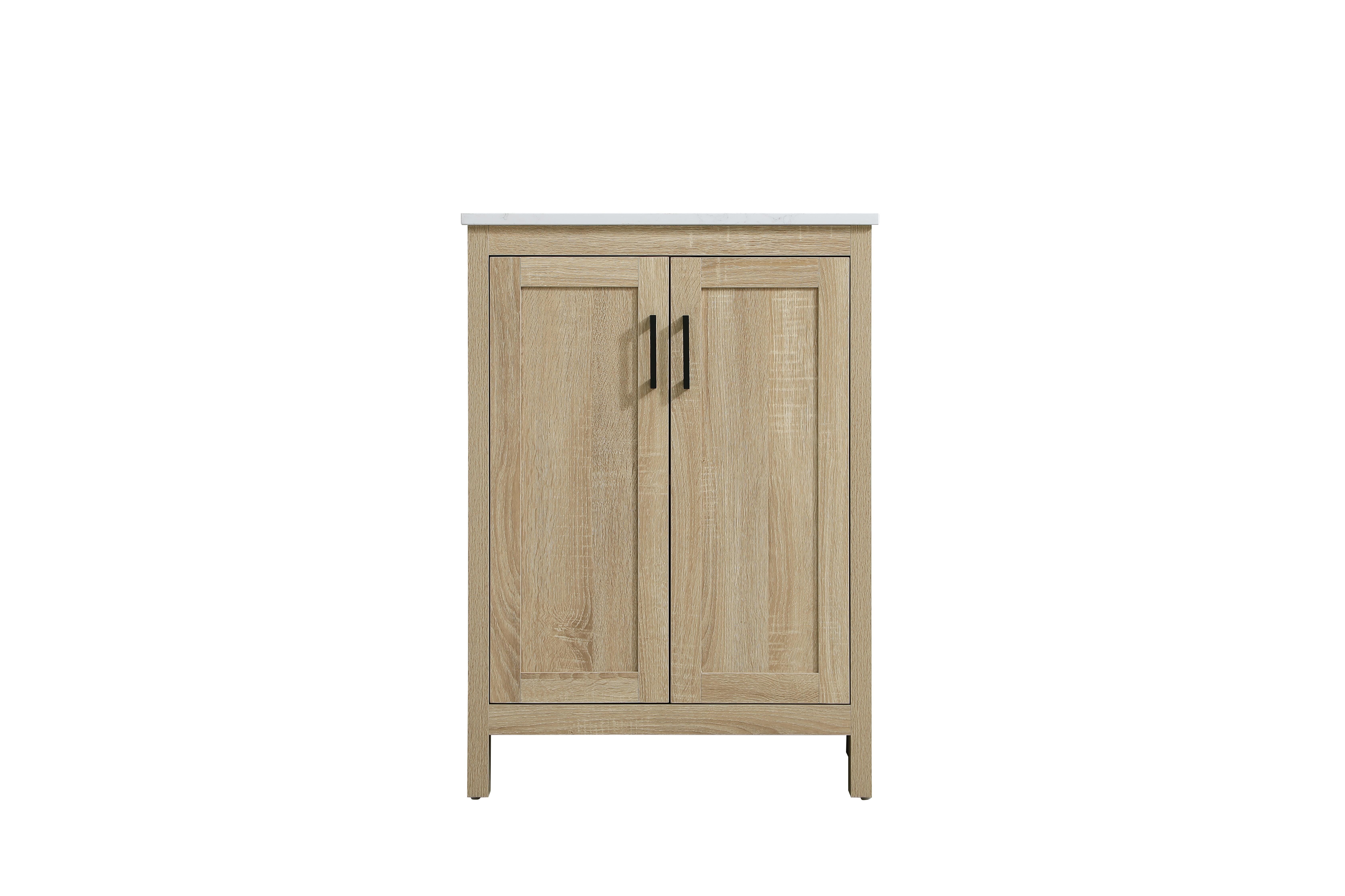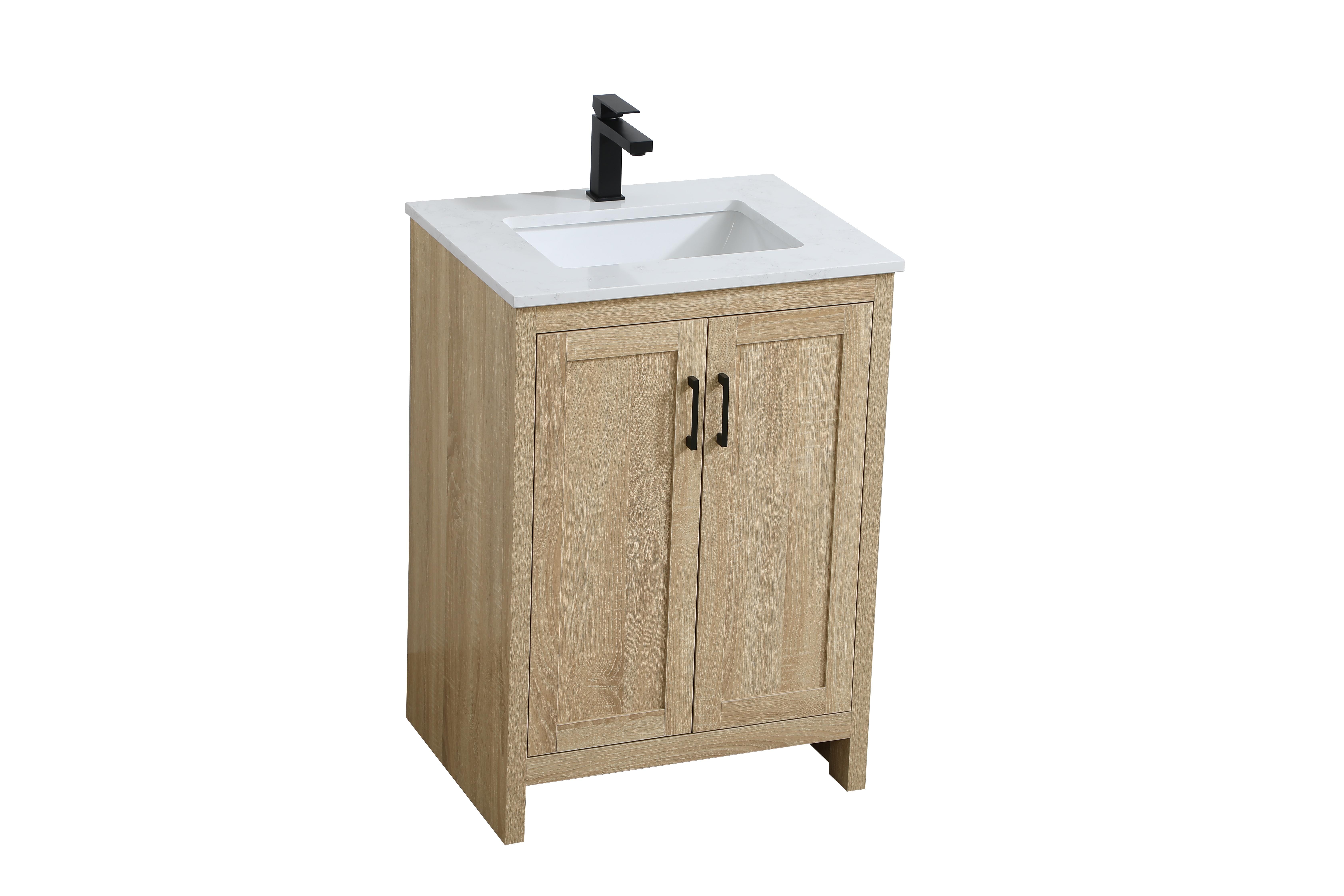 Redefine your bathroom with this transitional shaker-style vanity, designed to combine practicality with timeless aesthetics. Its clean lines and shaker-style door panels create a versatile look that complements both traditional and contemporary spaces. The engineered marble countertop, featuring a unique faux marbled pattern, adds a sophisticated focal point, while the integrated porcelain sink ensures durability and easy maintenance. The vanity includes a shelf with a smart U-shaped cutout, optimizing storage while accommodating plumbing. Crafted from sturdy MDF with a warm woodgrain finish, it brings a natural and inviting feel to your bathroom. Equipped with adjustable foot levelers for stability and a pre-drilled faucet hole for quick installation, this compact vanity delivers on both style and function. Best of all, it arrives fully assembled, ready to enhance your space right out of the box.
