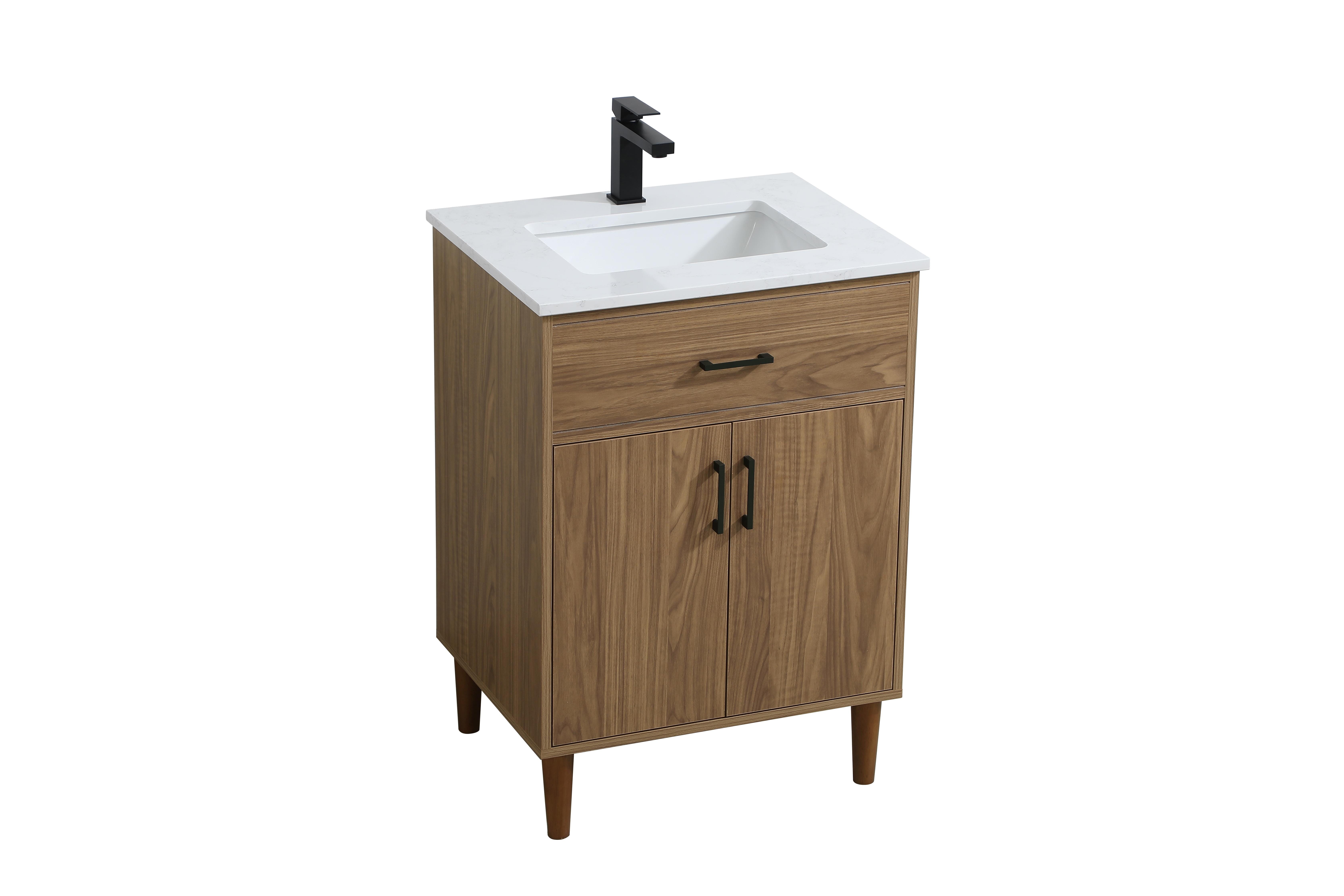Transform your bathroom with this mid-century modern vanity, designed to bring both functionality and a sense of style to your space. Its clean lines, minimalist design, and tapered solid wood legs evoke a timeless charm, perfect for blending with modern and transitional interiors. The engineered marble countertop, with its unique faux marble veining, adds a refined, luxurious touch, while the porcelain sink is both durable and easy to maintain. Practicality meets aesthetics with a faux drawer for balanced design and a spacious double-door cabinet for efficient storage. Constructed from solid wood and MDF, this vanity offers lasting durability, while adjustable foot levelers ensure stability on any floor. Shipped mostly assembled, the solid wood legs can be effortlessly twisted into place, making installation quick and hassle-free.