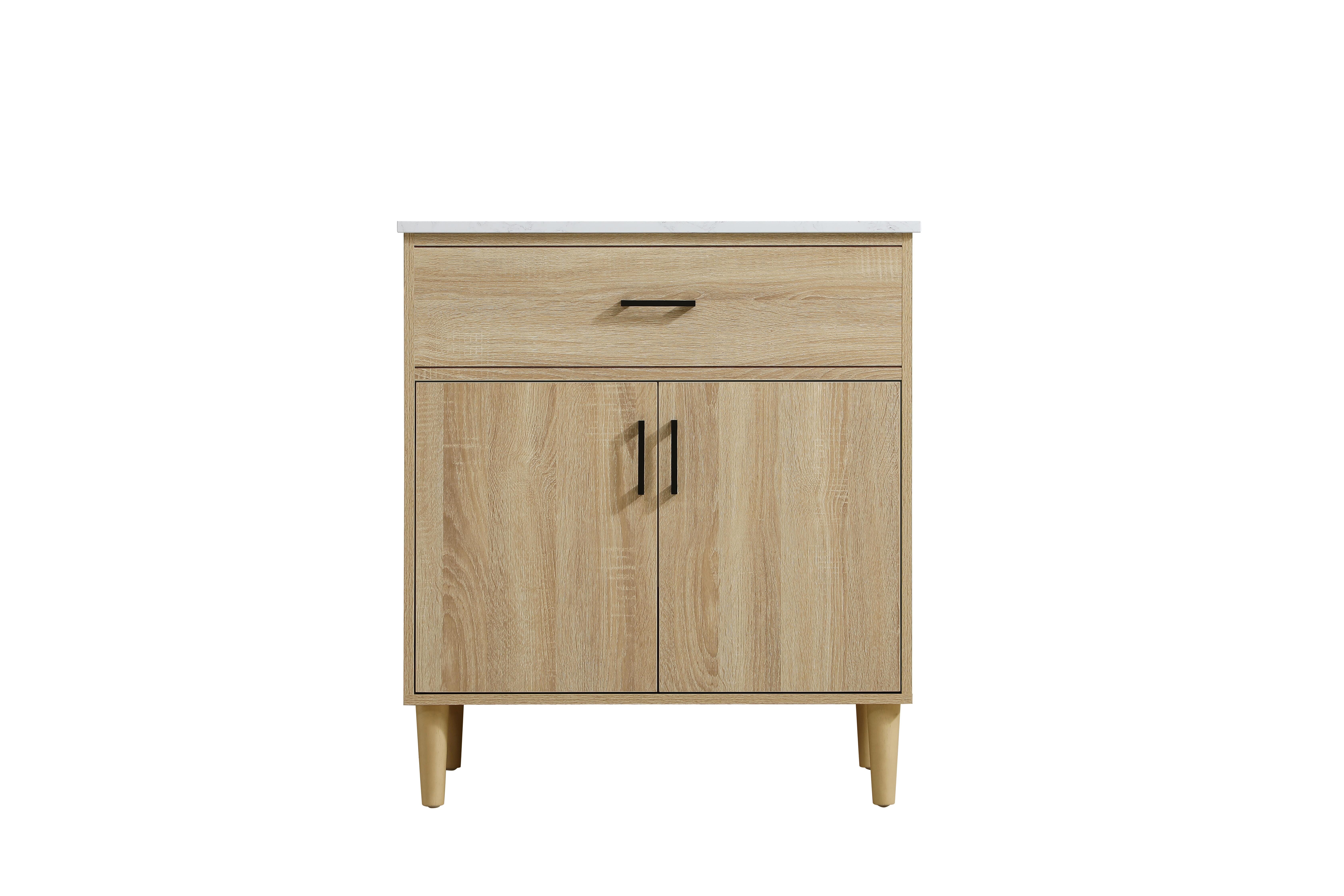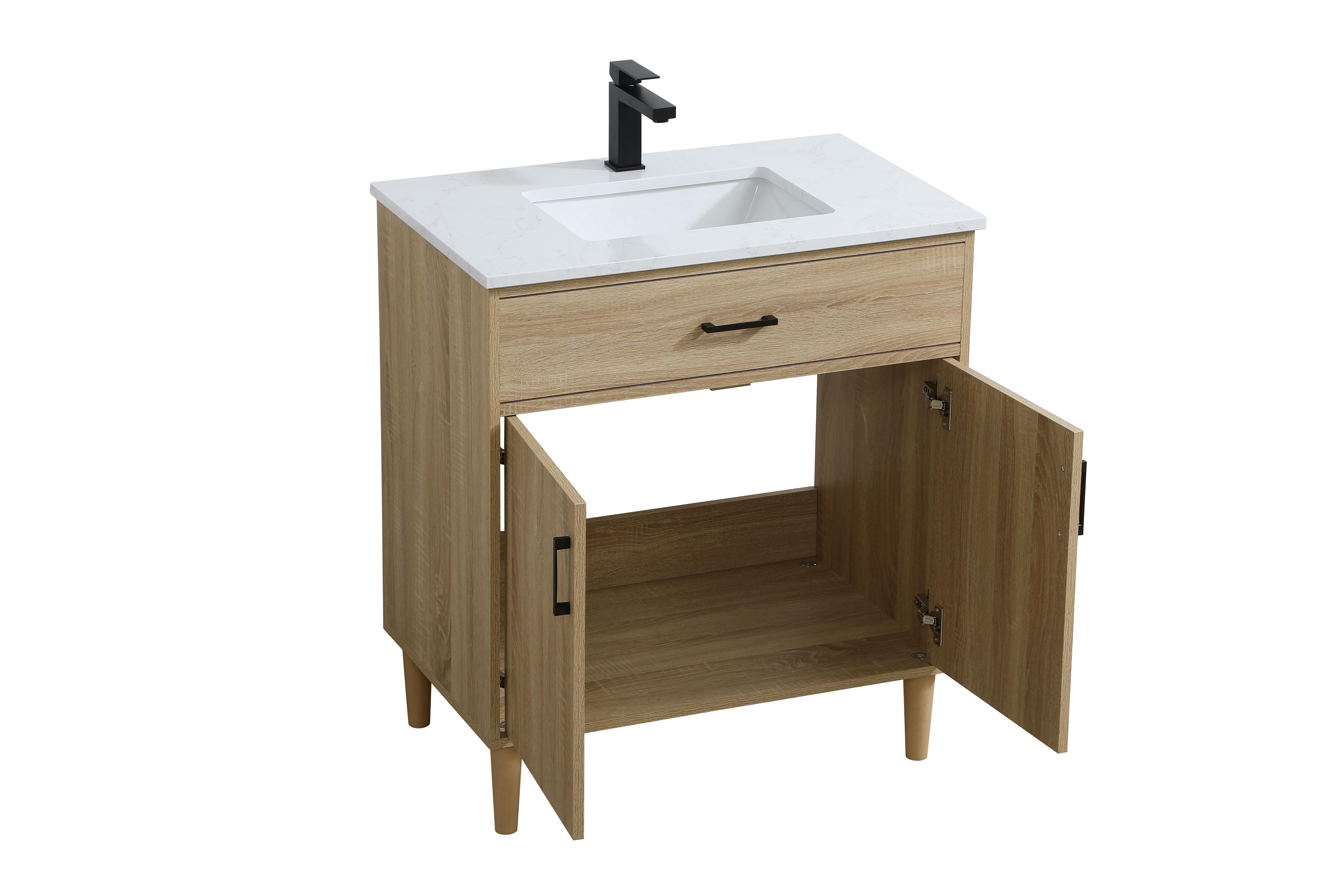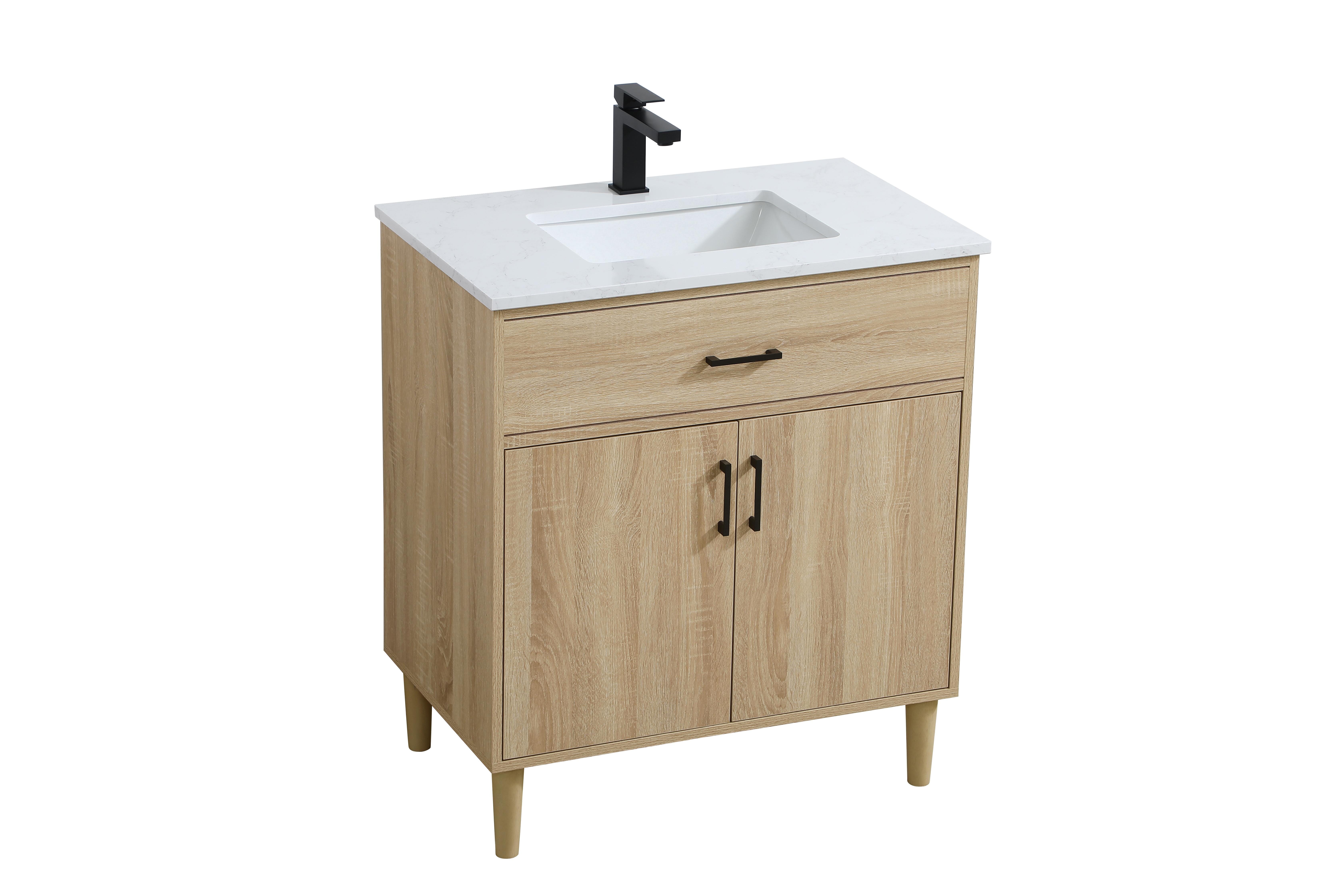 Transform your bathroom with this mid-century modern vanity, designed to bring both functionality and a sense of style to your space. Its clean lines, minimalist design, and tapered solid wood legs evoke a timeless charm, perfect for blending with modern and transitional interiors. The engineered marble countertop, with its unique faux marble veining, adds a refined, luxurious touch, while the porcelain sink is both durable and easy to maintain. Practicality meets aesthetics with a faux drawer for balanced design and a spacious double-door cabinet for efficient storage. Constructed from solid wood and MDF, this vanity offers lasting durability, while adjustable foot levelers ensure stability on any floor. Shipped mostly assembled, the solid wood legs can be effortlessly twisted into place, making installation quick and hassle-free.