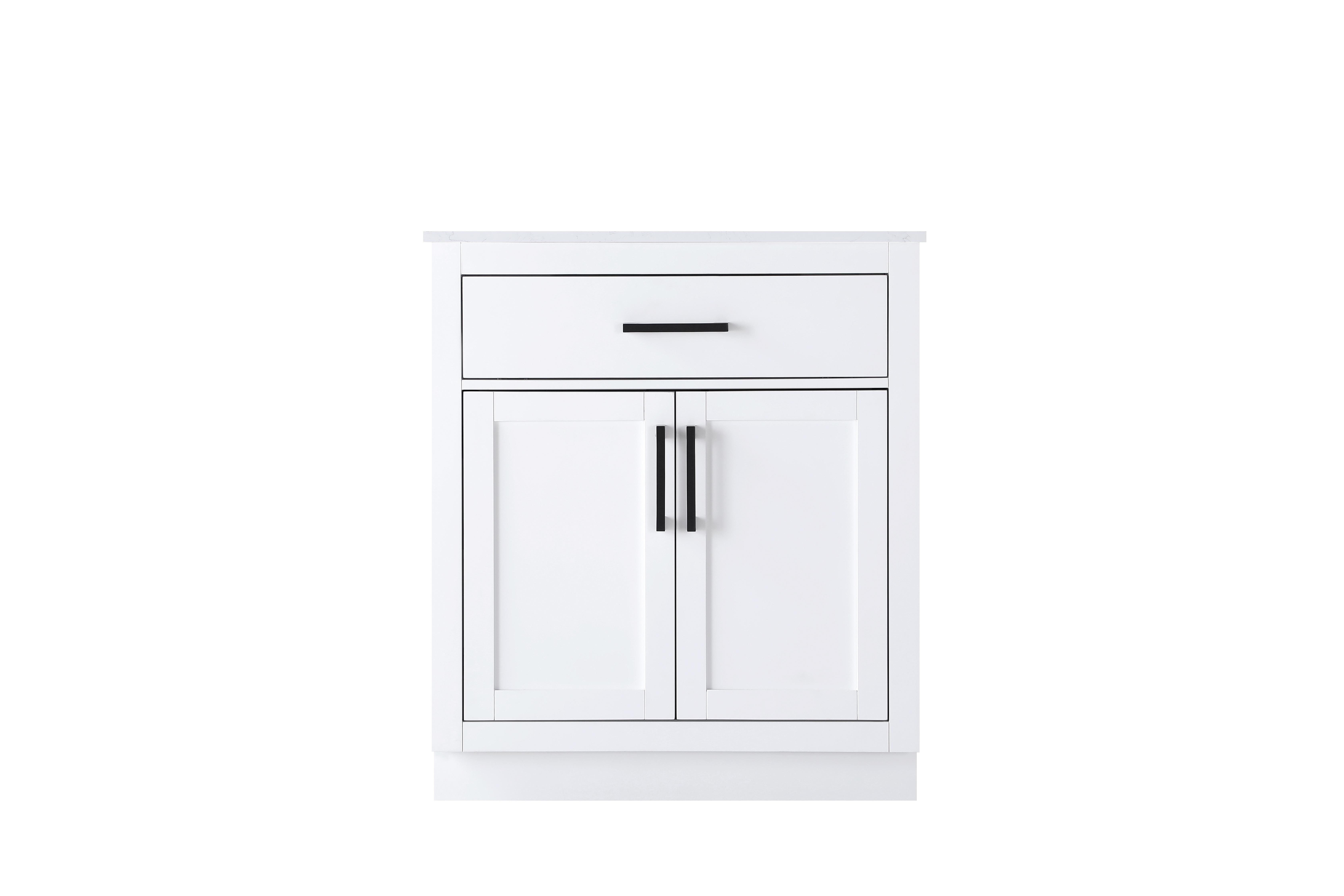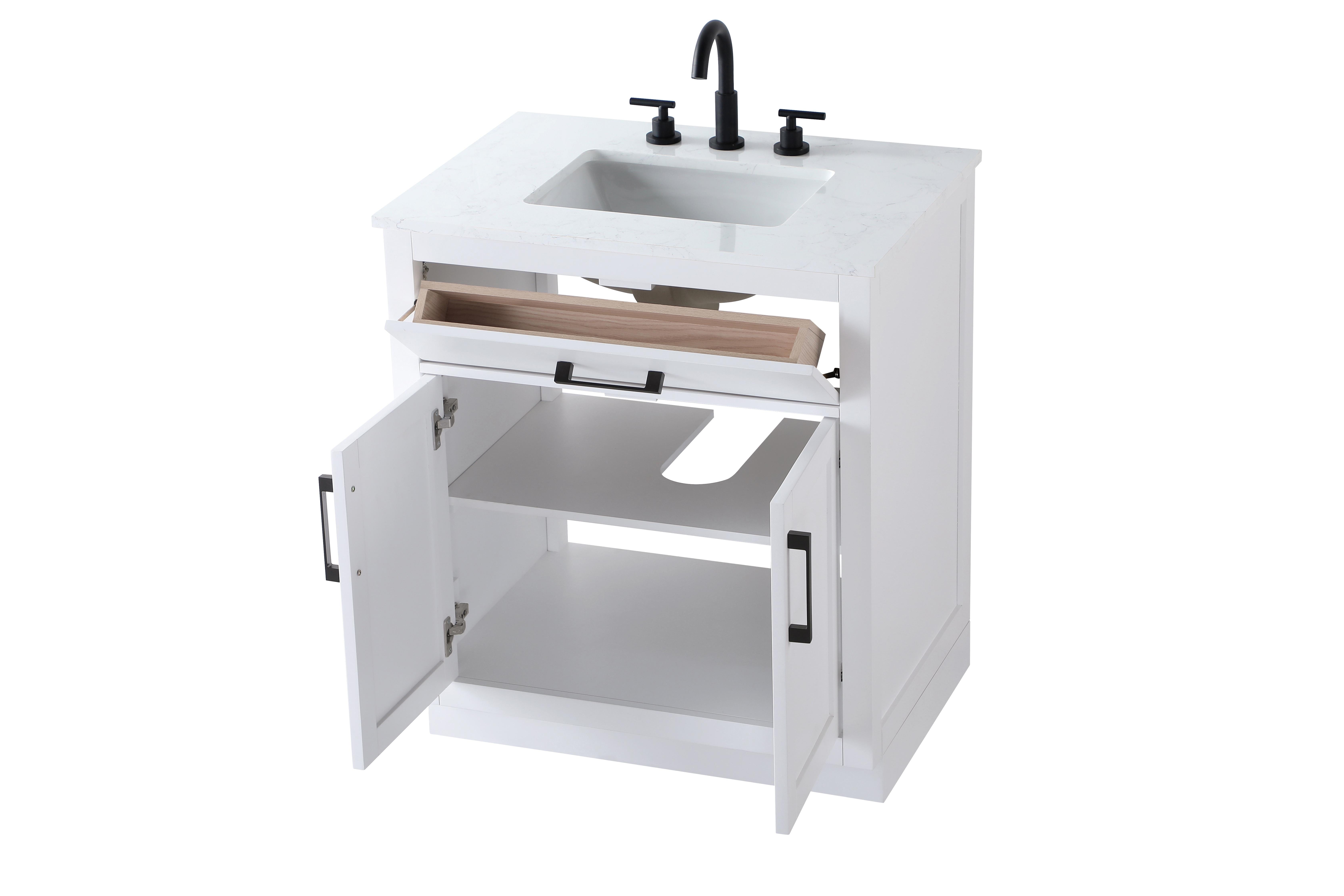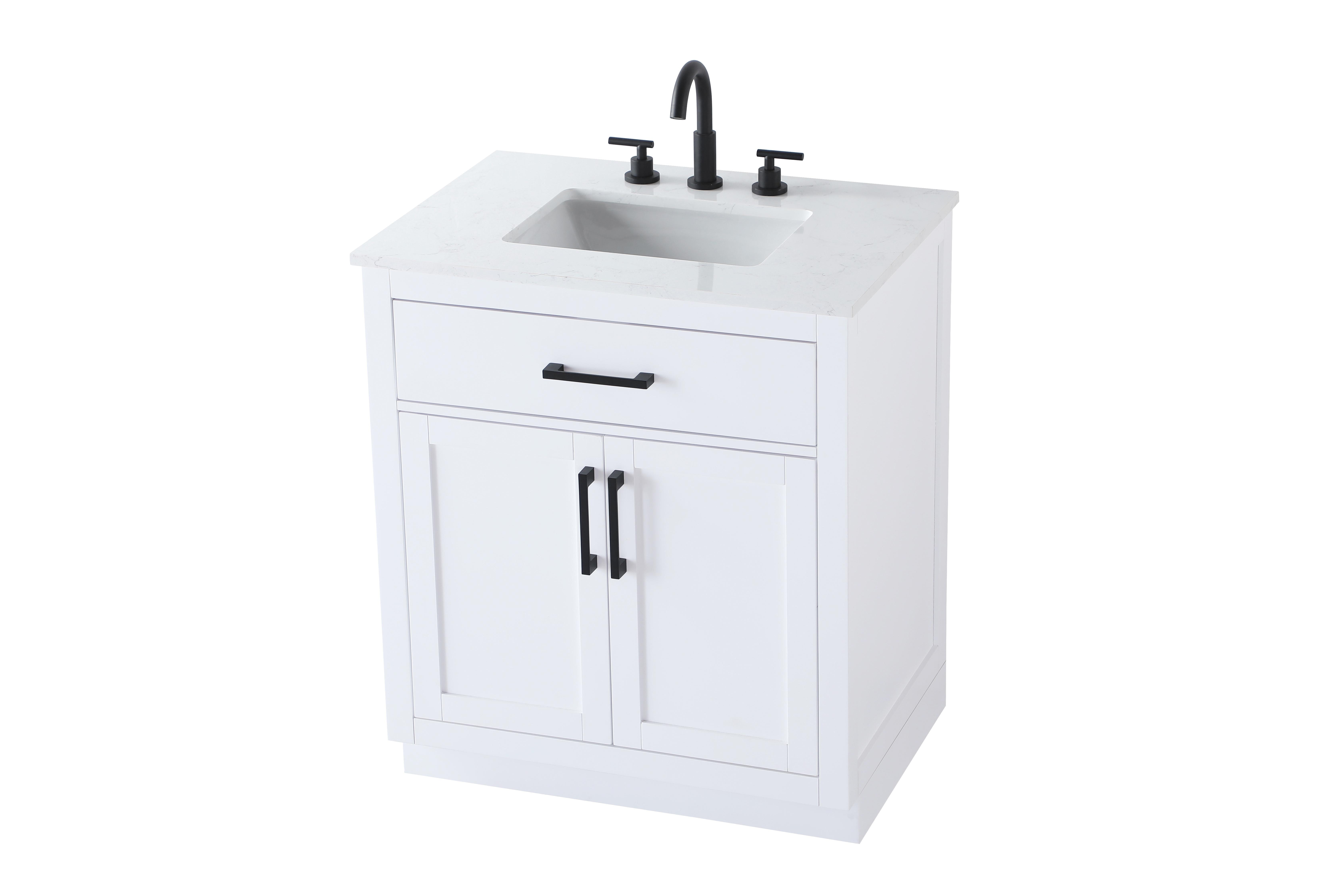 Introduce a perfect balance of functionality and style to your bathroom with this thoughtfully designed vanity. Constructed with a combination of solid wood and MDF, it offers durability and a sturdy build. The sleek engineered marble countertop with subtle grey marbling complements the rustic wood grain finish, creating a stylish and inviting centerpiece for your bathroom. Designed in a contemporary style with a transitional flair, it features a U-shaped shelf for seamless plumbing integration and multiple soft-close drawers for clutter-free organization. A pull-down drawer enhances convenience, while the toe kick adds a refined, clean-lined appearance and simplifies cleaning underneath. Matte black hardware contrasts beautifully with the cabinet finish, tying the look together. Delivered fully assembled and equipped with foot levelers, this vanity combines practicality and aesthetic appeal to suit modern and transitional bathrooms alike.