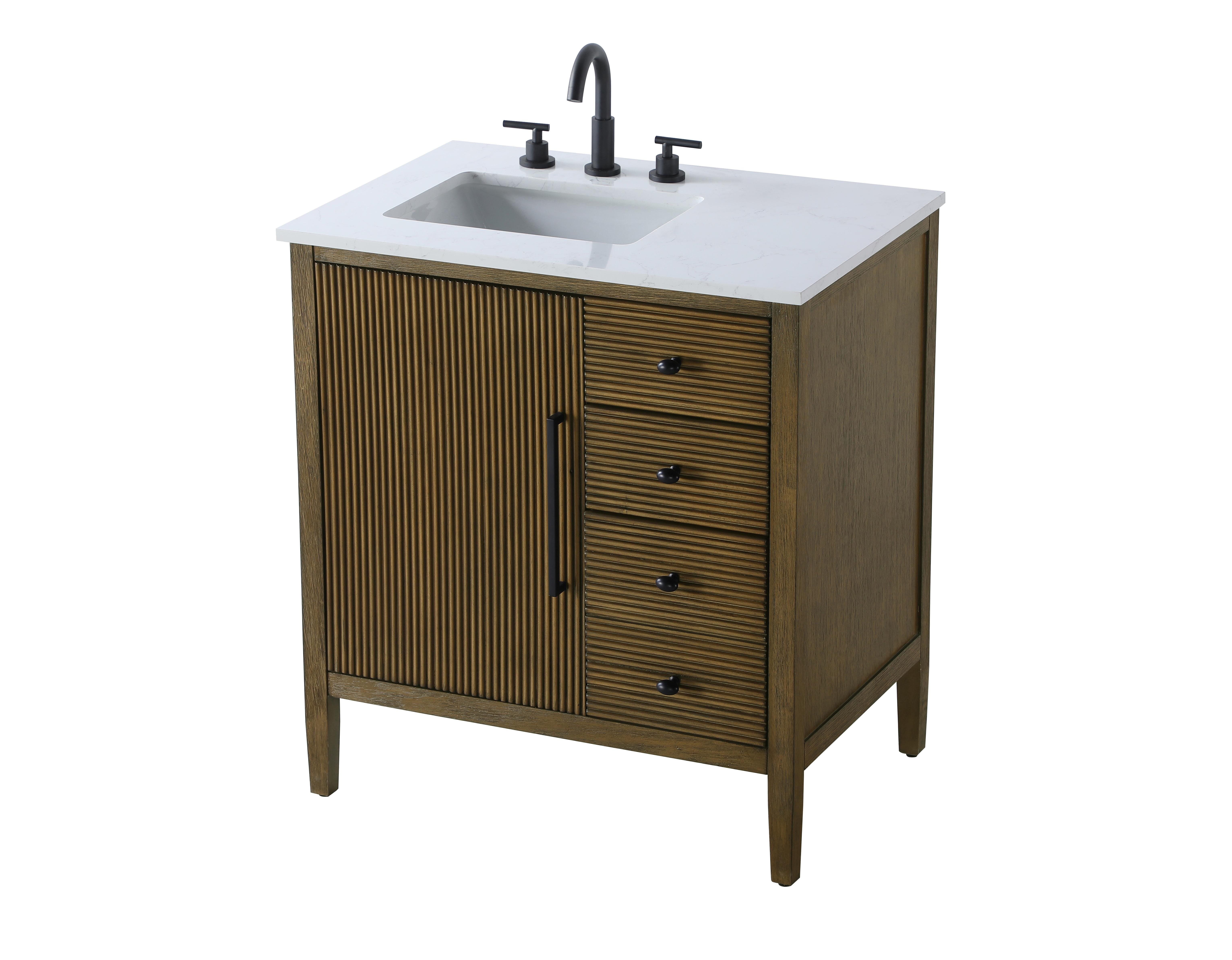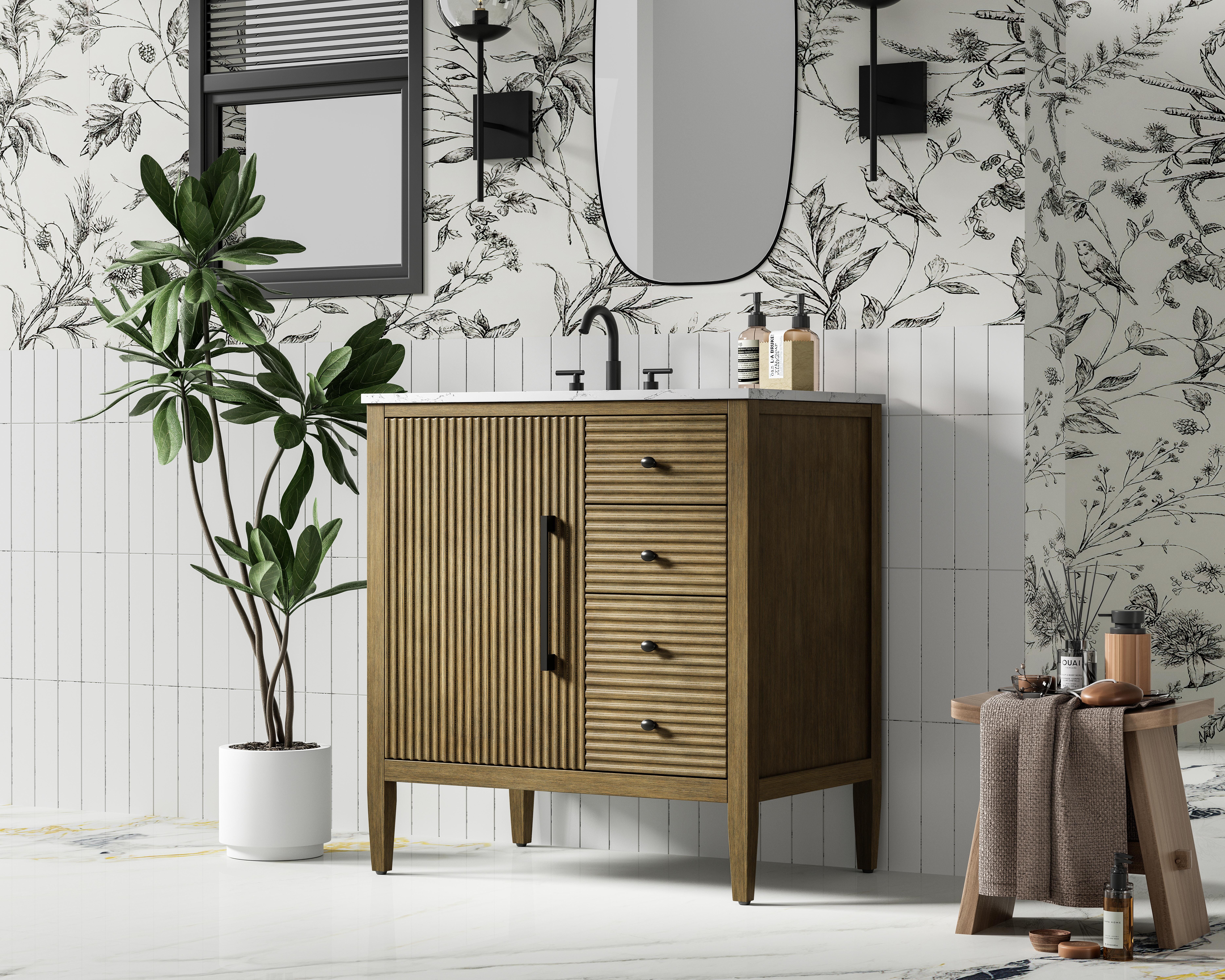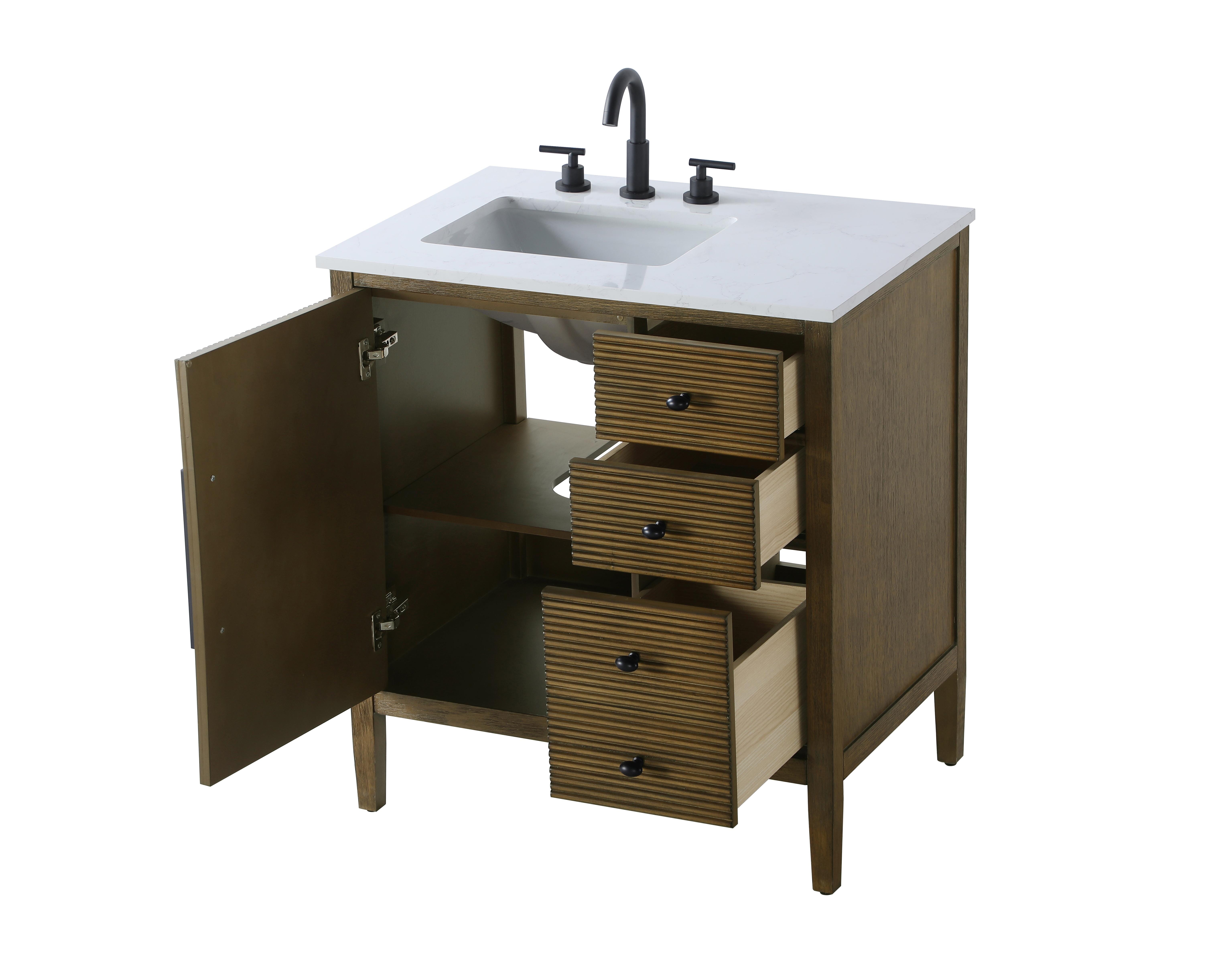 Designed with transitional elegance in mind, this Modern Fitting bathroom vanity seamlessly blends traditional elements with modern functionality. Available in five stunning finishes, from the clean sophistication of Crisp White to the natural warmth of Honey Oak, the fluted door and drawer panels add subtle texture and charm. The white marble countertop with natural veining exudes luxury, while the soft-closing doors with sleek black metal pulls offer a quiet, refined experience. Practicality is never compromised, with features like the U-shaped shelf for plumbing, and pre-drilled faucet holes for easy customization. Whether your style leans modern or classic, this vanity is the perfect balance of beauty and function, appealing to customers with a taste for quality and style.