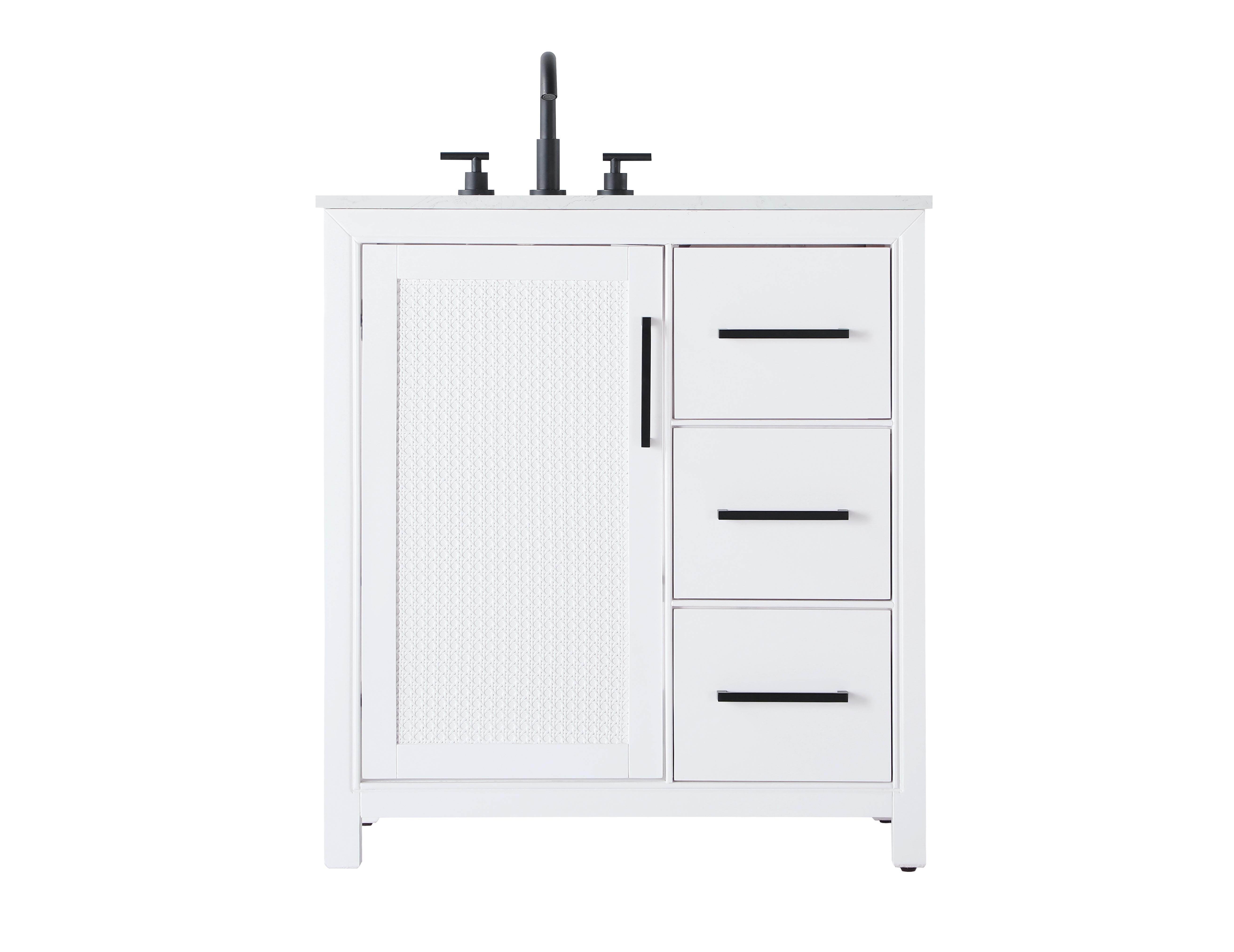 The shaker-style door panels feature a subtle caning design, adding texture and visual interest while maintaining a clean and timeless aesthetic.