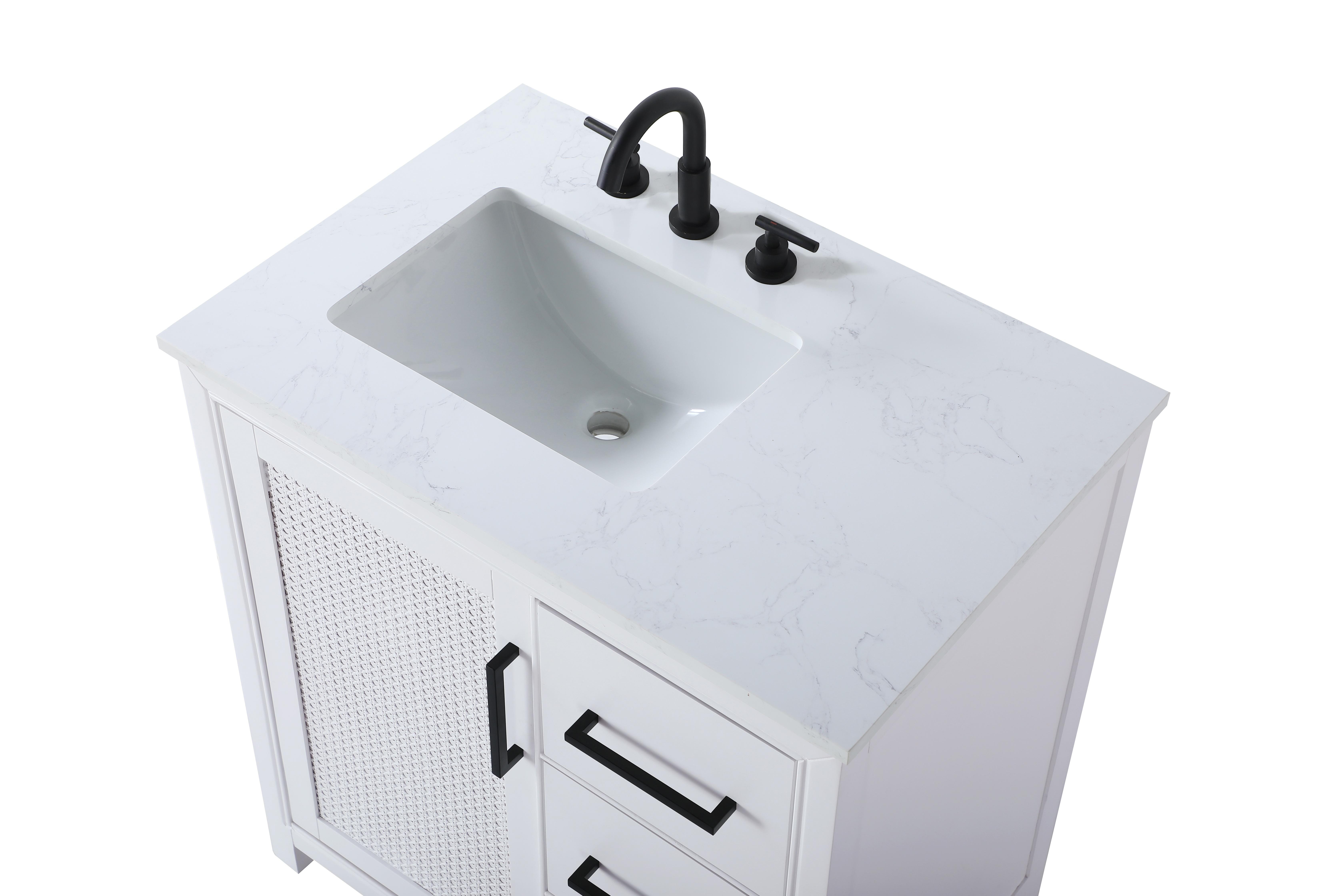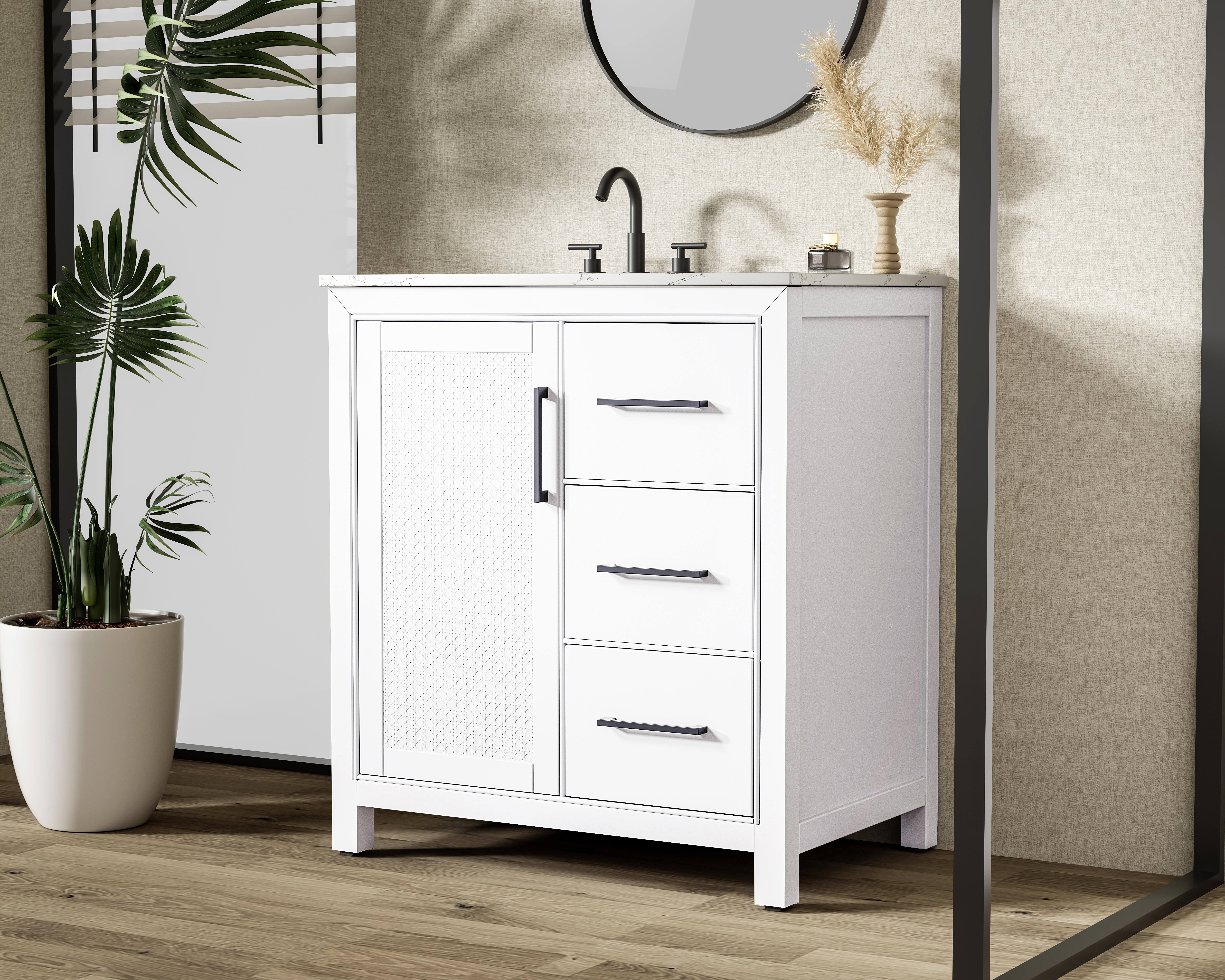 Perfect for those with an eye for detail and quality, this Modern Fitting transitional vanity blends modern design with timeless elegance. Available in five stunning finishes, from Crisp White to Linen Oak, the wood grain visuals of the oak options bring warmth and character to any bathroom. The caning design on the Shaker-style door panels adds texture and a touch of refinement, while the soft-closing doors ensure smooth, quiet functionality. Topped with a white marble countertop, the vanity offers both luxury and practicality, complete with pre-drilled faucet holes for customization. A concealed overflow and U-shaped shelf for plumbing make installation effortless, and the slender black metal pulls provide a sleek contrast.
