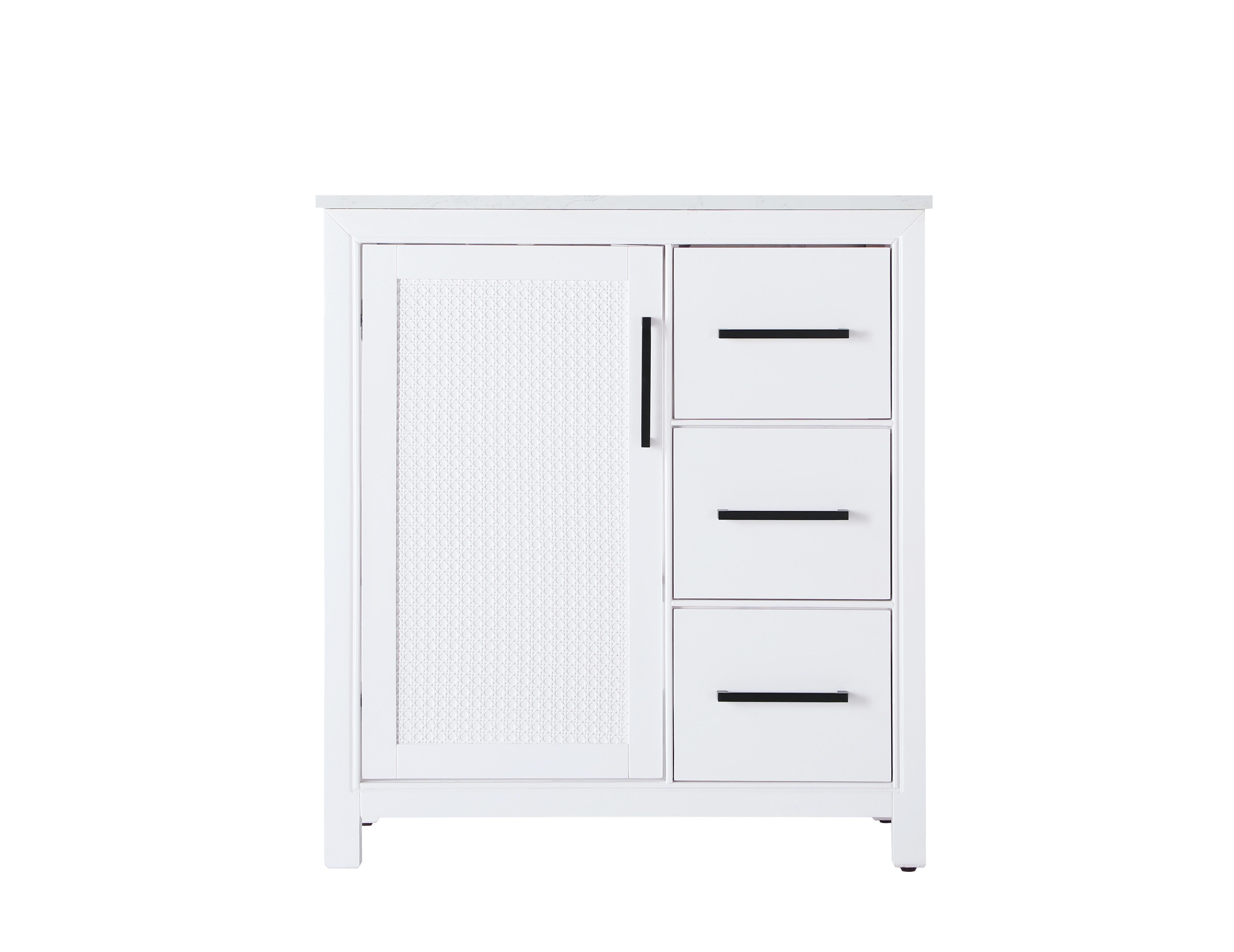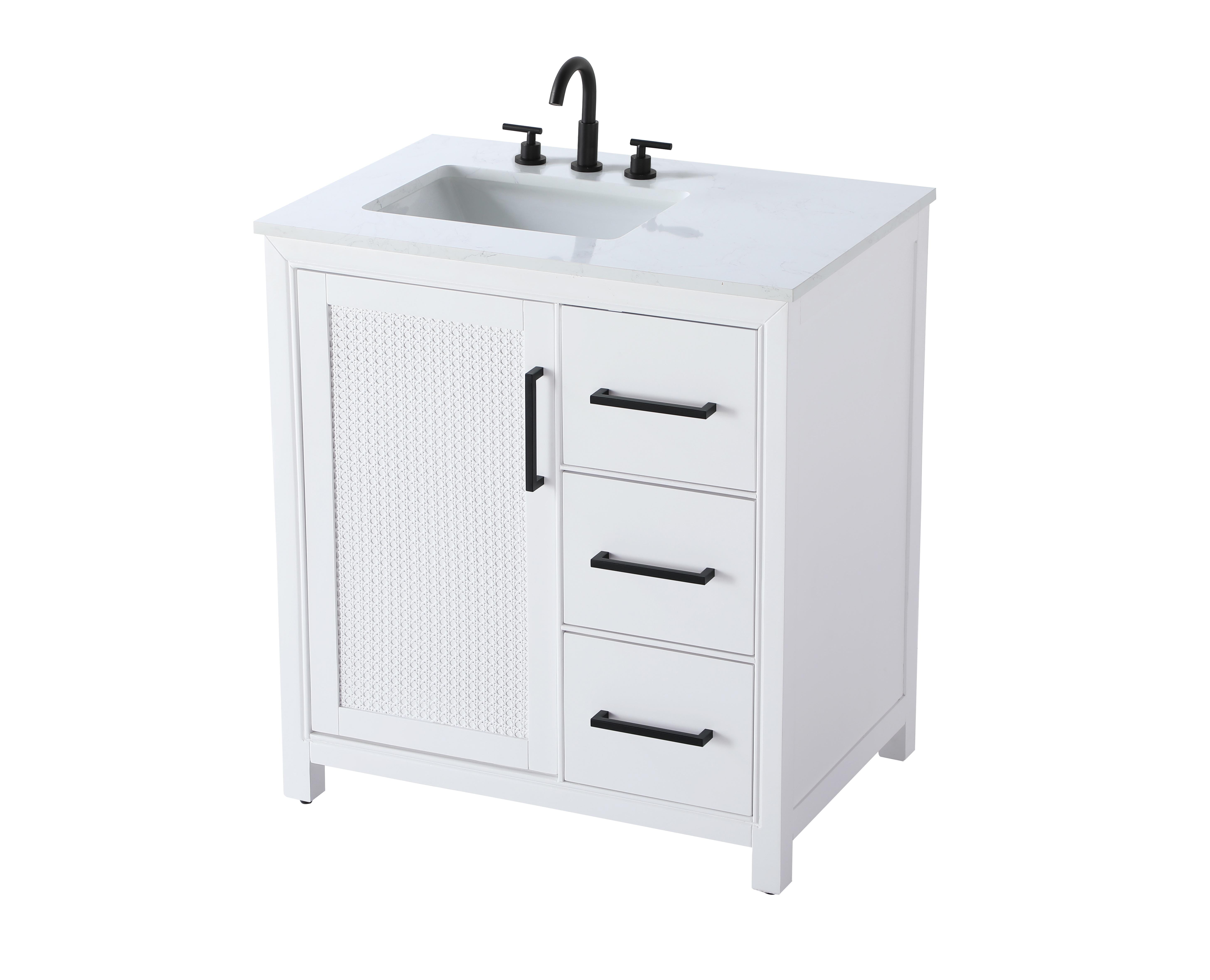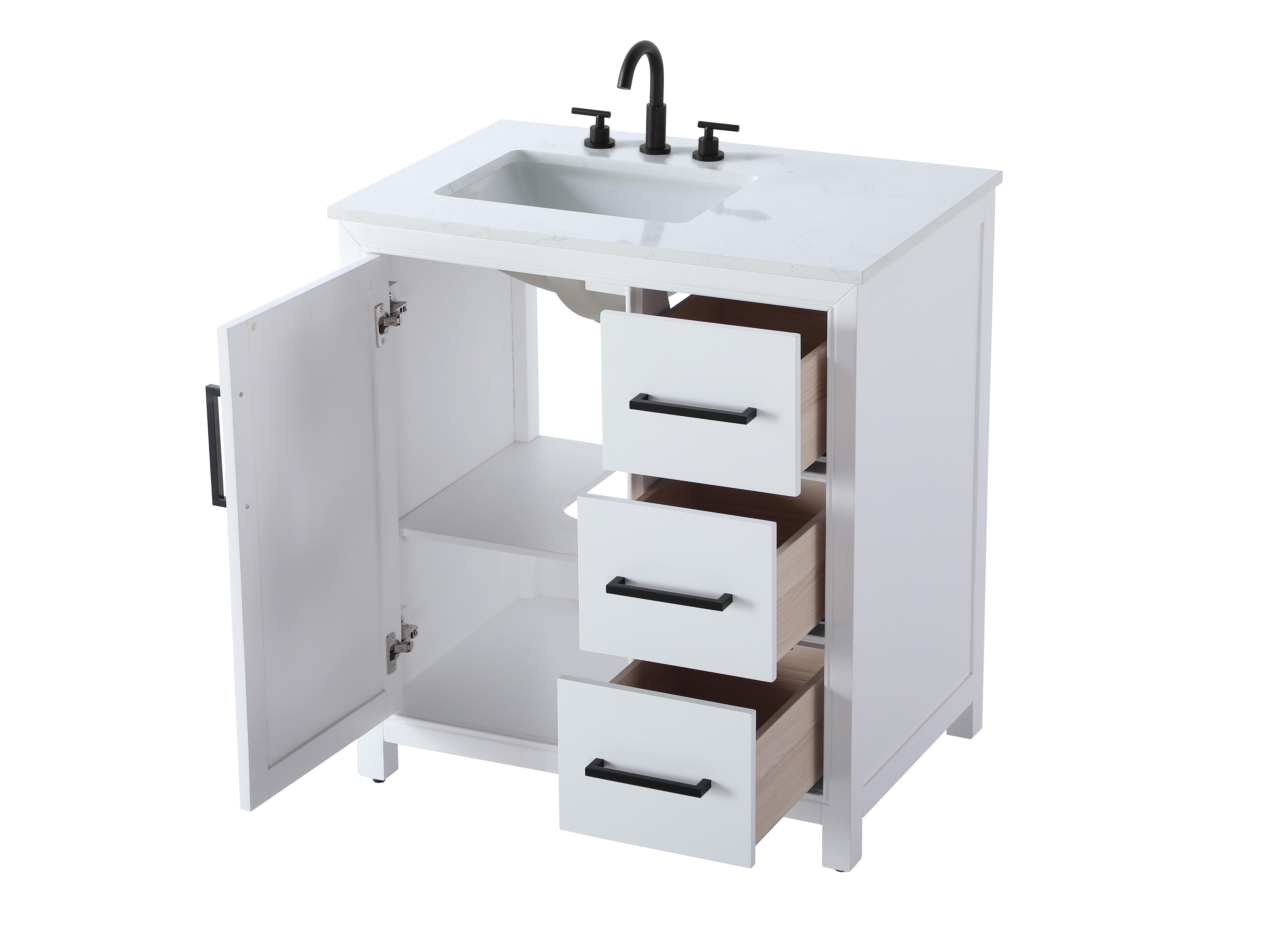 The slender black metal handle pulls on the doors and drawers offer a sleek, modern contrast to the white finish, adding to the vanity's sophisticated look.