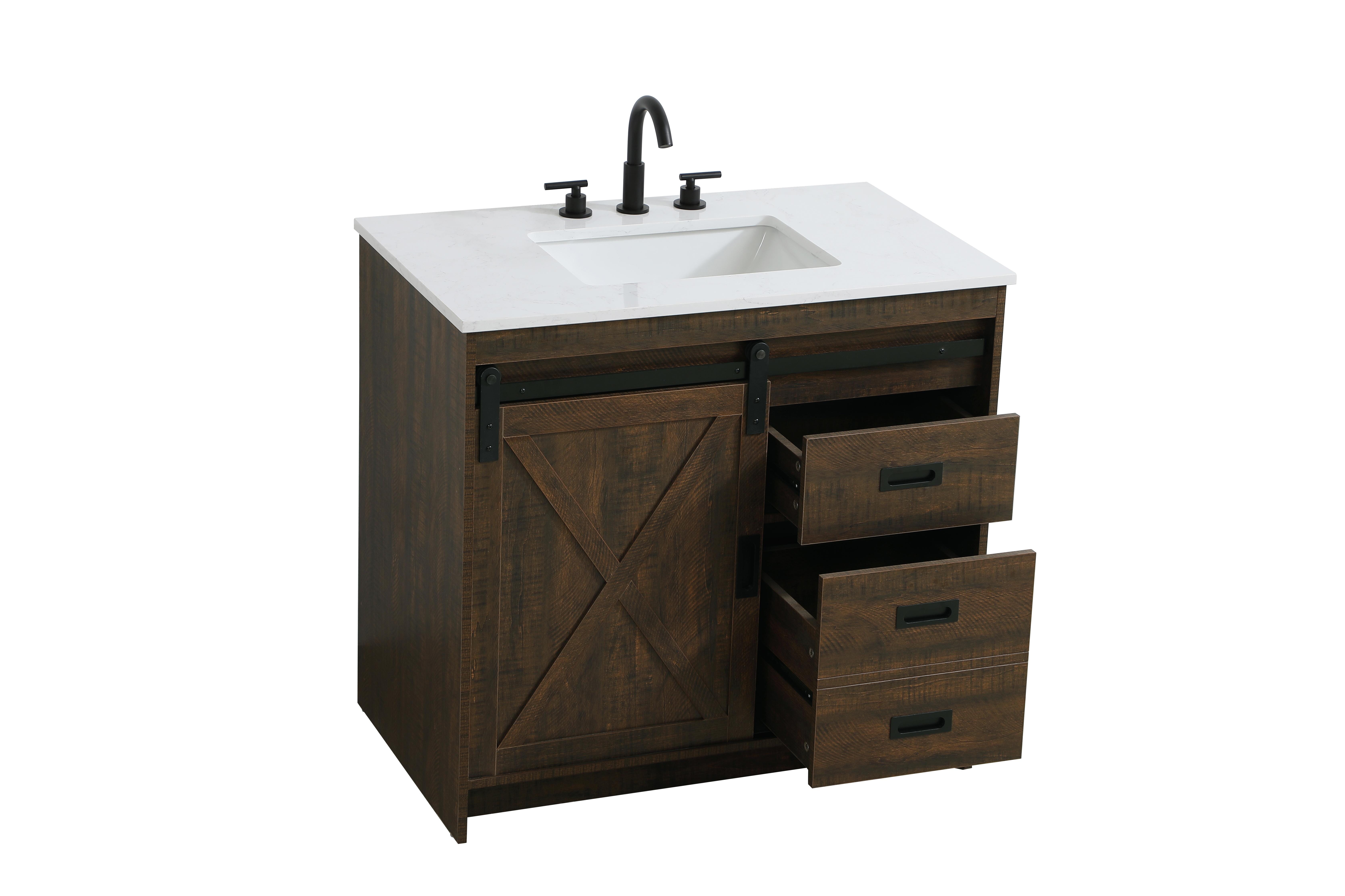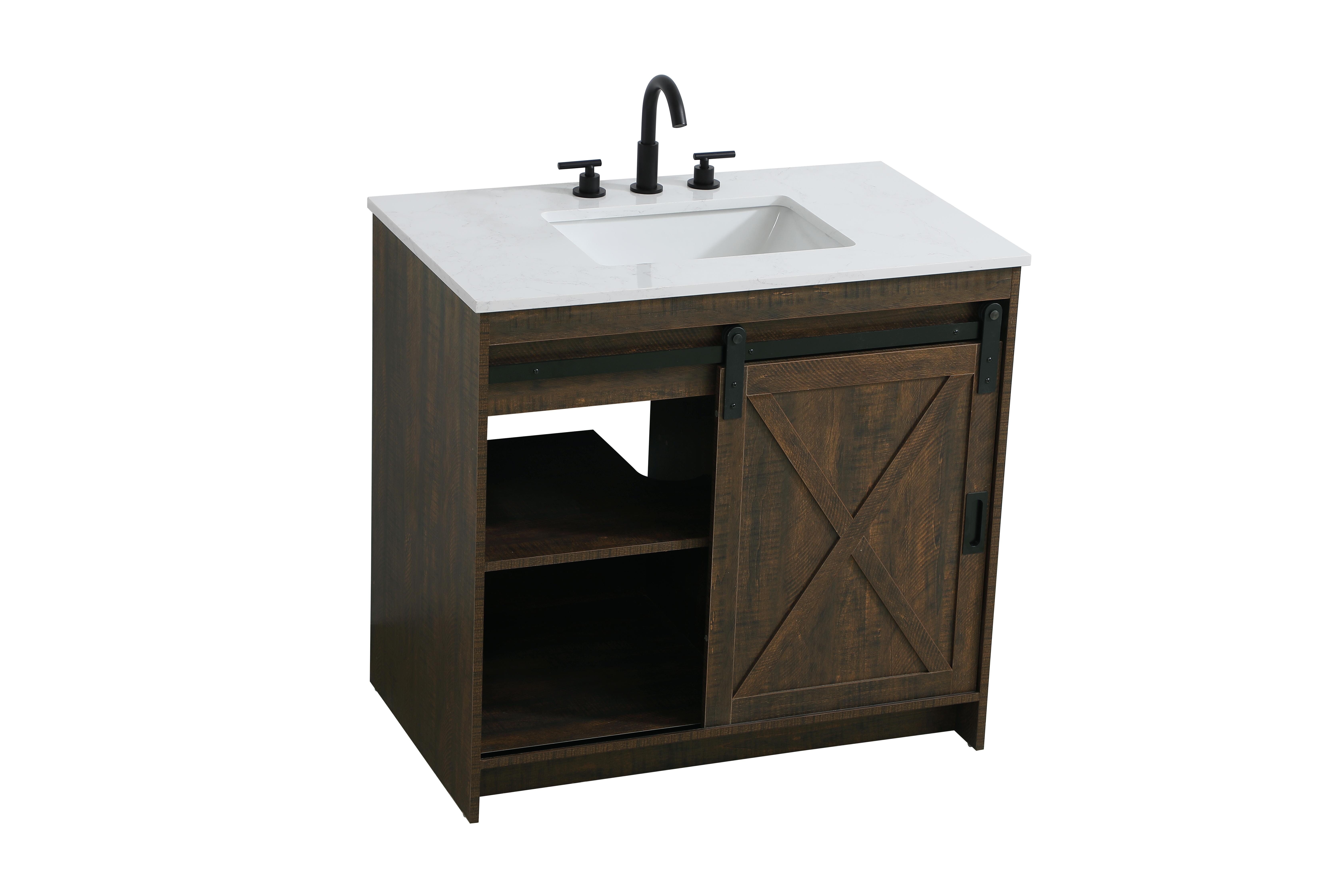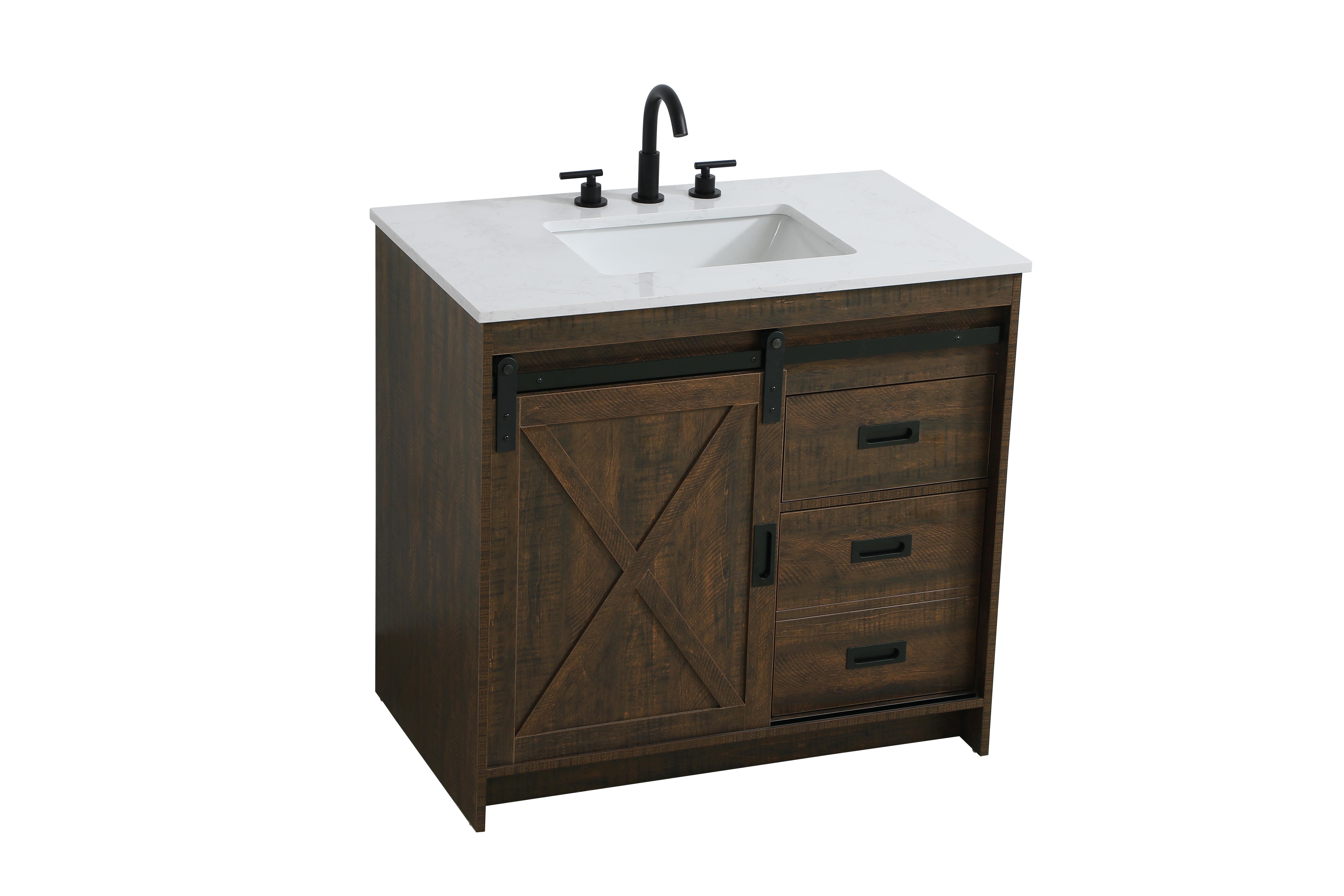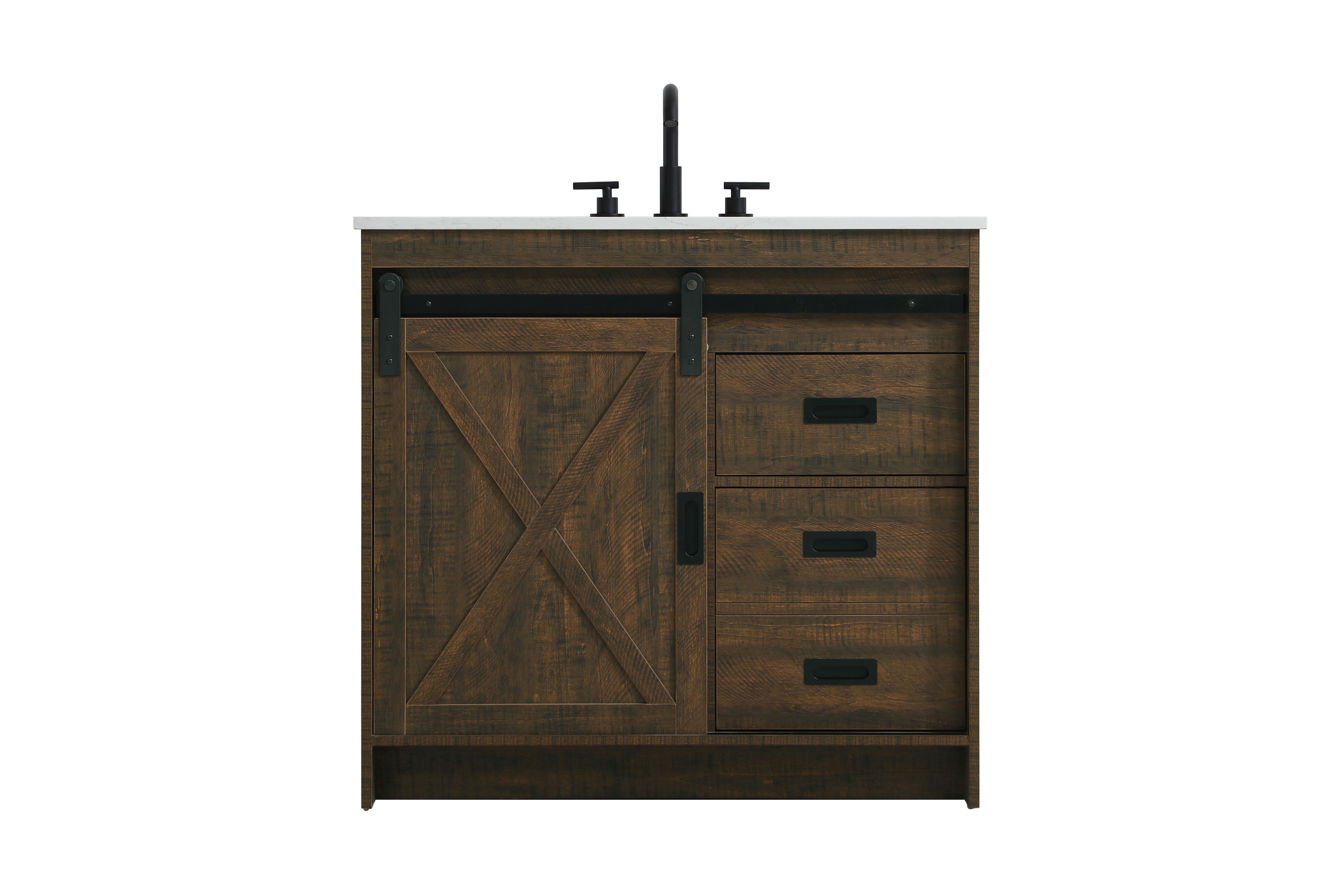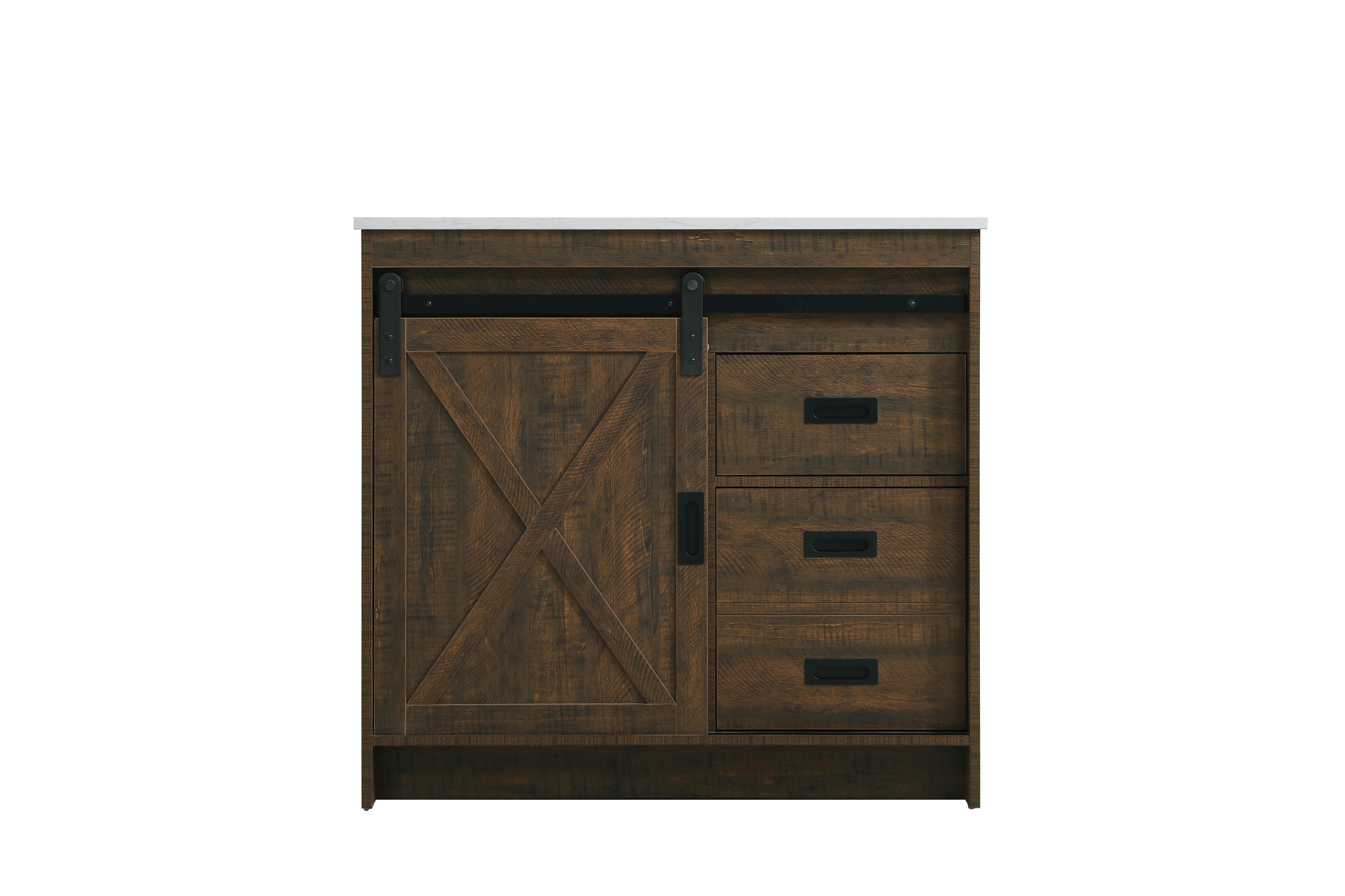 Transform your bathroom with this rustic barnyard-style vanity, designed to balance aesthetic appeal and functionality. Featuring a sliding barn door with black metal hardware and complementary handle pulls, this piece blends rugged charm with practical design. The engineered marble countertop displays unique marbling, while the porcelain undermount sink offers easy maintenance and durability. Available in Espresso, Natural Oak, and Rustic Grey finishes, this vanity suits a range of styles. It includes a deep storage drawer for larger items, a hidden shelf for towels or decor, and adjustable foot levelers for added stability on uneven floors. With pre-drilled faucet holes for easy setup, this vanity delivers style and substance to enhance your bathroom.