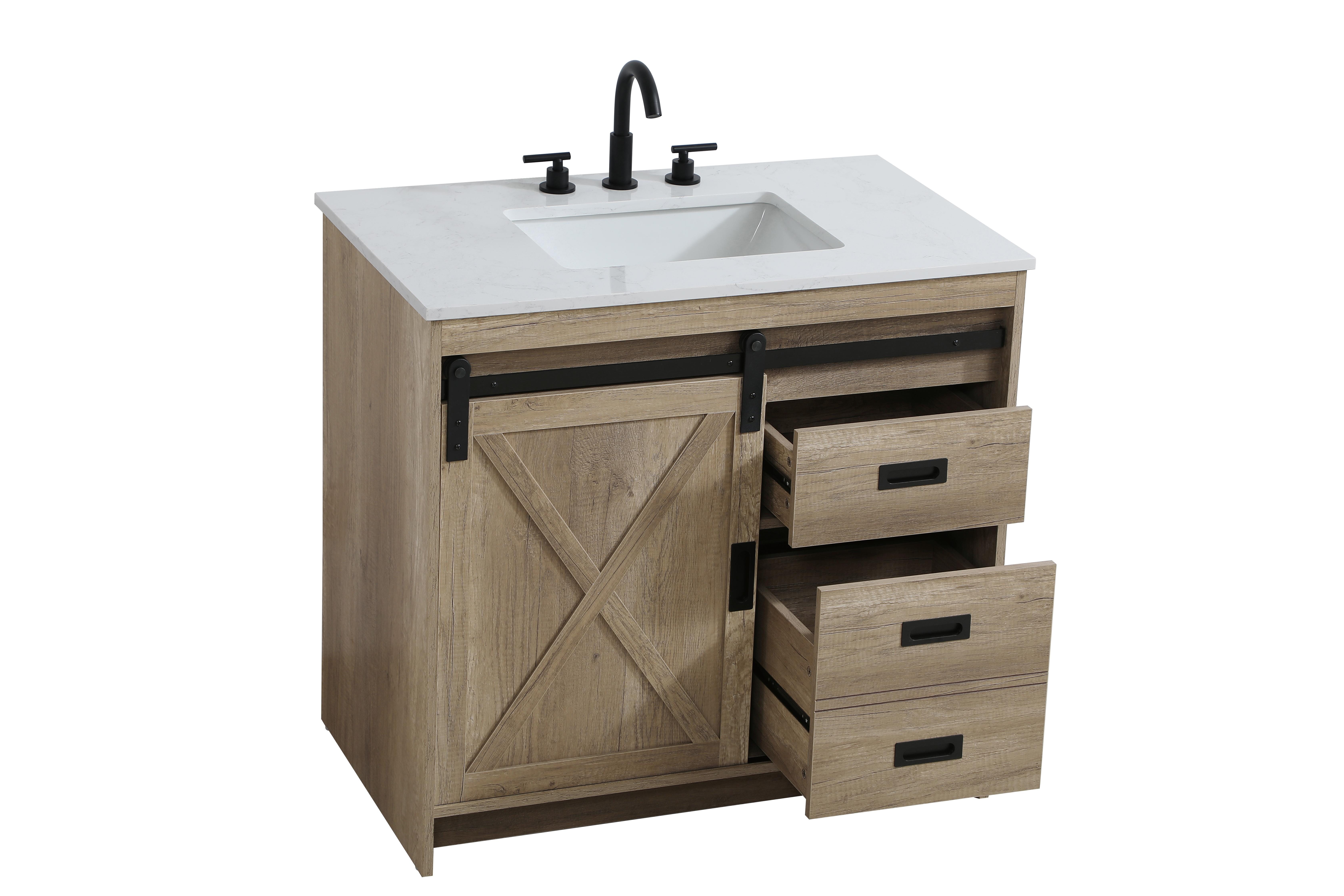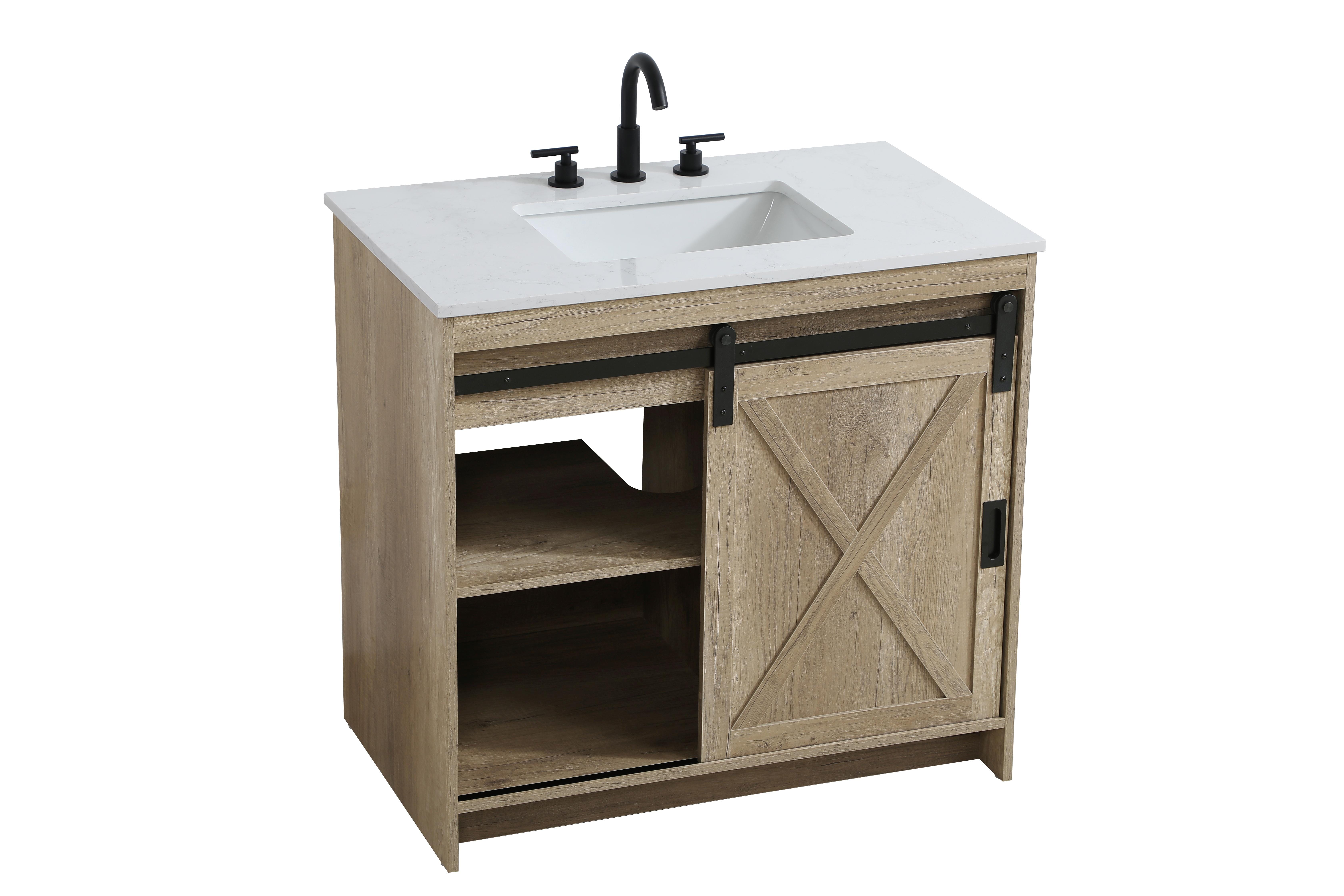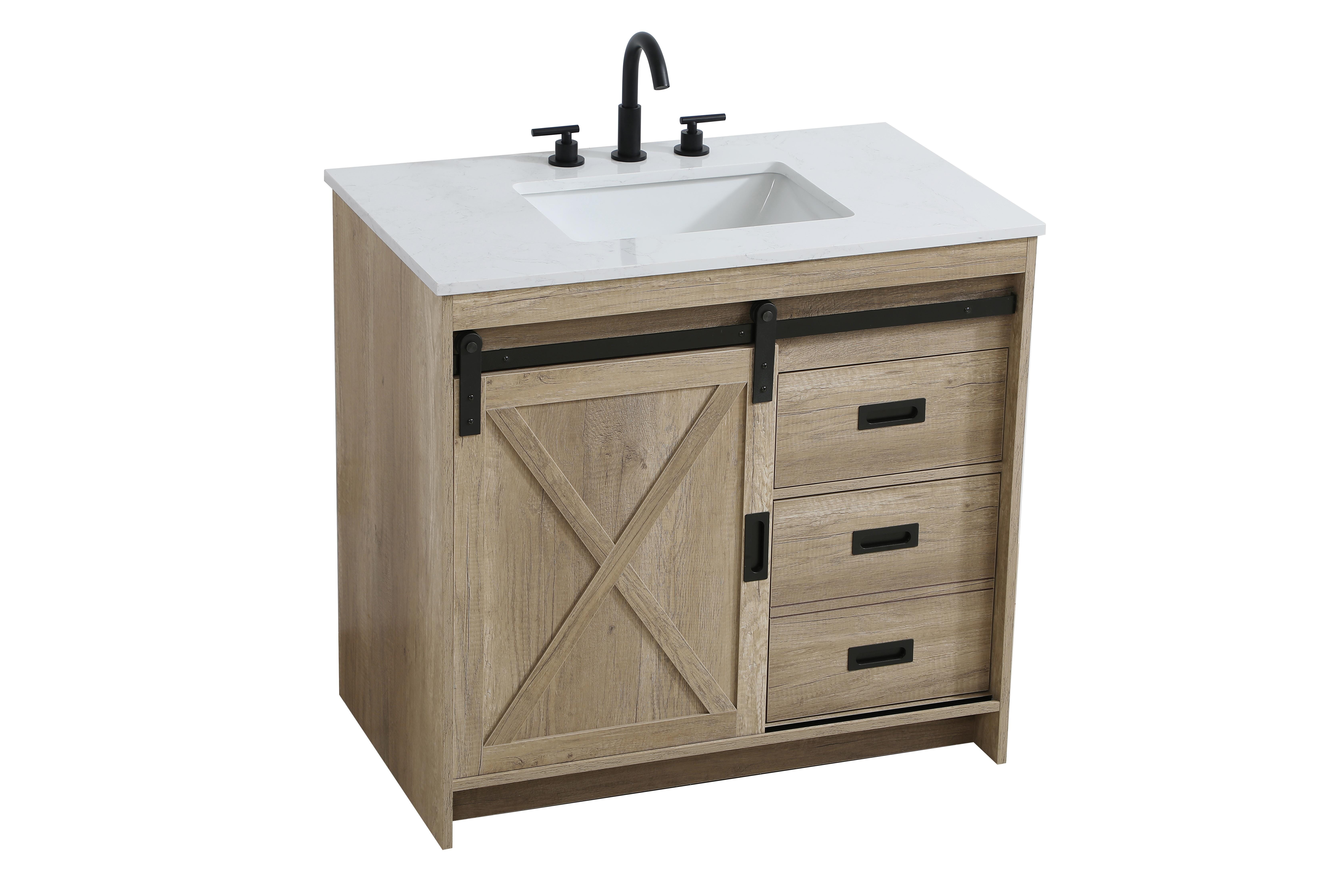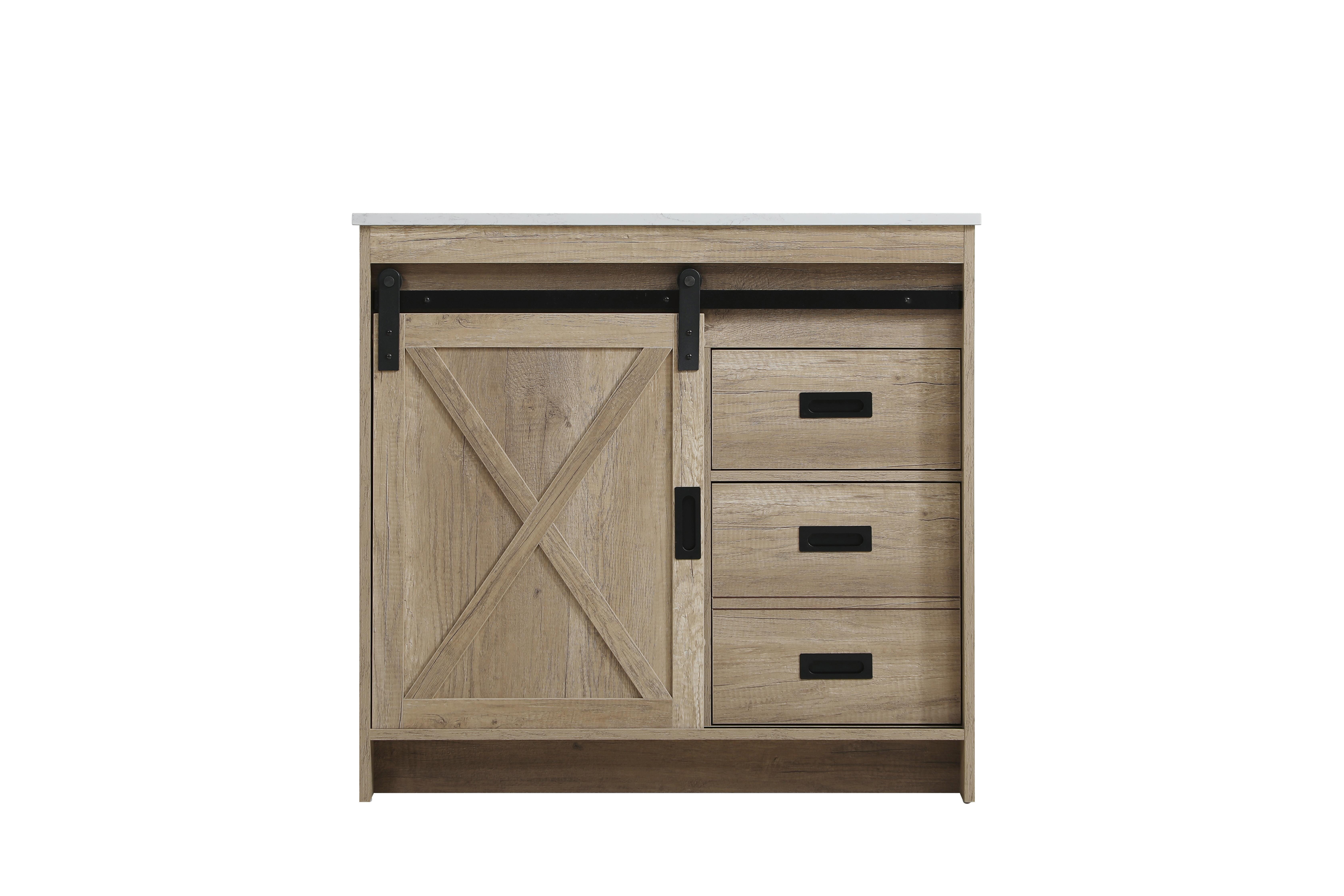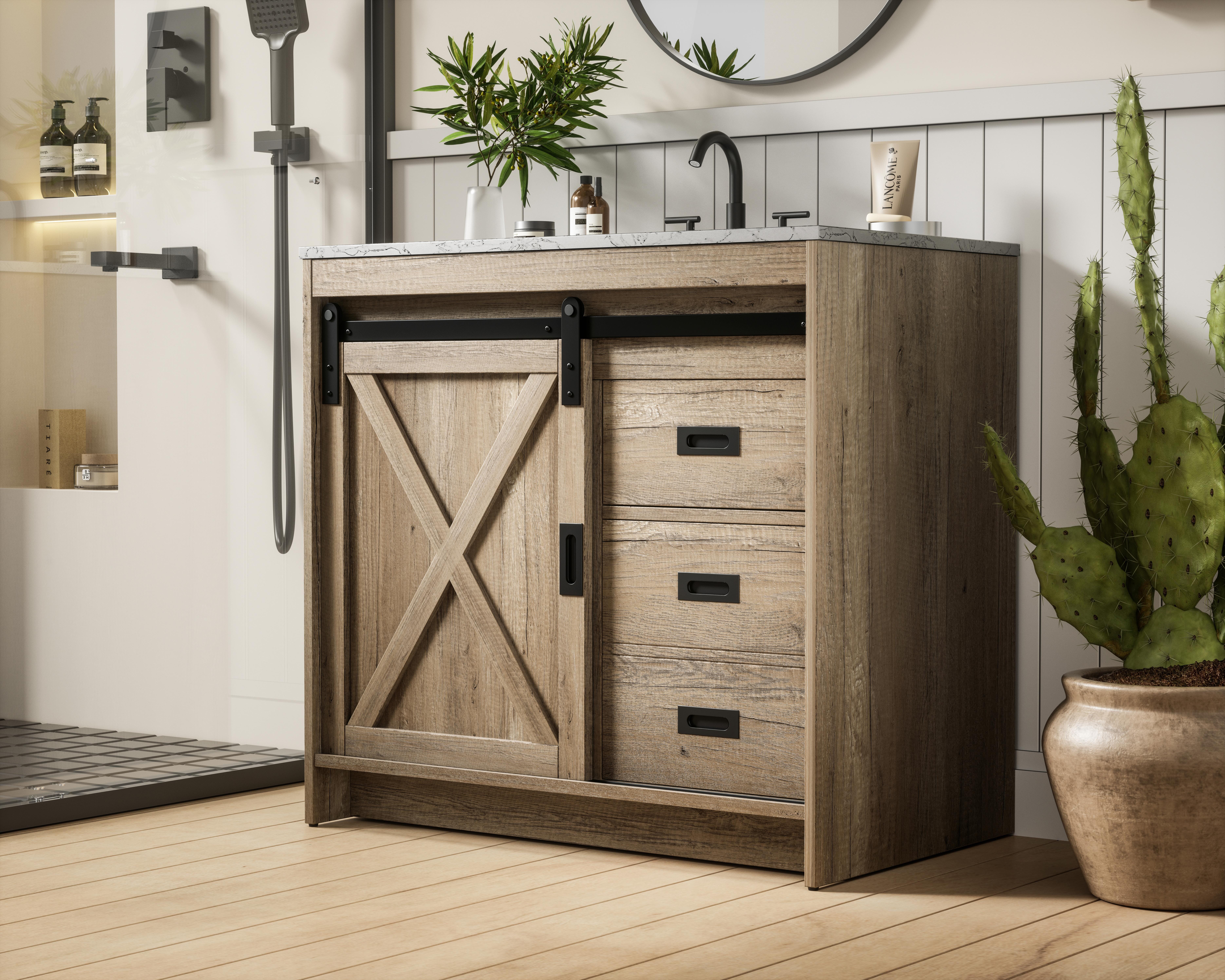 Transform your bathroom with this rustic barnyard-style vanity, designed to balance aesthetic appeal and functionality. Featuring a sliding barn door with black metal hardware and complementary handle pulls, this piece blends rugged charm with practical design. The engineered marble countertop displays unique marbling, while the porcelain undermount sink offers easy maintenance and durability. Available in Espresso, Natural Oak, and Rustic Grey finishes, this vanity suits a range of styles. It includes a deep storage drawer for larger items, a hidden shelf for towels or decor, and adjustable foot levelers for added stability on uneven floors. With pre-drilled faucet holes for easy setup, this vanity delivers style and substance to enhance your bathroom.