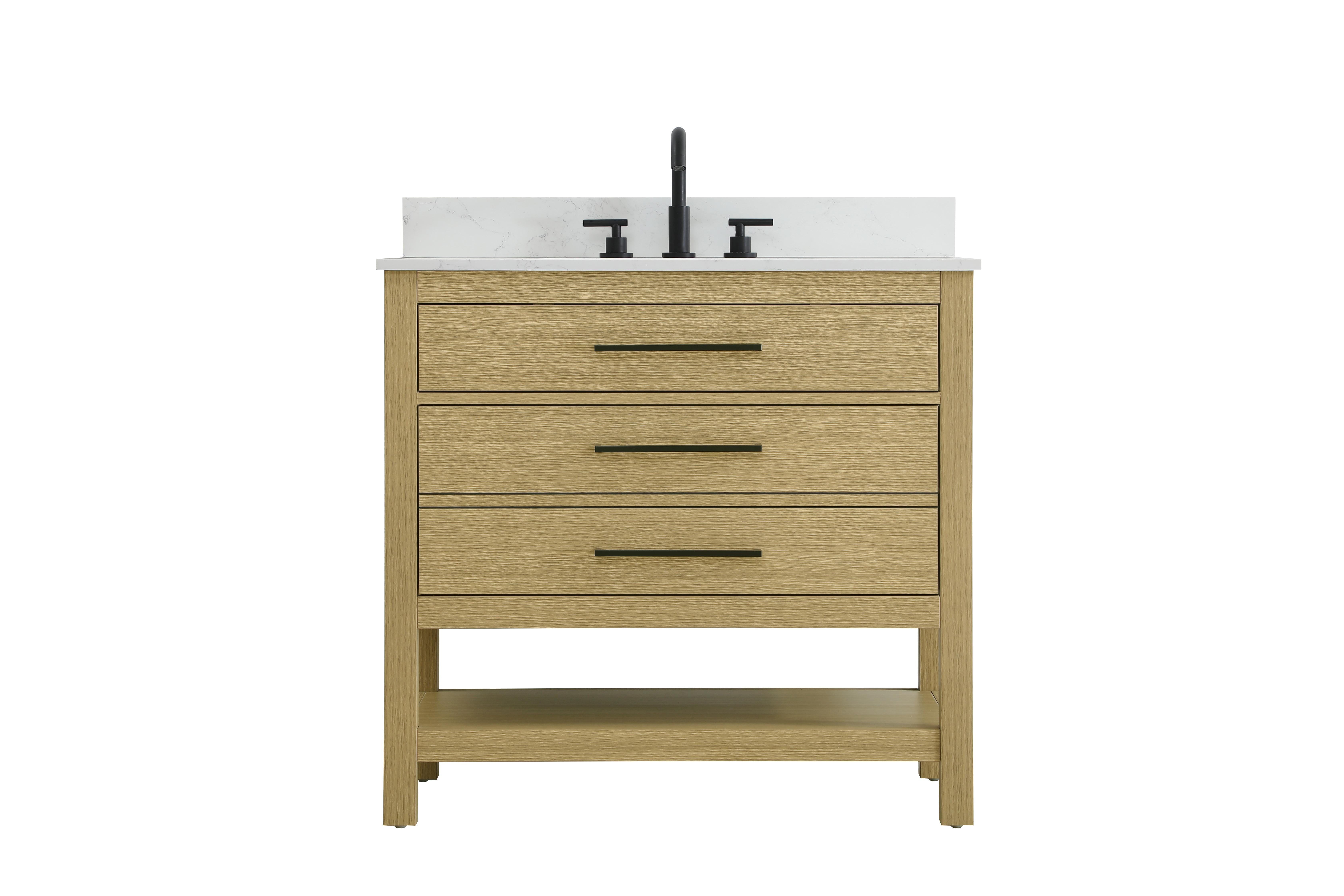 Elevate your bathroom design with this versatile and beautifully crafted bathroom vanity cabinet. The marble top features striking veining, adding a luxurious focal point to your space. Built from premium solid wood and MDF, it ensures long-lasting durability and strength. The porcelain sink, complete with a concealed overflow, offers a seamless and refined finish. Available in four stunning finishes Chestnut Brown, Honey Brown, Mocha Brown, and White - this vanity suits any interior style. Designed with convenience in mind, it features soft-closing drawers with modern handles and a tip-out drawer for easy access to small essentials, keeping your space tidy. The bottom deep drawer mimics the appearance of two separate drawers, providing ample storage for larger items, while the open shelf at the base offers additional storage space for towels or decor. Fully assembled for your convenience, it includes foot levelers for stability on any surface. For a complete look, pair it with an optional matching backsplash, sold separately. UPC certified for quality assurance, this vanity is the perfect combination of functionality, style, and ease of use.