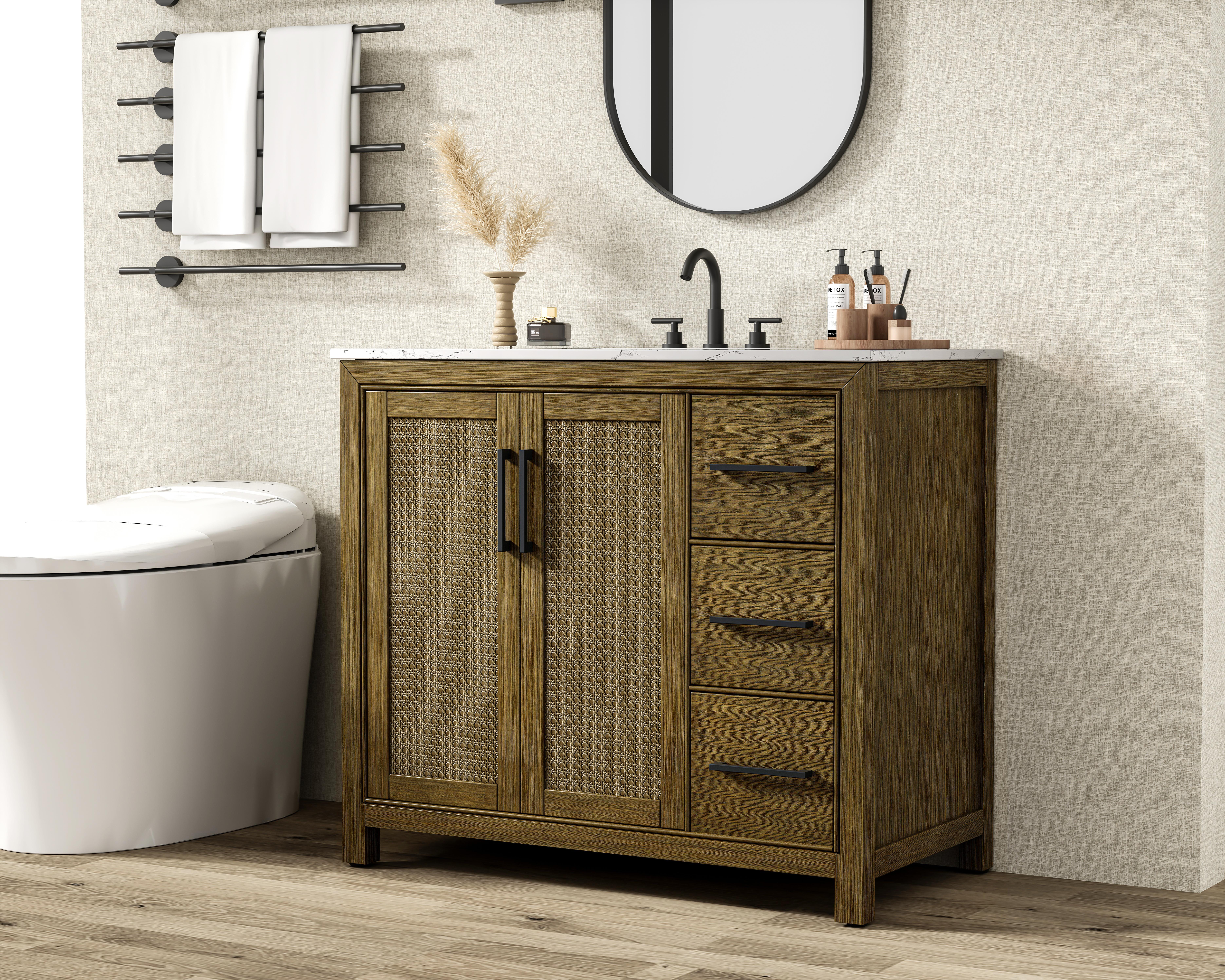 Perfect for those with an eye for detail and quality, this Modern Fitting transitional vanity blends modern design with timeless elegance. Available in five stunning finishes, from Crisp White to Linen Oak, the wood grain visuals of the oak options bring warmth and character to any bathroom. The caning design on the Shaker-style door panels adds texture and a touch of refinement, while the soft-closing doors ensure smooth, quiet functionality. Topped with a white marble countertop, the vanity offers both luxury and practicality, complete with pre-drilled faucet holes for customization. A concealed overflow and U-shaped shelf for plumbing make installation effortless, and the slender black metal pulls provide a sleek contrast.