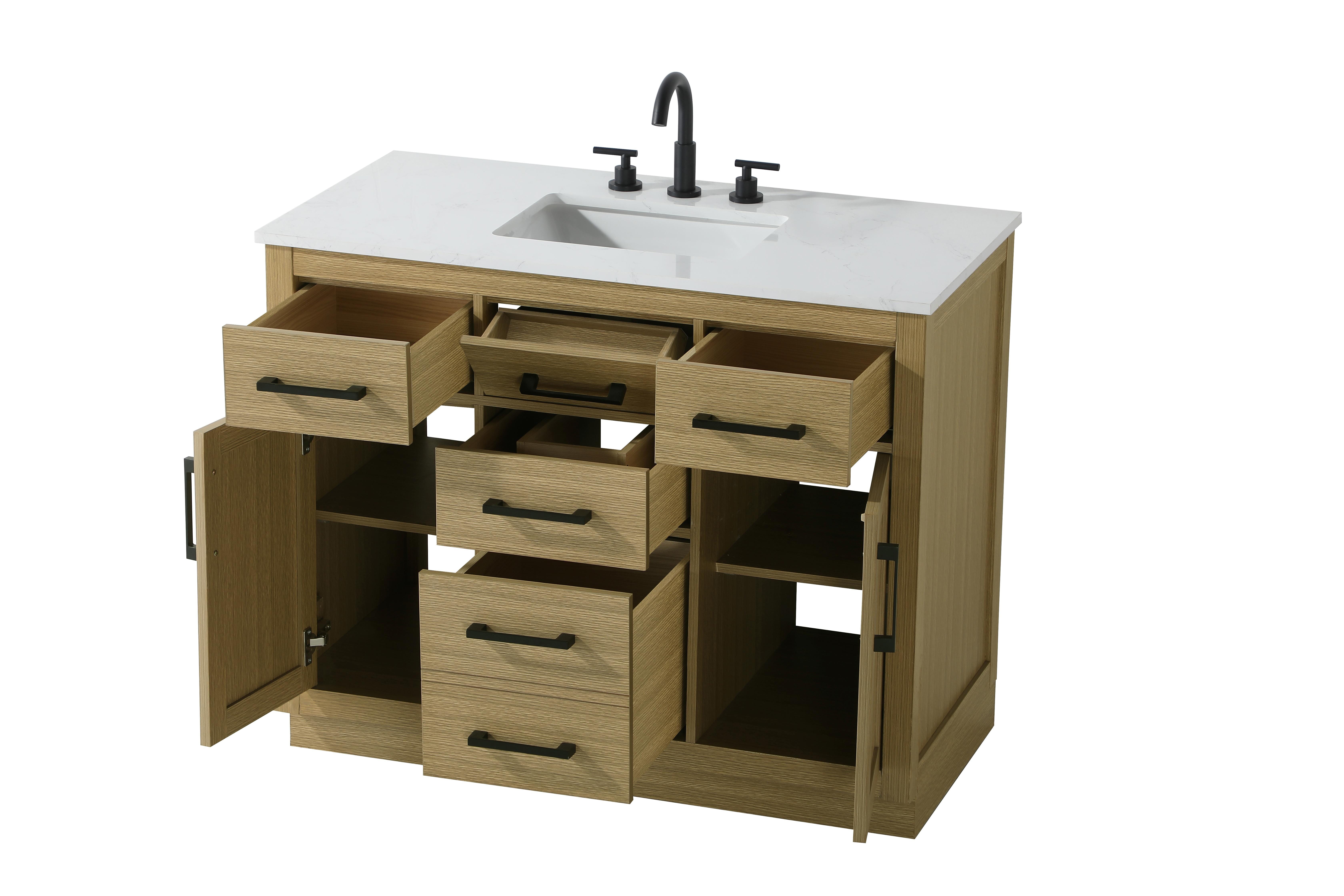 Introduce a perfect balance of functionality and style to your bathroom with this thoughtfully designed vanity. Constructed with a combination of solid wood and MDF, it offers durability and a sturdy build. The sleek engineered marble countertop with subtle grey marbling complements the rustic wood grain finish, creating a stylish and inviting centerpiece for your bathroom. Designed in a contemporary style with a transitional flair, it features a U-shaped shelf for seamless plumbing integration and multiple soft-close drawers for clutter-free organization. A pull-down drawer enhances convenience, while the toe kick adds a refined, clean-lined appearance and simplifies cleaning underneath. Matte black hardware contrasts beautifully with the cabinet finish, tying the look together. Delivered fully assembled and equipped with foot levelers, this vanity combines practicality and aesthetic appeal to suit modern and transitional bathrooms alike.