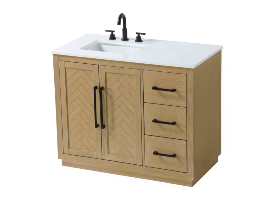 Each finish enhances the unique herringbone design on the Shaker-style door panels, adding a touch of craftsmanship and texture that elevates the overall design of the vanity.