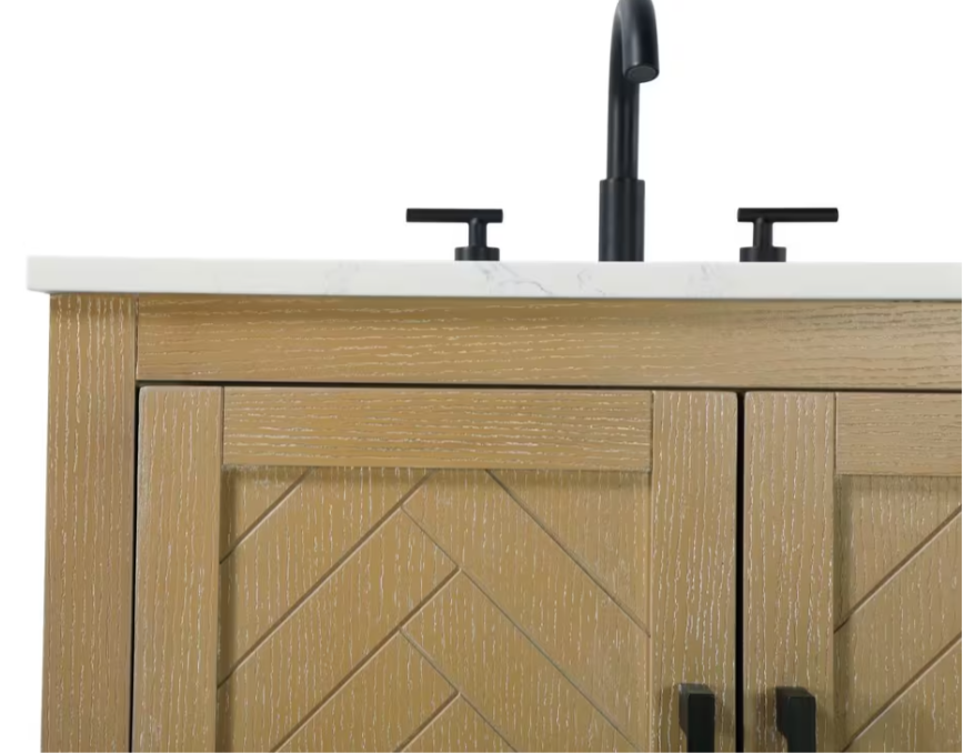 This Modern Fitting transitional bathroom vanity offers the perfect blend of timeless style and modern functionality. Available in five refined finishes-crisp white, sleek grey, chocolate oak, honey oak, and linen oak-it complements a range of decor styles, from classic to contemporary. The stunning herringbone design on the Shaker-style door panels adds texture and craftsmanship to the piece. Topped with a white marble countertop featuring subtle veining, it provides both beauty and durability. The long black metal pulls on the soft-closing doors add sleek, modern detailing. Practical features include a concealed overflow, a back panel cutout for easy plumbing installation, and a U-shaped cutout shelf to fit plumbing while maximizing storage space. With a toe kick all around the base, this vanity is thoughtfully designed to blend form and function in any bathroom setting.