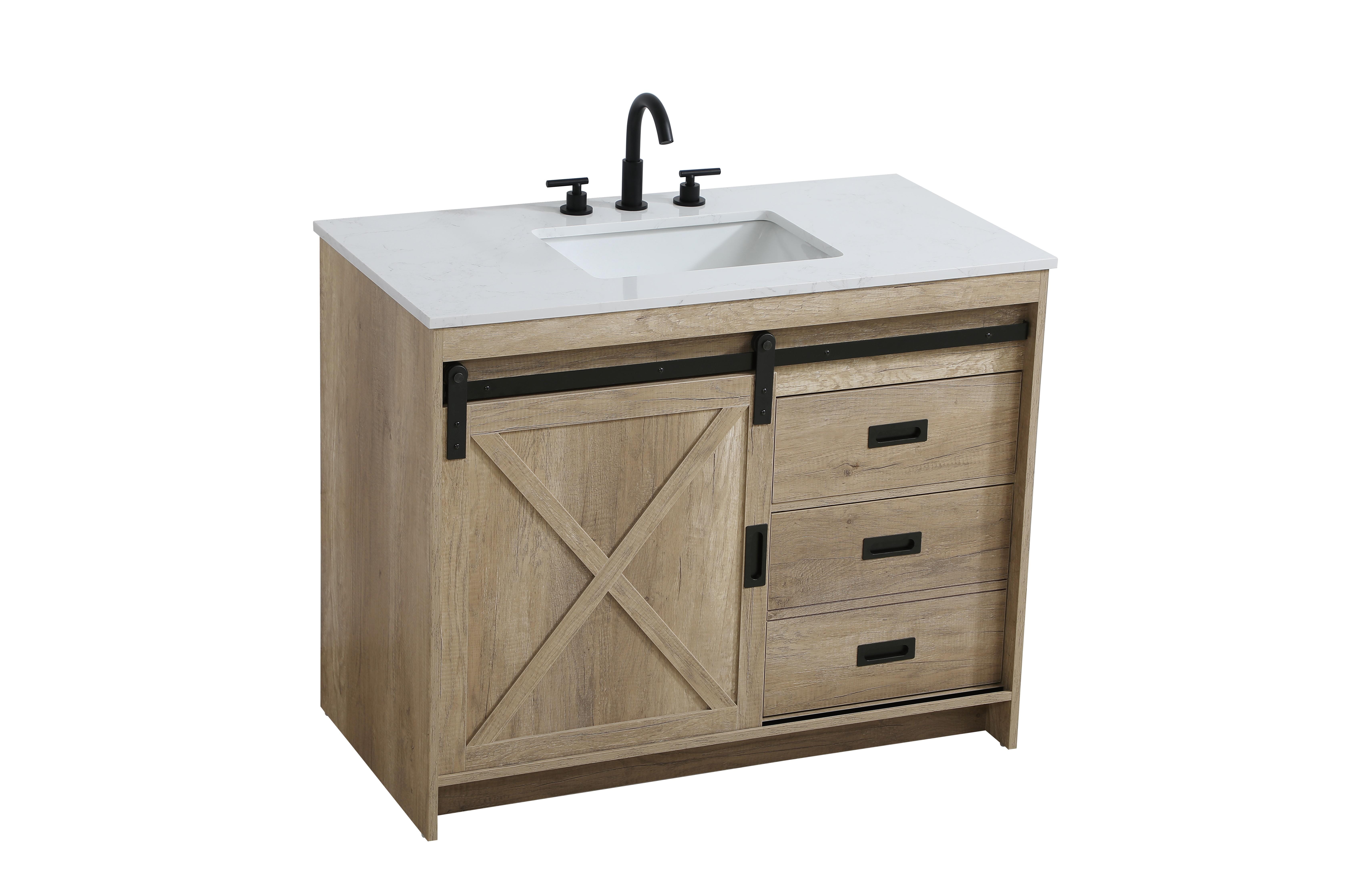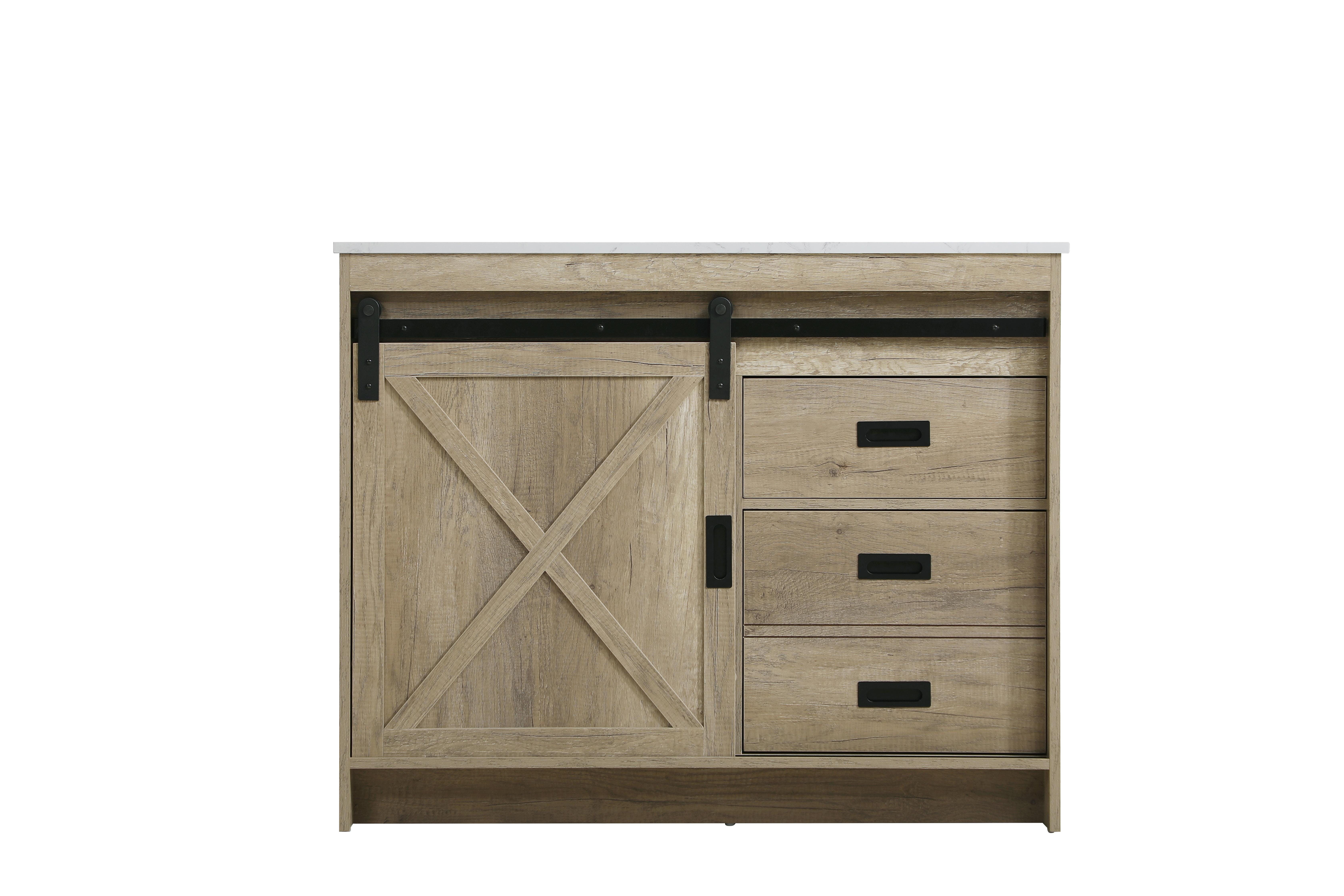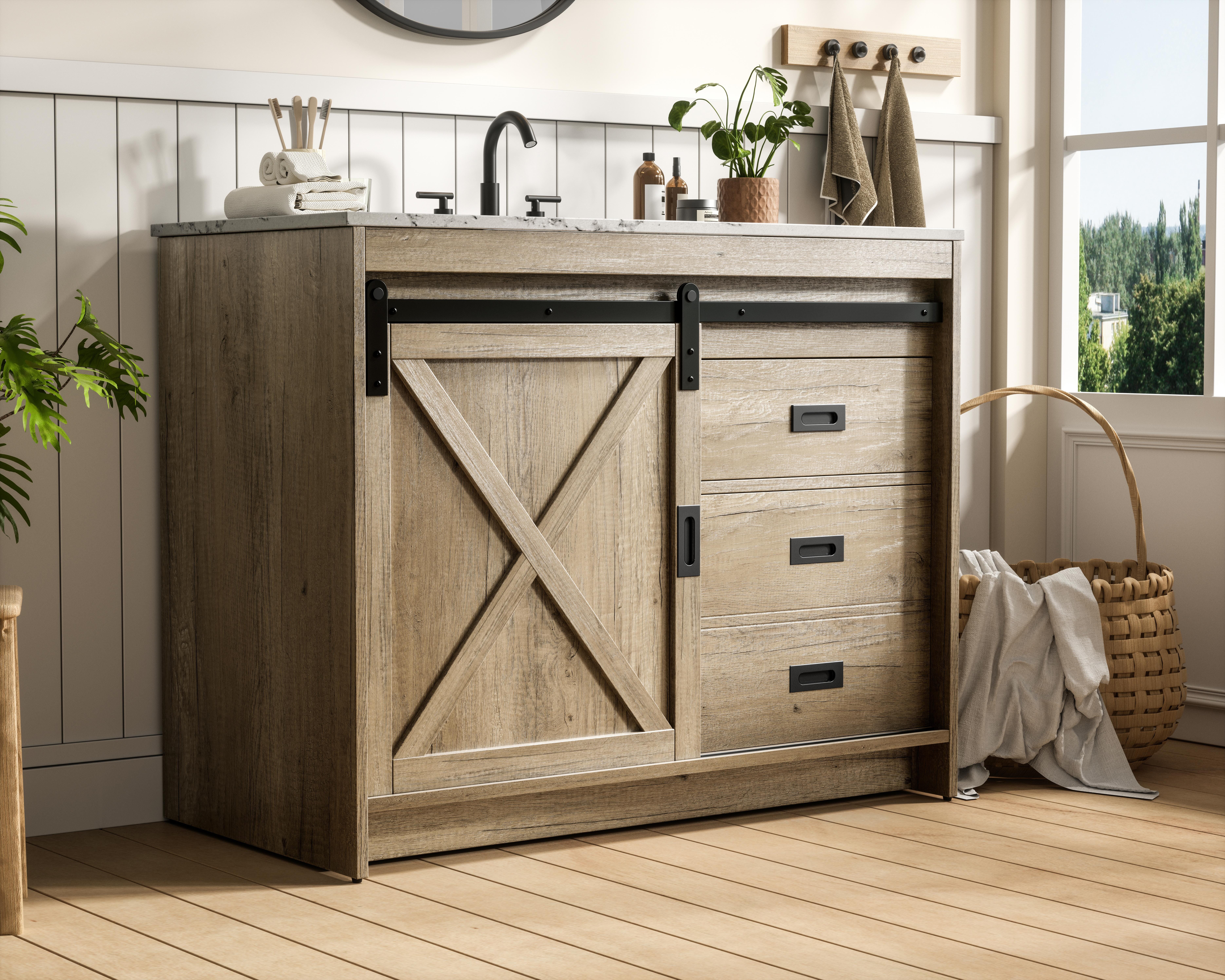 Transform your bathroom with this rustic barnyard-style vanity, designed to balance aesthetic appeal and functionality. Featuring a sliding barn door with black metal hardware and complementary handle pulls, this piece blends rugged charm with practical design. The engineered marble countertop displays unique marbling, while the porcelain undermount sink offers easy maintenance and durability. Available in Espresso, Natural Oak, and Rustic Grey finishes, this vanity suits a range of styles. It includes a deep storage drawer for larger items, a hidden shelf for towels or decor, and adjustable foot levelers for added stability on uneven floors. With pre-drilled faucet holes for easy setup, this vanity delivers style and substance to enhance your bathroom.