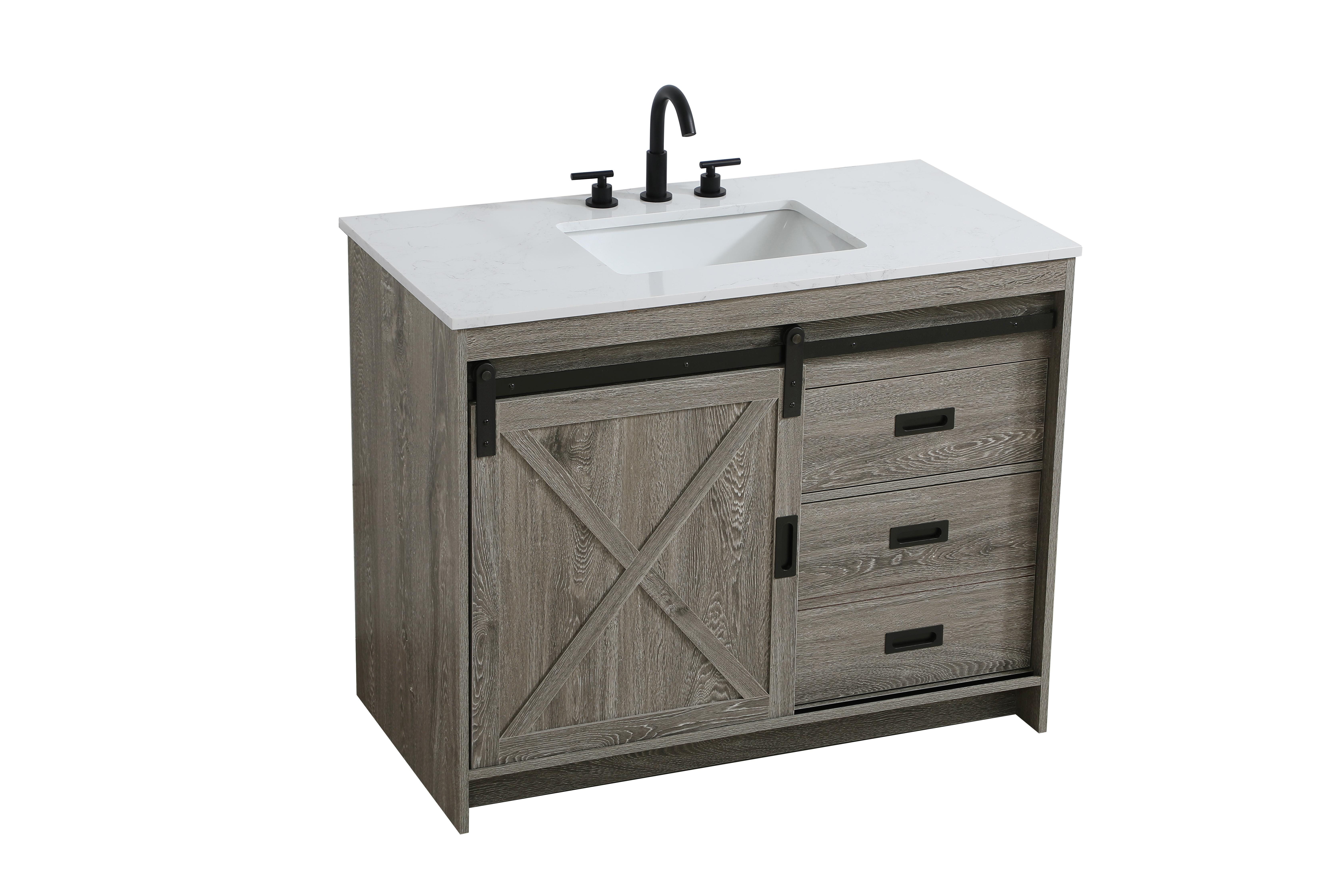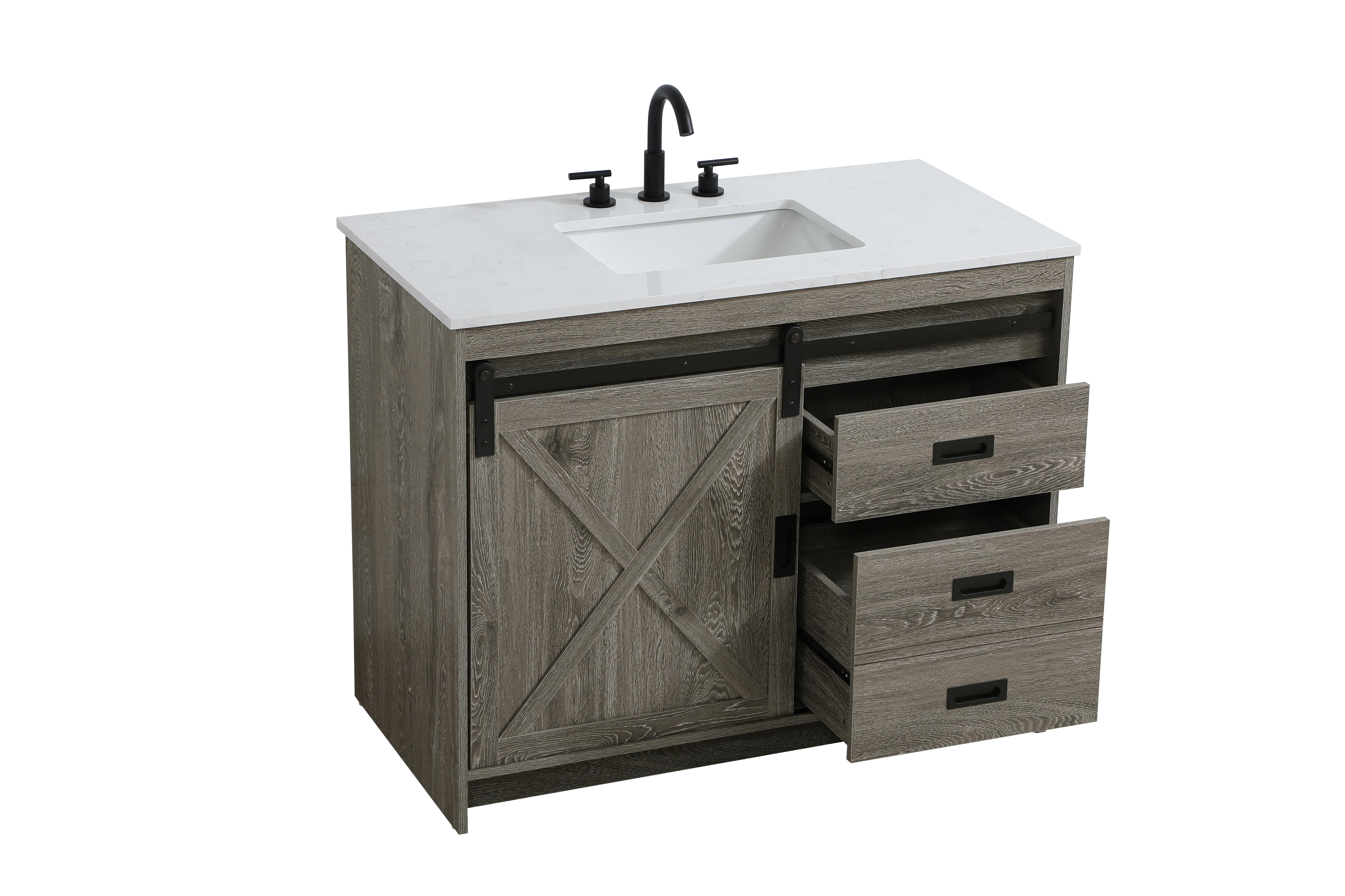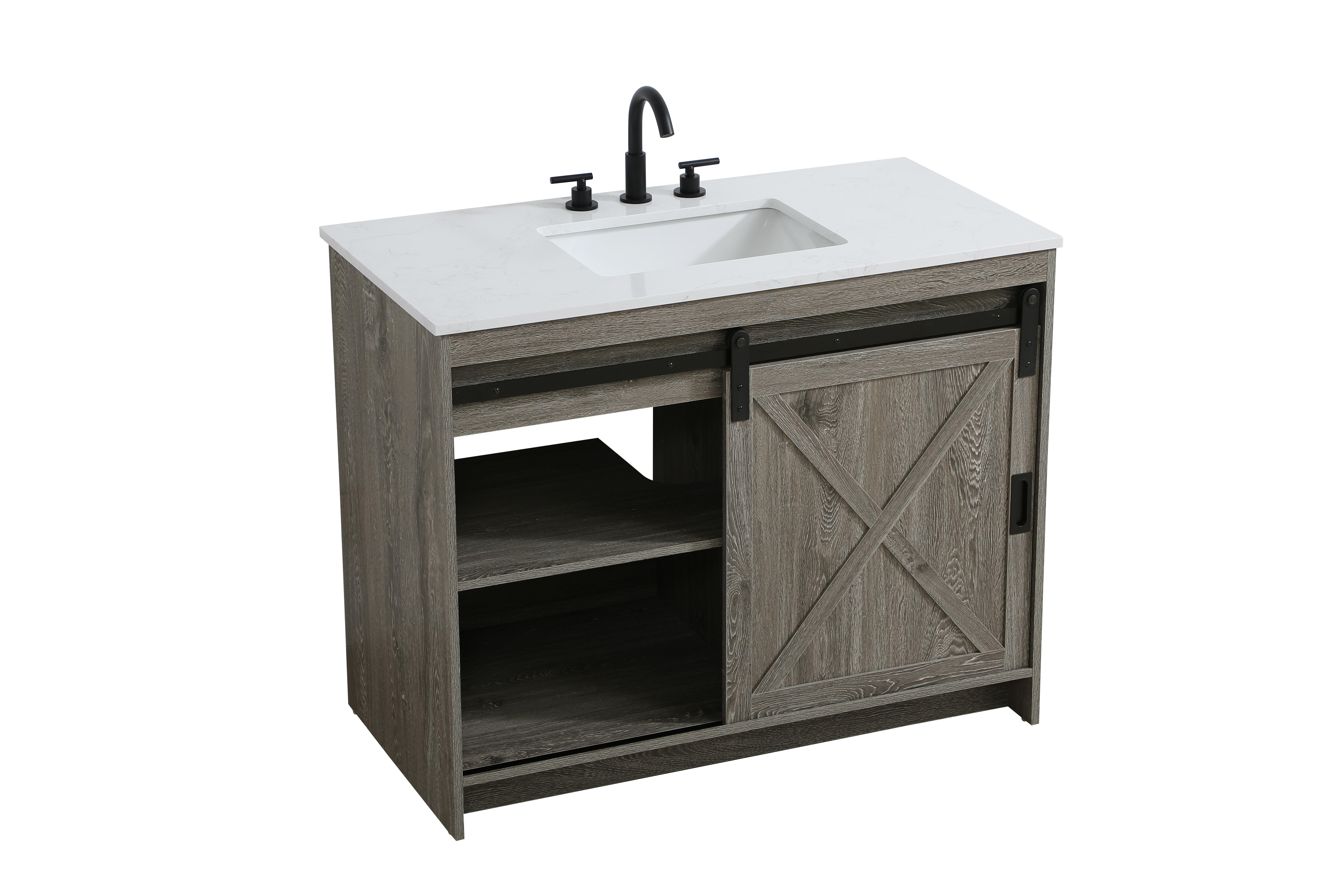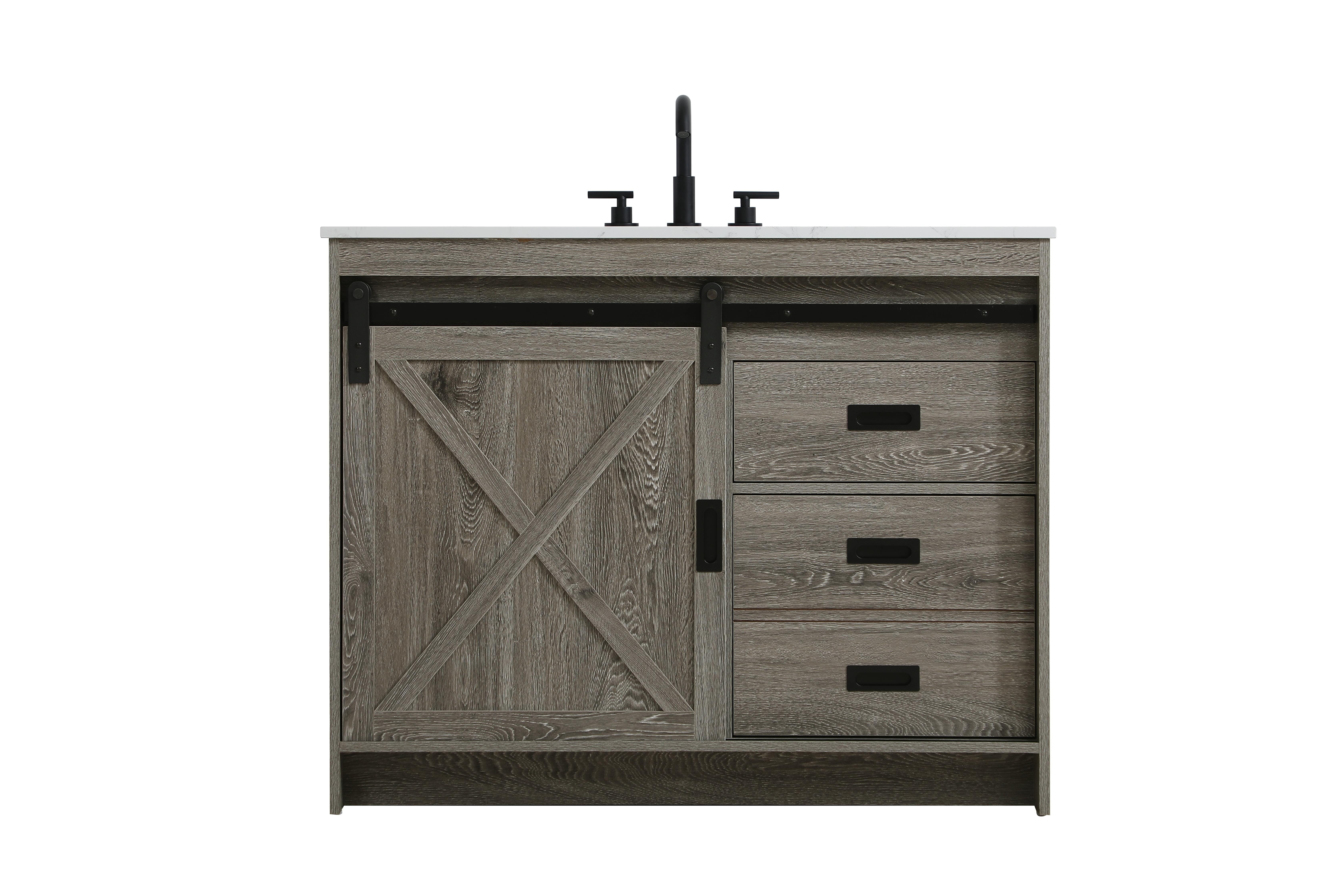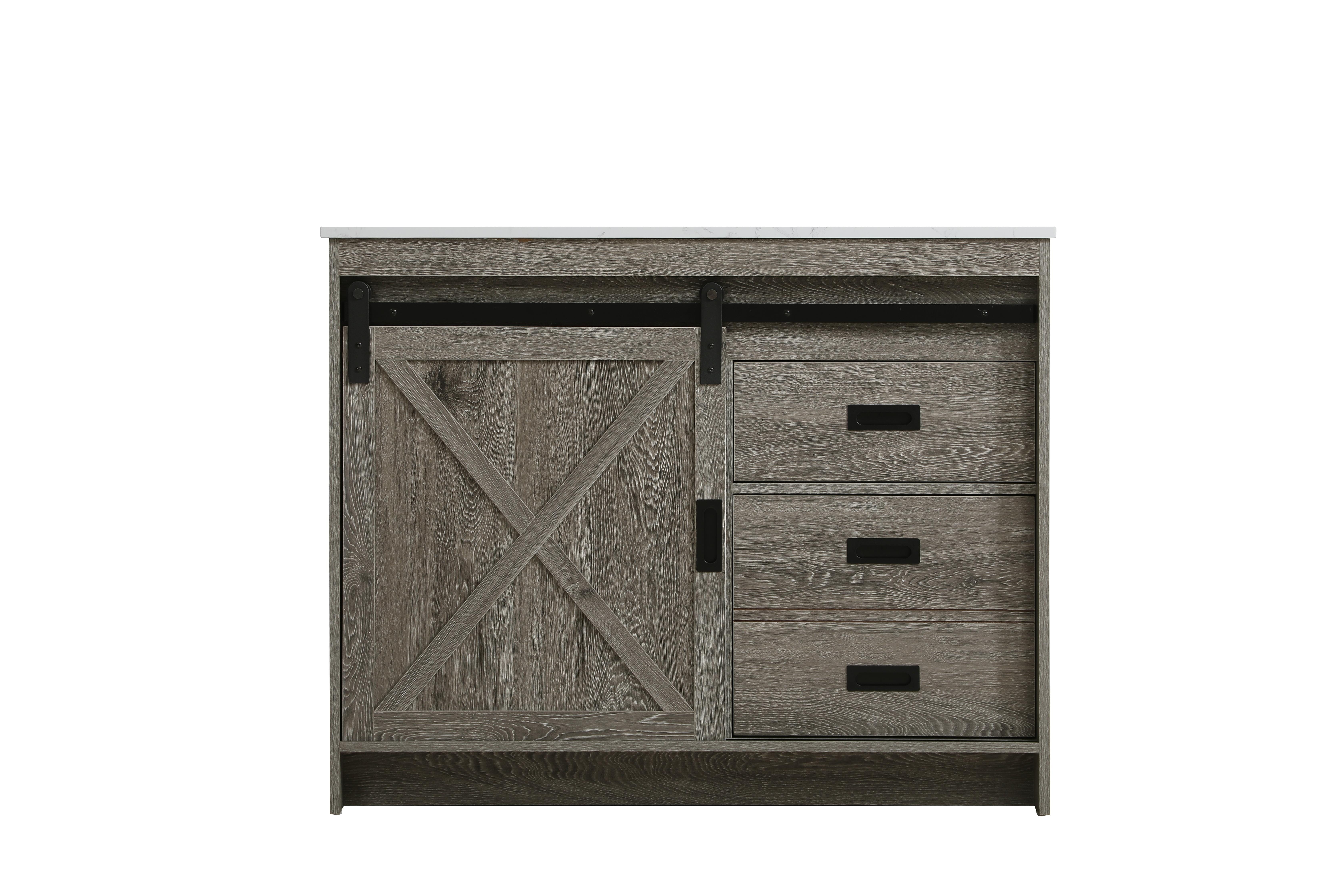 Transform your bathroom with this rustic barnyard-style vanity, designed to balance aesthetic appeal and functionality. Featuring a sliding barn door with black metal hardware and complementary handle pulls, this piece blends rugged charm with practical design. The engineered marble countertop displays unique marbling, while the porcelain undermount sink offers easy maintenance and durability. Available in Espresso, Natural Oak, and Rustic Grey finishes, this vanity suits a range of styles. It includes a deep storage drawer for larger items, a hidden shelf for towels or decor, and adjustable foot levelers for added stability on uneven floors. With pre-drilled faucet holes for easy setup, this vanity delivers style and substance to enhance your bathroom.